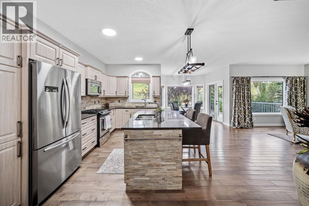 In Gleneagles — one of Cochrane’s most adored communities — families choose this neighbourhood for the quiet streets, mountain views, and excellent school access. Glenbow Elementary, École Manachaban Middle School, and Cochrane High School (your designated catchment) are all close by, making daily life easy and connected for kids of all ages.Set against the backdrop of the Rockies, this move-in-ready home offers immediate possession and over 2,500 sq.ft. of refreshed, comfortable living. The exterior of the home has been virtually painted to give you an idea of what you can easily do to the home. From the moment you arrive, the wide driveway, double garage, and sunny front balcony create a warm first impression — the kind that tells you there’s room here for family, guests, and life as it grows.Inside, everything feels new again. Fresh paint, brand-new carpet, hardwood floors, and updated fixtures give each room a clean and inviting feel. The main floor centres around a bright, functional kitchen with granite counters, a full-height stone backsplash, a large island with prep sink, and a custom bar nook that easily becomes the morning coffee spot or evening wind-down space. Oversized windows fill the main level with natural light, while the living room fireplace adds a sense of comfort that anchors the home.Step outside and the lifestyle expands. A private, two-tier deck overlooks mature landscaping and open green space, creating an ideal backdrop for BBQs, family gatherings, or quiet evenings outdoors. Kids will love the hidden park just beyond the yard — a safe, car-free shortcut to hours of play.Upstairs, a west-facing bonus room offers access to the front balcony, giving you sunrise coffees and sunset views over the valley. Four bedrooms complete the upper level, including a peaceful primary suite with French doors, a second fireplace, a jetted tub, dual sinks, and a walk-in shower.The lower level is ready for future plans with a framed bedroom, cold storage , rough-ins for a wet bar, additional laundry, and a roughed-in bathroom with the tub already installed.But the true standout is the comfort behind the walls. A whole-home boiler system provides in-floor heating across every level — even the garage — with 17 individual heating zones. The boiler, manifold, and automated controls were fully replaced in 2022, delivering even temperatures, warm floors, and noticeably lower monthly bills. A professional-grade HRV system keeps air fresh year-round, and the heated garage includes two plumbed floor drains tied to town sewer for effortless winter living.Surrounded by pathways, parks, and breathtaking views, this home brings together efficiency, warmth, and family-friendly living — all in one of Cochrane’s most scenic and school-rich neighbourhoods. It’s more than a house. It’s the beginning of a lifestyle that feels easy, elevated, and ready the moment you arrive. (id:6769