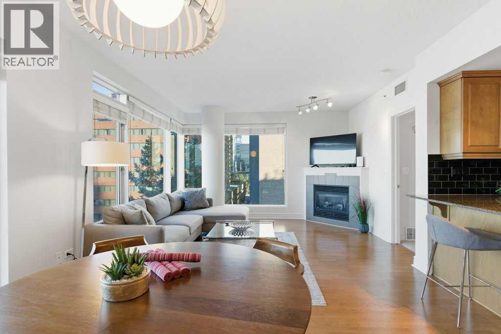 Urban Living at Its Best — Fully Furnished Executive Suite at Five West II. Unit can also be purchased without furniture. Experience luxury downtown living without the luxury price tag. This stylish, fully furnished 8th-floor executive suite in Five West Phase II delivers unbeatable river and city views — including the Bow River, Peace Bridge, and Kensington — by day and by night. The smart open-concept layout is designed for real life in the city. Host friends comfortably, work from home, or enjoy a cozy night in front of the gas fireplace with your favorite wine. Floor-to-ceiling windows flood the living and dining area with natural light, highlighting the sleek kitchen featuring Legacy cabinetry, granite counters, and stainless steel appliances. The spacious primary suite offers room for a king-size bed, a walk-in closet, and a private ensuite with modern finishing. A generous second bedroom with a cheater ensuite is perfect for guests or a home office. You’ll love the thoughtful extras too — front entry work-nook or storage option, in-suite laundry, air conditioning, and laminate flooring throughout. Titled underground heated parking + storage locker. Five West II brings elevated amenities to your doorstep, including a residents’ lounge with billiards and full kitchen, outdoor terrace, car wash bay, and full-time concierge service. Step outside and you’re moments from the Bow River pathways, Prince’s Island Park, top-tier dining, boutique shopping, transit, and downtown energy. This turnkey suite shows beautifully and offers the ultimate downtown lifestyle — views, convenience, comfort, and sophistication. Move in and start living your best city life. (id:6769