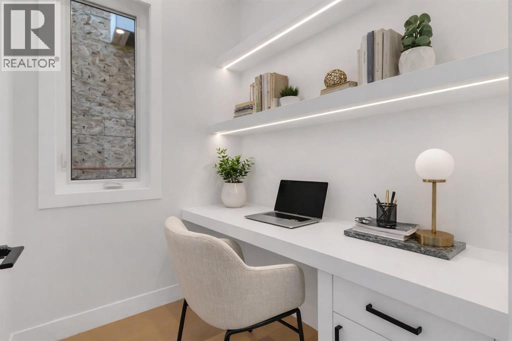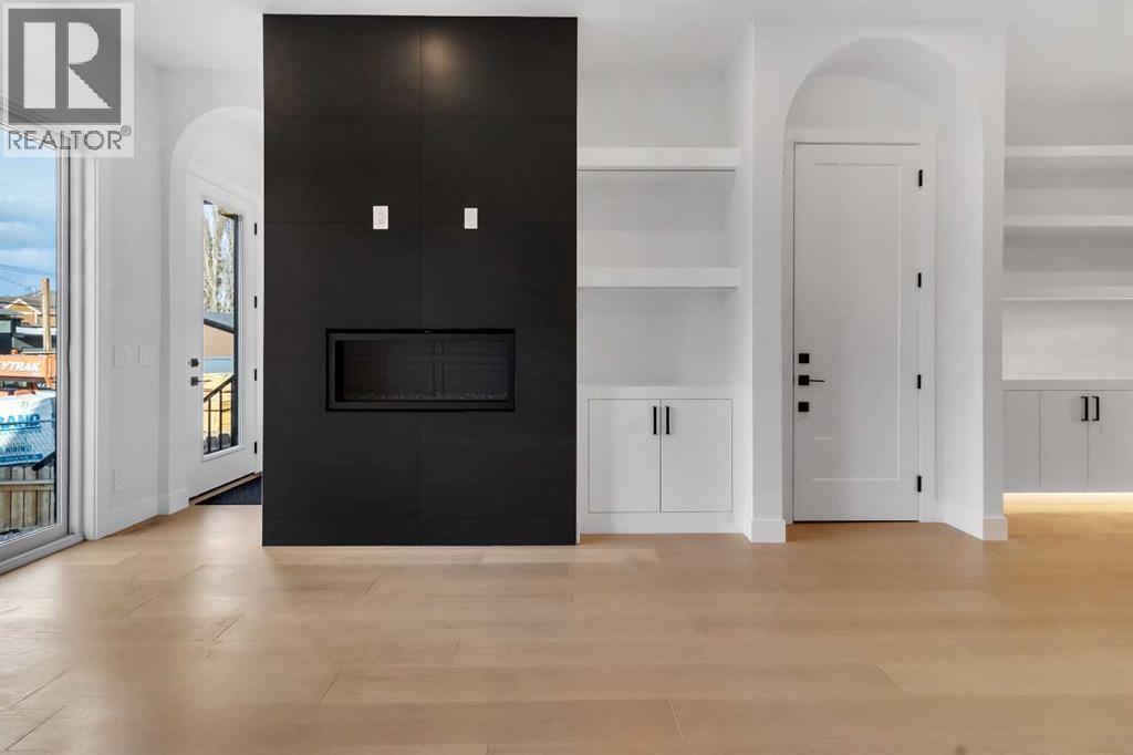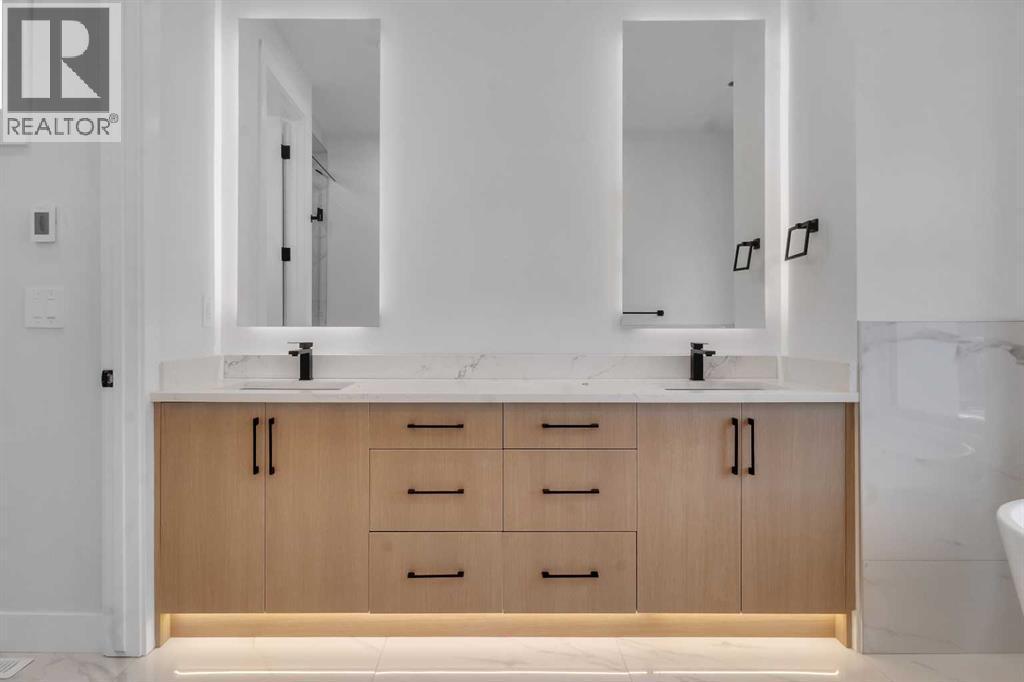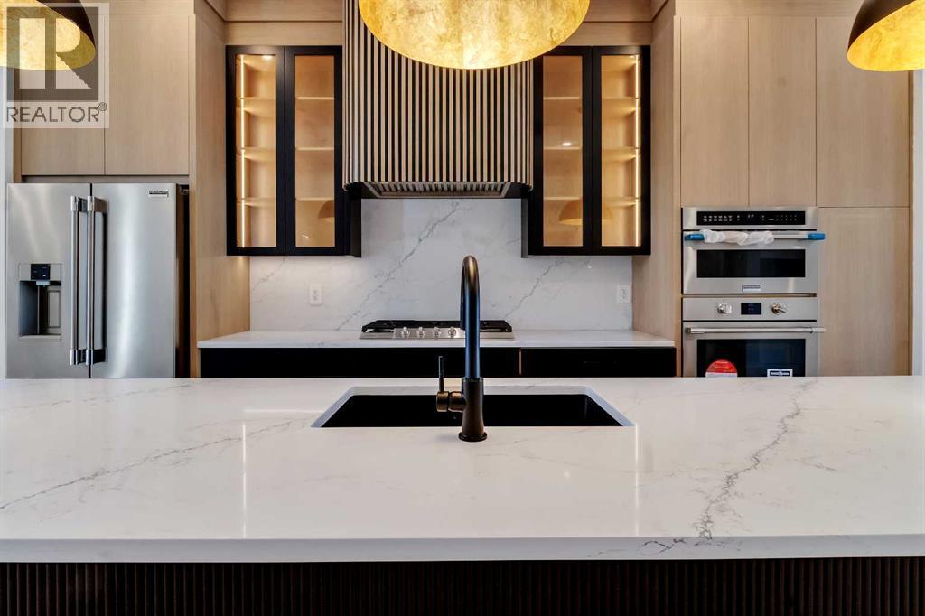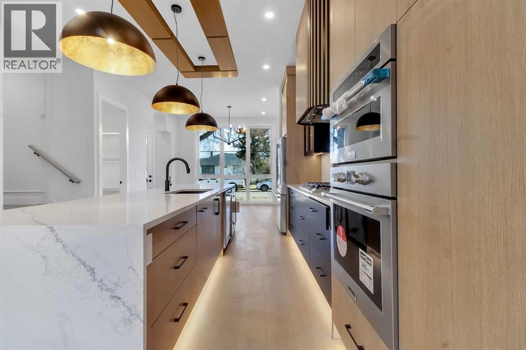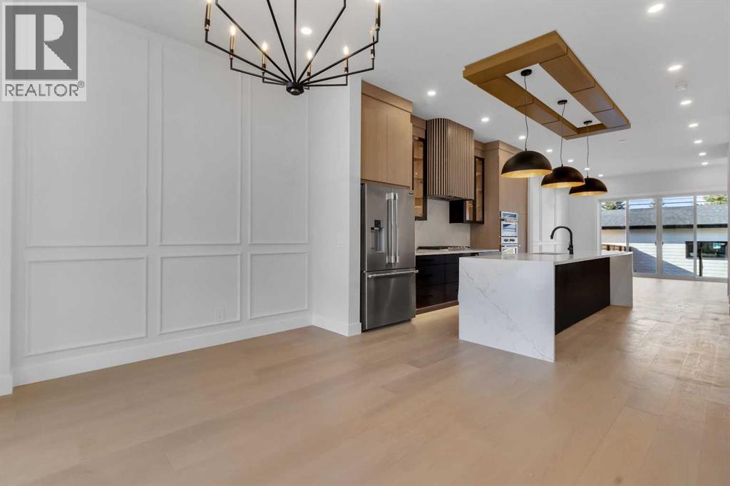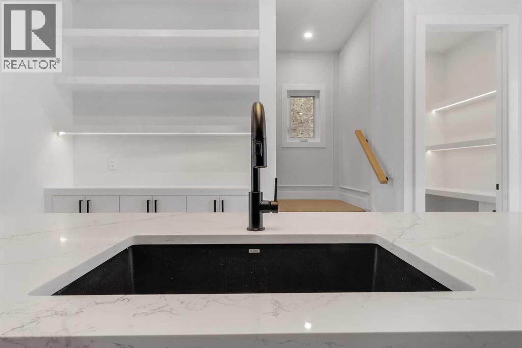 Welcome to this brand new, meticulously crafted luxury infill by Moon Homes, located on a quiet, tree lined street in the heart of Mount Pleasant. Thoughtfully designed across all three levels, this five bedroom residence offers refined craftsmanship, elegant architectural detailing, and exceptional functionality just steps from Confederation Park and minutes to downtown.The main floor features soaring 10 foot ceilings, rich hardwood flooring, oversized windows, and custom millwork throughout. A grand arched front entry opens to a spacious foyer, setting the tone for the timeless interior. The open concept layout blends classic elegance with modern design. The dining area is highlighted by a designer chandelier, while the living room centers around a beautifully tiled gas fireplace. Large sliding patio doors open to a rear concrete patio, creating seamless indoor outdoor living.The chef inspired kitchen is a true showpiece, featuring a massive quartz island, built in Frigidaire Professional Series appliances, a custom slat hood fan, bar fridge, and extensive full height cabinetry with pull out storage. Integrated LED lighting throughout the kitchen, including toe kick, under cabinet, floating shelf, and glass front upper lighting, adds both function and ambiance. A dedicated home office with a built in desk and under lit floating shelves is positioned near the entry. At the rear, a well designed mudroom with bench seating and coat hooks leads to a stylish powder room with a floating vanity and pendant lighting.Upstairs, wainscoting continues along the staircase into a bright hallway filled with natural light. The primary retreat showcases nearly 15 foot vaulted ceilings, plush carpeting, a striking chandelier, a full wainscoted feature wall, and three upper transom windows. The walk in closet includes custom shelving with pull outs and motion sensor LED lighting. The spa inspired ensuite offers heated tile floors, dual vanities, a freestanding soaker tub, a ti led rainfall shower with bench, ambient lighting, and a private toilet area.Two additional bedrooms each feature walk in closets and share a beautifully finished four piece bathroom. The upper laundry room includes LG appliances, folding counter, deep sink, cabinetry, and linen storage conveniently located near the bedrooms. The fully finished two bedroom legal basement suite (pending final inspection), includes a private side entrance and mirrors the quality of the main home. It offers a full kitchen, spacious living area, modern four piece bathroom, and dedicated laundry with a built in sink, making it ideal for extended family, guests, or future rental income. Finished with a detached double garage and paved alley access, this home is surrounded by top rated schools, parks, Mount Pleasant Pool, and everyday amenities, with quick access to major routes and the city core. A rare opportunity to own a truly refined, brand new luxury residence in one of Calgary’s most sought after communities. (id:6769