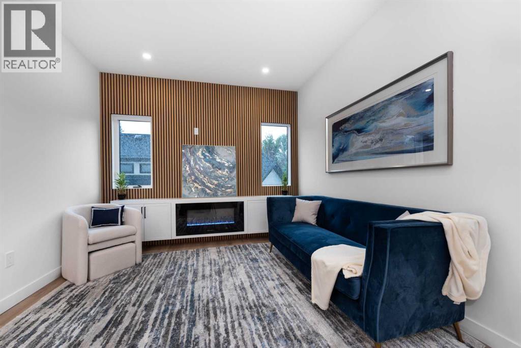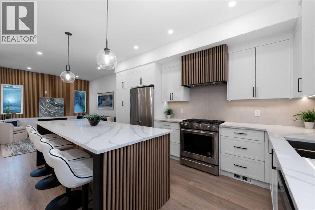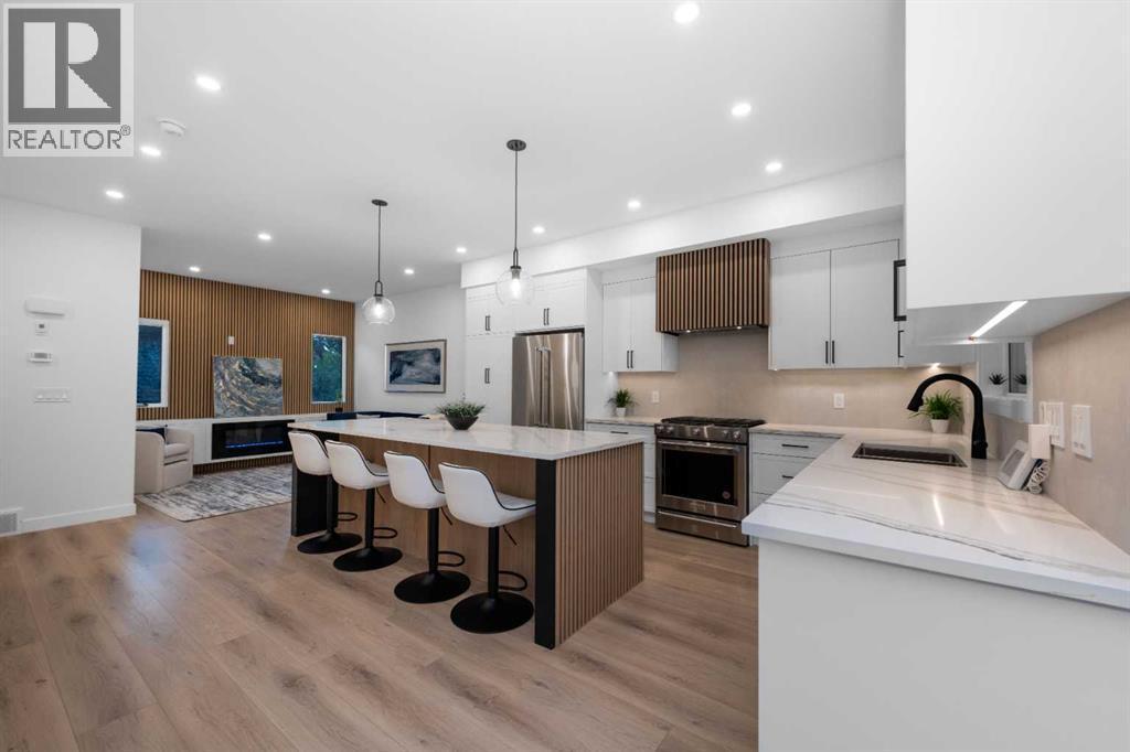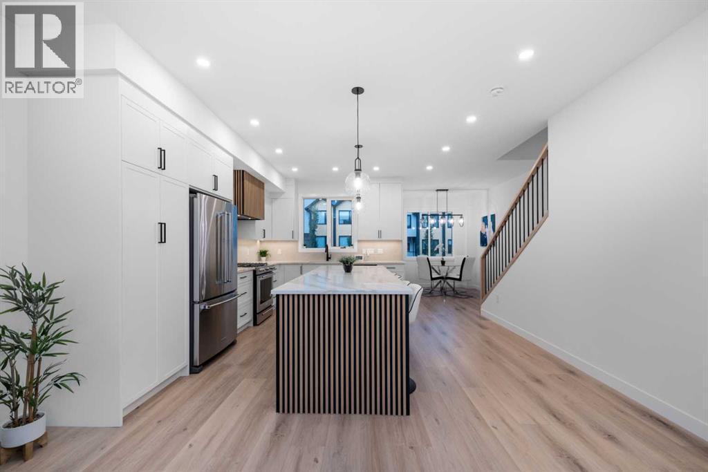 READY TO MOVE IN, BRAND NEW. The Opal on Westmount – Redefining luxury living in West Hillhurst. A modern contemporary 3-story row home just steps from shops and cafés, the Bow River pathway, and the vibrant amenities of Kensington. Designed for those who value elegance, functionality, and convenience, The Opal on Westmount offers a lifestyle that’s deeply connected to nature and city life, all within walking distance to great schools, churches, and outdoor recreational spaces. Situated on the corner of 23 Street and Kensington Road, this home offers unmatched convenience with quick access to downtown, Memorial Drive, and Crowchild Trail. Spanning 1,746 square feet of living space, this townhome is meticulously designed to accommodate active and professional lifestyles. The entry level features a versatile flex room with access to the garage and backyard storage; ideal for a home gym or storing bicycles, skies, and sporting equipment. The main floor has an open-concept layout, starting with a beautiful open living room that features an electric fireplace and wood slate acoustic feature wall. Beside that is a luxurious powder room draped in wallpaper. The gourmet kitchen is designed for entertaining with an unobstructed 9 ft island that can easily seat 4, shaker-style cabinets, a custom wood-slate hood fan, upgraded kitchen aid appliances, a gas range, double sized pantry, and an east facing sink that looks out the window towards the city skyline. Lastly, the main floor features a spacious dining area leading to a private 70 sq ft balcony that has a gas line perfect for a BBQ set up. The top floor is designed for comfort. The primary bedroom has a vaulted ceiling and features the custom wood slate panelling that is used throughout the home. A walk-in closet is hidden behind a pocket door, while the 4-piece ensuite boasts a standing shower and double sinks on an 7 ft vanity, with custom double mirrors on a upgraded wallpaper. Two additional well-sized bedrooms, a 4- piece main bathroom, and a convenient top-floor laundry complete the space. Throughout the home, contemporary finishes and premium materials add a touch of understated elegance. Sustainability meets convenience as the home is fully roughed-in for solar panelling and electrical vehicle charging, providing future-forward solutions for today’s homeowners. Outside, the low-maintenance landscaping is practical as it is beautiful. Move in ready! Book your private showing today. (id:6769