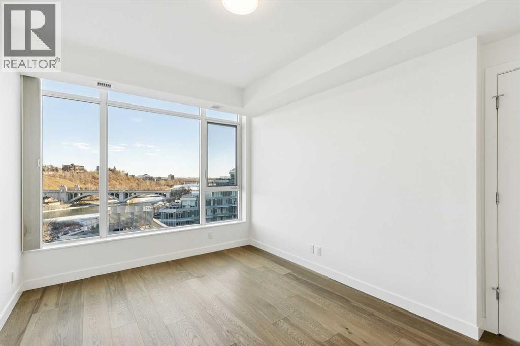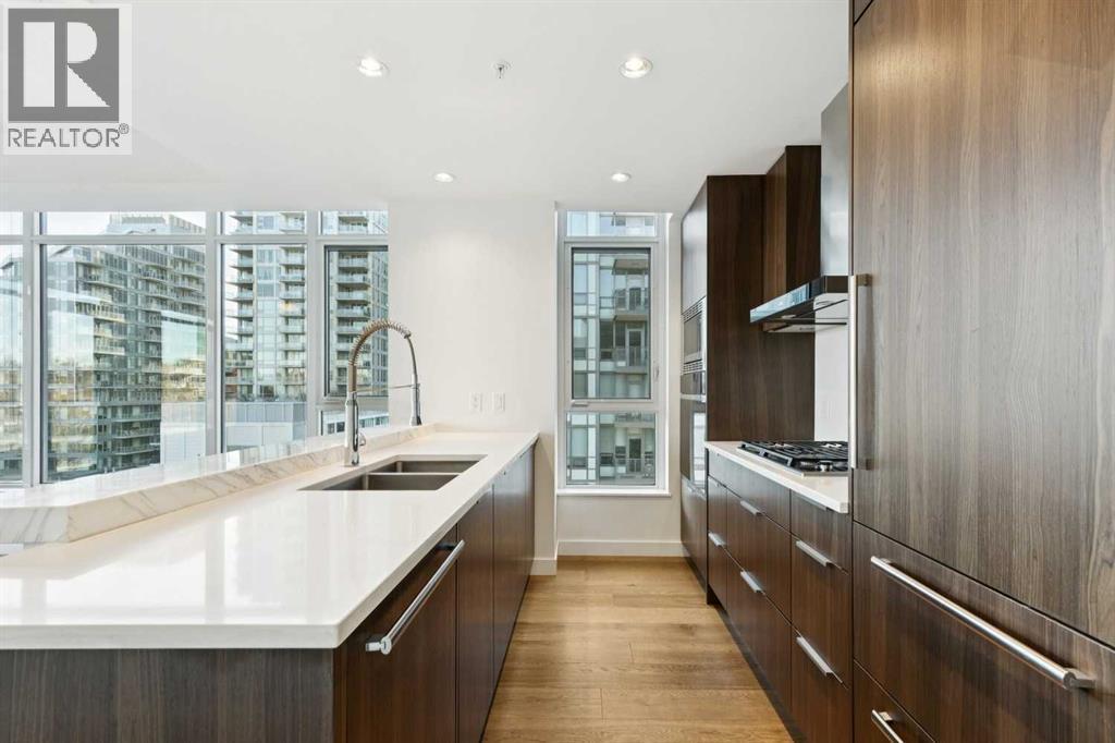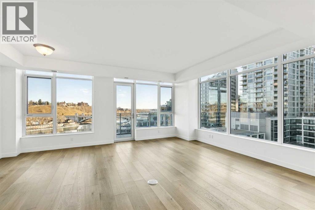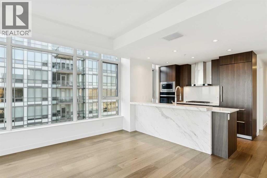With spectacular, unobstructed views of the Centre Street Bridge, Prince’s Island Park, and the Bow River valley, this stunning two bedroom unit offers one of the most iconic outlooks in the city. With the land in front already developed, the breathtaking views are securely protected. Floor-to-ceiling corner windows flood the apartment with natural light, enhancing the thoughtful two-bedroom, two-bathroom layout, ideal for comfortable living for one or two. The expansive living area opens to a private balcony where river, park, and city views take centre stage. Wide-plank, light-toned laminate flooring runs throughout, complemented by freshly painted interiors and sophisticated, timeless finishes. The contemporary kitchen is both elegant and highly functional, featuring premium appliances including a Wolf gas cooktop and wall oven, integrated Sub-Zero refrigerator, panelled Asko dishwasher, quartz countertops, a marble breakfast bar, ample storage, and a full pantry. The primary bedroom offers a generous walk-in closet and a beautifully appointed ensuite with dual sinks, marble counters, a soaker tub, and a large shower. The second bedroom is well-sized with a window overlooking the city centre and located across from a full bathroom. Additional features include in-suite laundry with folding counter and storage, two assigned underground parking stalls, and a separate storage locker. Building amenities include a well-equipped fitness centre, bike storage, Concierge services and a car wash bay. Steps to river pathways, Prince’s Island Park, the Peace Bridge, downtown, top restaurants, and year-round festivals - this is exceptional inner-city living. (id:6769
