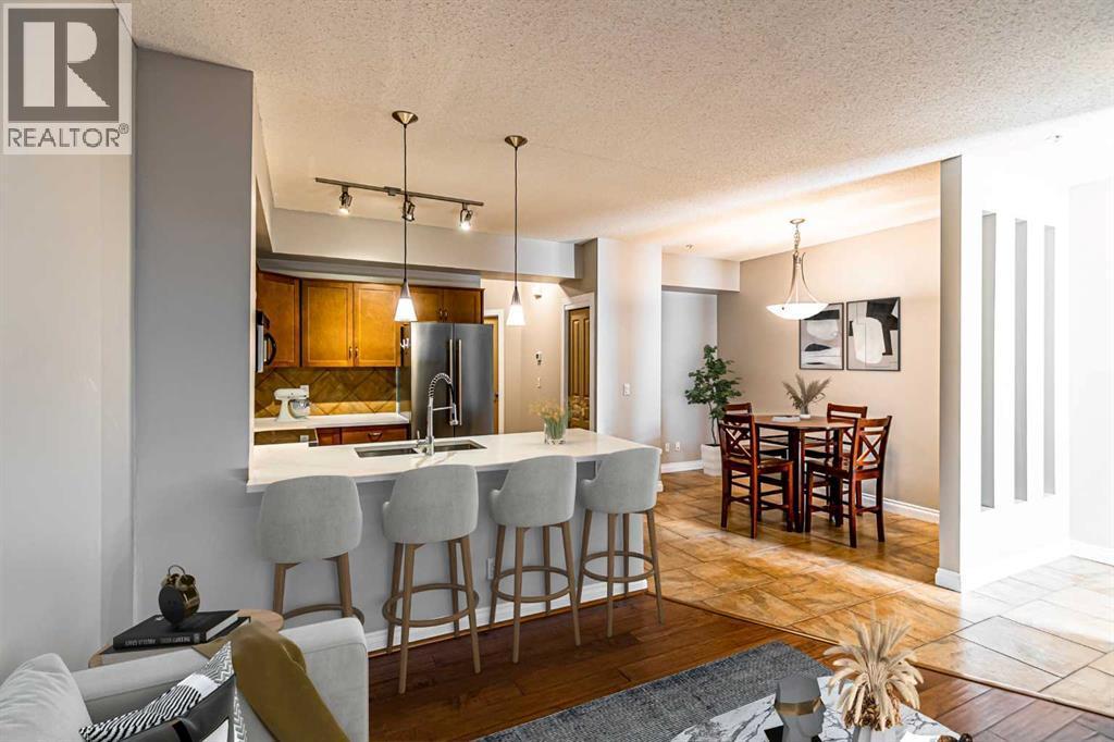 This immaculate 1 bed, 1 bath unit in Blue Sky is a true gem, perfectly blending modern finishes with functionality. The unit features new quartz countertops in the kitchen and bathroom, newer stainless steel appliances, fresh paint, gorgeous maple hardwood in the living and bedroom areas, and stylish tile in the kitchen and dining room. The open floor plan includes a bright living room with floor-to-ceiling windows and an inviting view of the outdoor space. Additional highlights include in-suite laundry, a spacious 4-piece bathroom, and a large bedroom with a walk-in closet and patio door leading to a private outdoor patio. Enjoy the convenience of two patios (with SW and NW exposure), allowing you to soak up the sun at any time of day. Ample storage options are available, including an additional locker for skis and bikes, as well as one secure underground parking stall. The complex is pet-friendly (with board approval) and features fitness facilities, a social room, and an inviting front patio equipped with a BBQ outlet, perfect for entertaining. This unit truly has it all and shows a perfect 10/10. Located close to schools, shops, restaurants, the Tuscany LRT station and a quick escape to the mountains. Don’t miss your chance to make this beautiful condo your new home! (id:6769