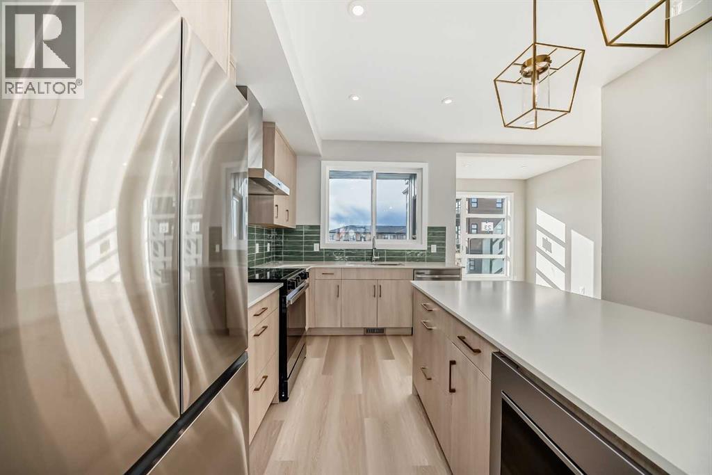 Only two townhomes remain in award-winning Logel Homes' Livingston Views development. This 1,481 sq. ft. residence (builder size) features upgraded cabinetry, quartz countertops, and premium Samsung stainless steel appliances. With 3 bedrooms and 2.5 bathrooms, the spacious primary suite includes a walk-in shower and dual sinks in the ensuite. Both second-floor bathrooms are finished with upgraded ceramic tile. The main floor is enhanced with pot lighting throughout, complementing the modern design. Additional features include a double underdrive garage for added convenience. Enjoy year-round comfort with central air conditioning and the assurance of a 5-year Alberta New Home Warranty. Ideally situated near shopping, parks, and an on-site lake, this home offers the perfect blend of luxury and practicality. Livingston Views is a short walk from “The Hub”, Livingston’s 35,000 square-foot Homeowners Association facility, and surrounded by 250 acres of open space, parks, and prairies. All set along the picturesque Livingston West Ponds. (id:6769