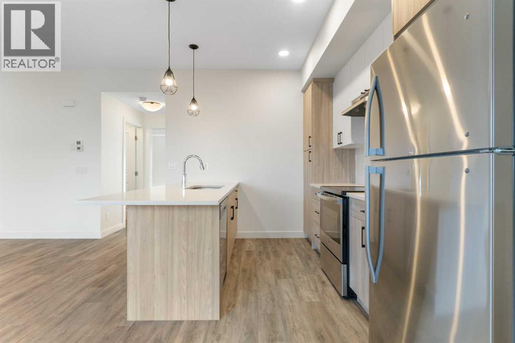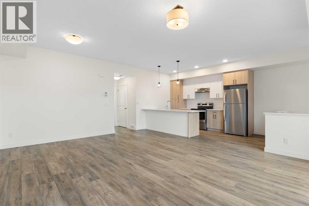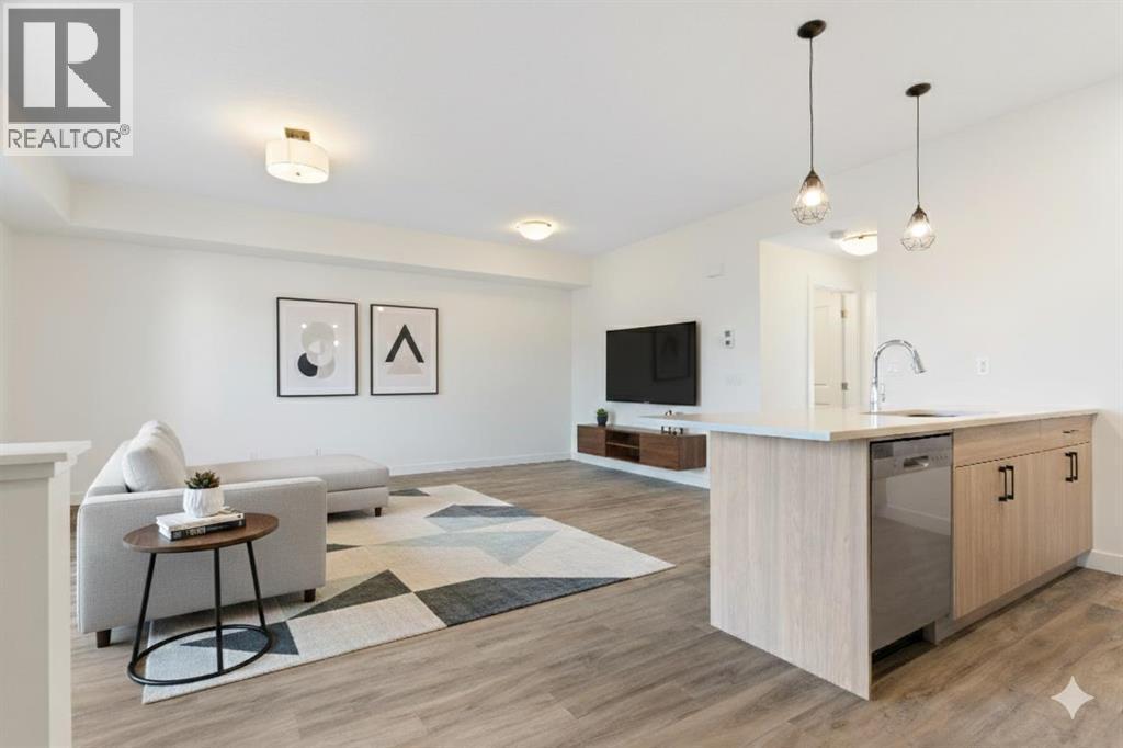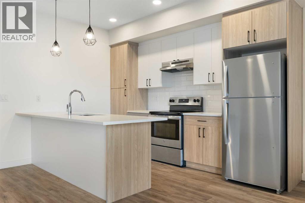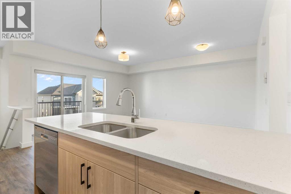 Check out this stunning top-floor stacked townhome that offers the perfect blend of style and function. Ready for immediate occupancy; this 1 bedroom 1 bath unit features over 1200 sq ft of thoughtfully designed living space, with most of the layout conveniently situated on a single level. Step inside and up to the main floor and you will discover an open-concept living area with a full kitchen that's a home chef's dream. The kitchen boasts elegant quartz countertops, soft-close drawers, and stylish two-tone cabinets highlighted by pendant lighting. An adjacent, flexible space is perfect for a spacious dining area or a home office. This home has an oversized bedroom and a full 4pc bathroom that doubles as an ensuite with its second access. A spacious laundry room adds to the convenience. This unique floorplan is designed to feel like a modern apartment but with the added benefits of a main floor storage/flex area and direct access to an oversized, extended single car GARAGE. This home is perfectly situated to offer the best of both convenience and community. It's located right next to a future school site, with transit options directly at your doorstep for effortless commuting. Enjoy a short two-minute walk to Bow Valley High School, and a quick five-minute trip to the Spray Lakes Sports Centre for all your recreational needs. For bigger city amenities, you're only 20 minutes from South Calgary, and the mountains are within easy reach, with Canmore just a 40-minute drive away. (id:6769