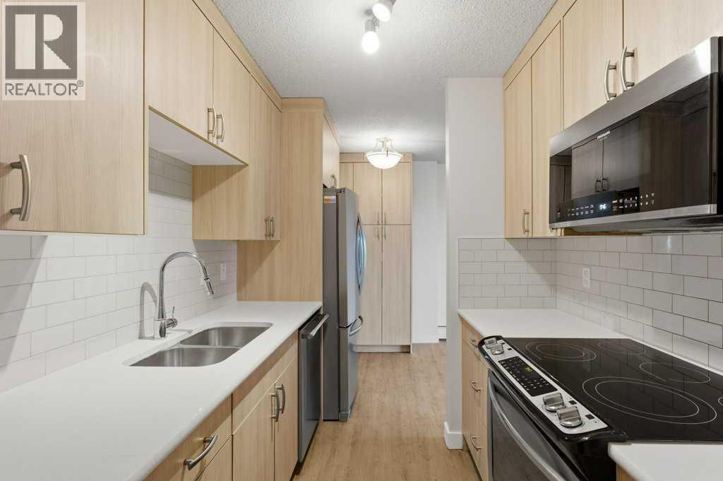 TOP FLOOR UNIT IN ACADIA offering approximately 869 sq. ft. of smartly designed living space with extensive renovations throughout. This two bedroom, one and a half bathroom condo delivers exceptional function, privacy, and flexibility—ideal for first-time buyers, downsizers, or investors. Step inside to discover easy care, water resistant laminate flooring throughout and a thoughtfully designed layout with generous room sizes and excellent storage. The professionally renovated kitchen features granite countertops, a modern tiled backsplash, stainless steel appliances, and custom built-in cabinetry that adds valuable extra storage with pull-out shelving. The spacious great room flows to a private balcony through sliding doors, while the well-sized dining nook easily accommodates a large table—perfect for entertaining. The updated 4-piece main bathroom showcases a modern tiled tub/shower surround and new vanity. A rare and desirable in-suite laundry room adds everyday convenience not found in all units. The primary bedroom offers a walk-in closet and private 2-piece ensuite, while the second bedroom is generously sized—ideal for guests, roommates, or a home office. This well-managed complex has seen substantial exterior upgrades, enhancing long-term value and curb appeal. In 2017, major improvements included a new roof, doors, Hardie Board siding, and common area updates. In 2020, all exterior walkways and entry areas were replaced with new concrete, providing a refreshed and well-maintained appearance. One assigned parking stall is included. Located in the established community of Acadia, this home offers outstanding access to local shops, services, schools, parks, and Heritage LRT Station. A true standout in a quiet, well-maintained complex, this move-in-ready unit showcases thoughtful upgrades, added functionality, and exceptional value. (id:6769