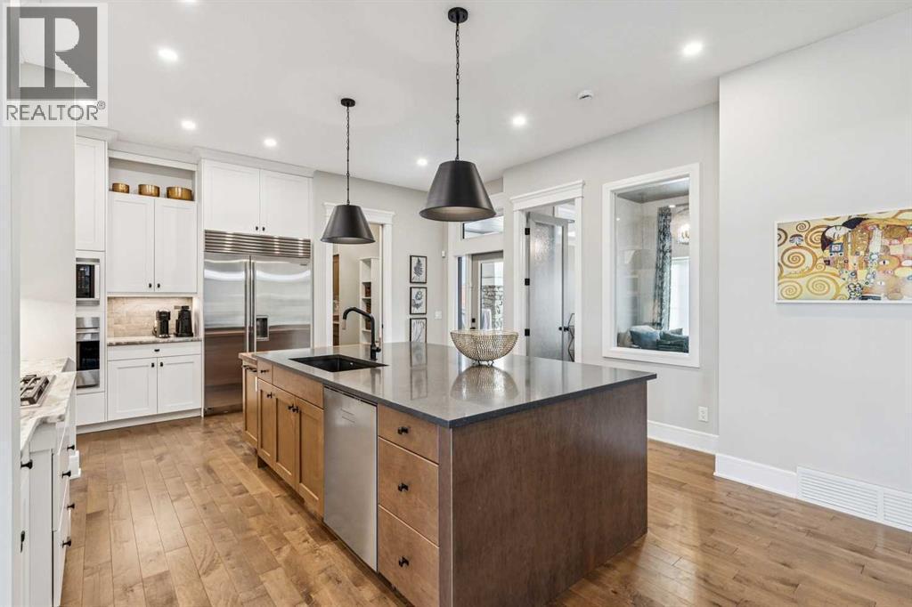 Welcome to a truly remarkable residence in the sought-after southwest community of Crestmont—a former Augusta show home showcasing extensive upgrades, refined craftsmanship, and a unique combination of luxury and functionality. Positioned on a generous corner lot with 3 bedrooms and rare 5-car garage, this highly coveted bungalow boasts more than 4,000 sq. ft. on two levels and offers an elevated lifestyle with thoughtfully designed spaces both indoors and out. The open-concept main level boasts 10' & 11' ceilings and is anchored by a stunning chef's kitchen, featuring extensive custom cabinetry, high-end Sub-Zero and Wolf appliances, and an oversized pantry—perfectly suited for both everyday living and elegant entertaining. Sunlight fills the space through transom windows, flowing seamlessly into inviting living and dining areas that open to multiple outdoor spaces. The primary suite on the main level is a private retreat of impressive scale, complete with its own southwest-facing deck. A spa-inspired ensuite with dual vanities, heated floors, a luxurious soaker tub and an expansive dressing room creates a serene, hotel-calibre experience. The main floor is complete with an executive style office featuring built-in desk and cabinetry, powder room and functional laundry & mudroom. Designed for entertaining and relaxation alike, the fully developed lower level offers two additional generously sized bedrooms, each with it's own full bath and an spacious recreation and games room. A sophisticated wet bar is complemented by a dedicated wine room, while a fitness room and hobby/craft room with second laundry area adds to the home’s lifestyle appeal. Outdoor living is equally exceptional, with multiple decks and private outdoor spaces, including a secluded walk-out cove featuring a hot tub. Outstanding landscaping includes feature rundle stone, wrought iron fence and back yard bordered by additional evergreen trees for enhanced privacy and year-round enjoyment. A stand out feature rarely found: a five-car garage with room for vehicle lifts, and offering unparalleled storage, dog wash and flexibility for car enthusiasts or hobbyists. Situated in the coveted Crestmont community on Calgary’s west side, this home offers more than just luxury indoors. Residents enjoy access to an inviting HOA clubhouse, scenic parks and pathways, and sport courts for recreation and play. Retail destinations are conveniently close, and the location provides easy access to downtown Calgary as well as direct routes to the mountains, making daily life and weekend escapes effortless. This is a rare opportunity to own a statement property in Crestmont—perfect for empty nesters or those about to be - where luxury, privacy, and thoughtful design converge in one extraordinary home. (id:6769