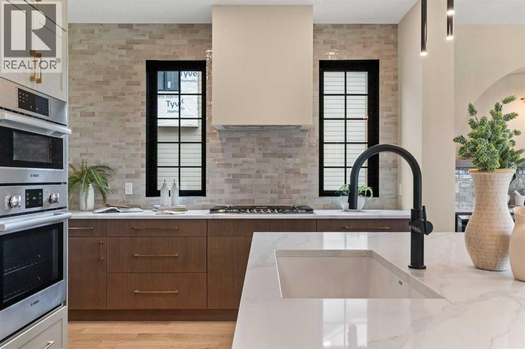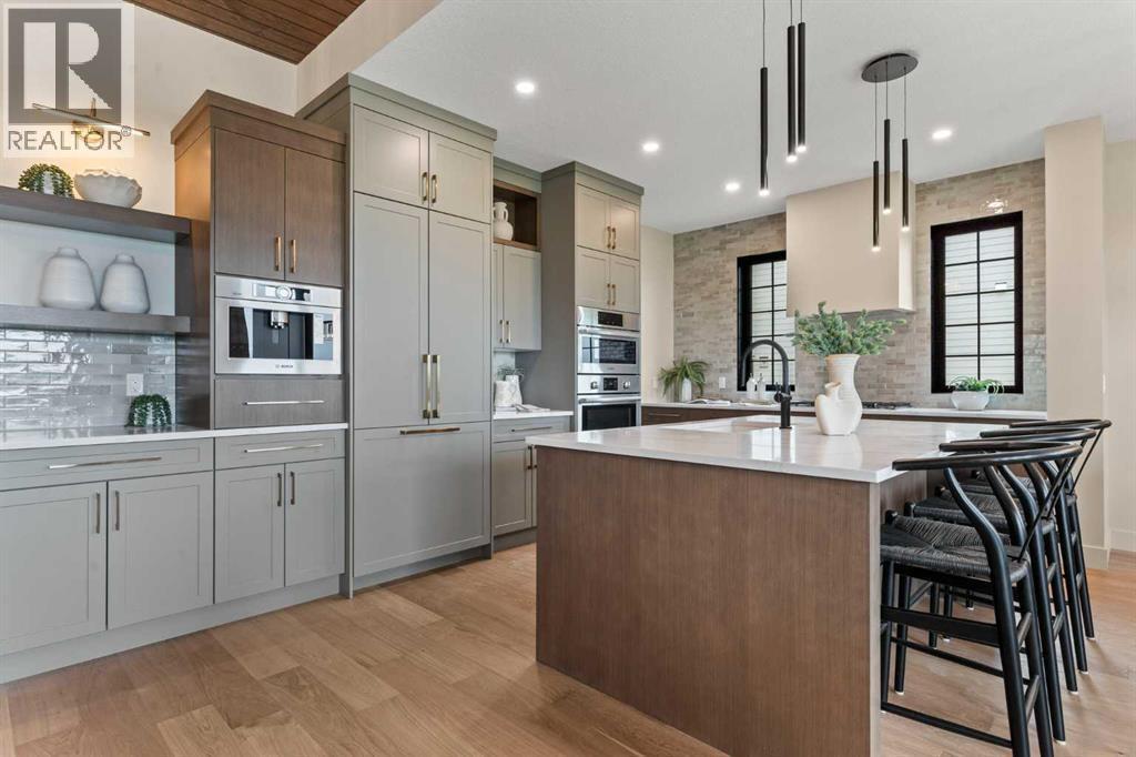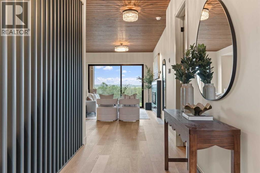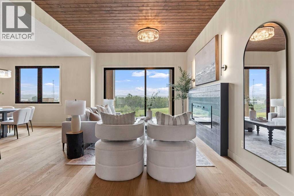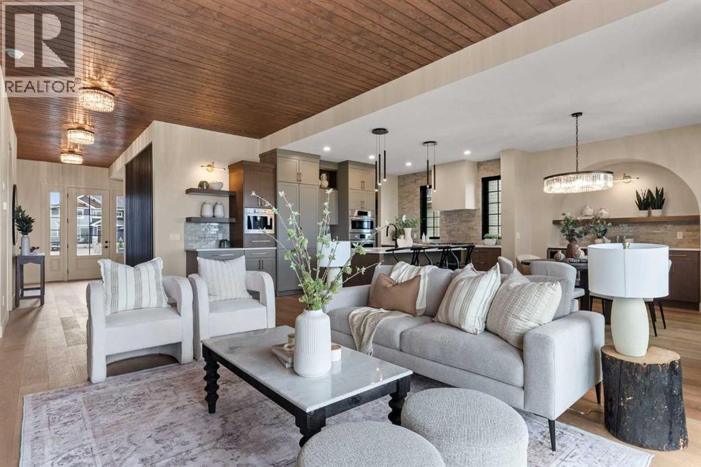 Welcome to the ultimate forever home—a brand-new luxury estate offering nearly 4,000 sq. ft. of thoughtfully designed living space, backed by New Home Warranty and available Spring 2026. Built by local builder, Iron Lake Homes, this residence is designed to age in place without compromise, blending timeless architecture with premium materials.The main level is anchored by rich hardwood and a stunning great room featuring a Canadian wood ceiling detail. The executive kitchen combines beauty and function with upgraded panel-ready appliances, dual wall ovens with microwave, gas cooktop, custom hood fan, and a built-in espresso machine, all seamlessly integrated into elevated millwork. The adjacent dining area is ideal for entertaining, complete with custom built-ins, bar fridge inset into an arched detail with glass backsplash that frames breathtaking views. Step outside to the covered deck with gas BBQ hookup—perfect for hosting or quiet evenings enjoying the scenery.The main-floor primary suite is a true retreat, featuring a spa-inspired ensuite with Heated herringbone brick floors, a curbless shower for two, and a freestanding soaking tub—designed for comfort, accessibility, and timeless luxury.Upstairs offers two spacious bedrooms, a bonus room, and a beautifully finished bathroom with Heated tile floors and dual vanity. The walkout basement expands the living space with an additional large bedroom, full bathroom, expansive recreation area, and a dedicated wellness zone with sauna and gym, plus direct outdoor access.Situated on an exclusive estate cul-de-sac at the highest elevation in Okotoks, this home captures sweeping views of the Sheep River Valley, town, and Rocky Mountains. Black farmhouse windows flood the interior with natural light, while the oversized pie-shaped lot offers rare flexibility, potentially allowing room for a detached shop, pool, or sport court—true acreage-style living within town limits.Finished with James Hardie Midnight Black si ding, brick accents, and an oversized Heated three-bay garage, this is a rare opportunity to own a meticulously crafted luxury estate—designed not just for today, but as the ultimate forever home. Photos are representational of specifications only, please come view to see the colors and selections for this one of a kind home. Price includes GST. (id:6769