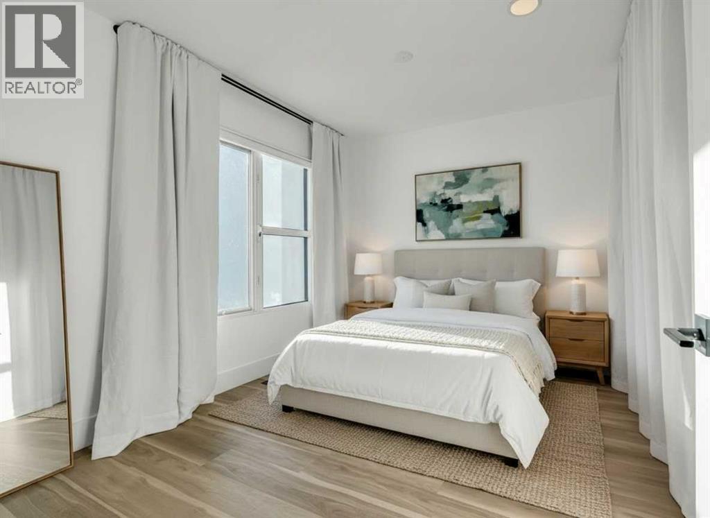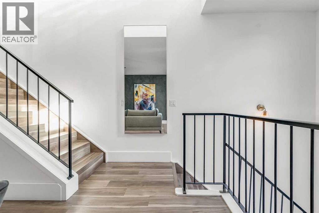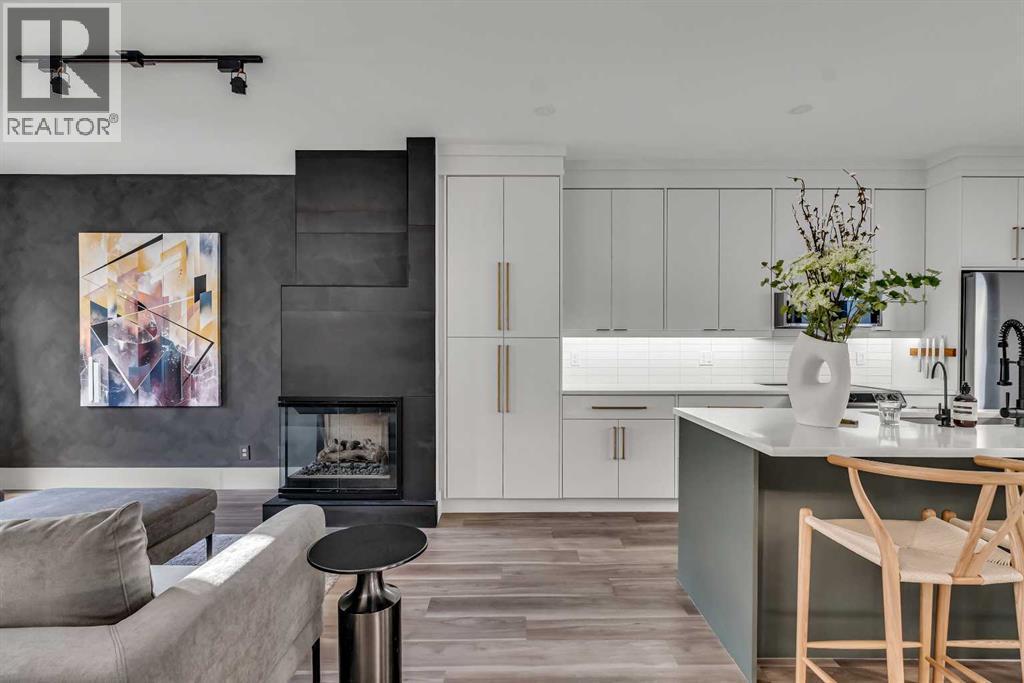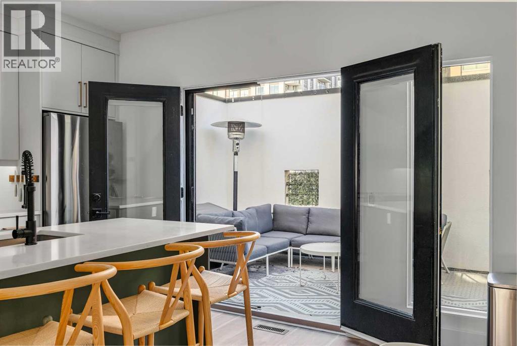 Architecturally distinct and thoughtfully renovated, this STURGESS ARCHITECTURE townhome offers refined urban living in the heart of Betline with SUNNY SOUTH EXPOSURE overlooking a quiet landscaped courtyard. Entry-level access provides a practical foyer with DIRECT GARAGE CONNECTION, creating everyday convenience while maintaining privacy from the street. The main living level is designed around an OPEN-CONCEPT FLOOR PLAN with 9’ CEILINGS and abundant natural light anchored by a dramatic two-storey window wall. The renovated kitchen blends form and function with QUARTZ COUNTERTOPS, A STATEMENT ISLAND WITH CRUSHED GRANITE SINK, FULL-HEIGHT CABINETRY, STAINLESS STEEL APPLIANCES, and A PANTRY WITH PULL-OUT STORAGE, supporting both daily living and entertaining. French doors extend the space outdoors to an OVERSIZED 177 SQ. FT. PRIVATE PATIO, ideal for relaxed evenings and summer gatherings. The main living area is centered around a TWO-SIDED GAS FIREPLACE that provides warmth and architectural interest without disrupting flow, while additional French doors open to a SECOND BALCONY overlooking the courtyard. A tucked-away powder room with stylish wallpaper completes this level. The upper floor is arranged for comfort and flexibility. The primary bedroom easily accommodates a king-sized layout and features a LARGE WALK-IN CLOSET with CHEATER ENSUITE ACCESS to the main bathroom. The 4-piece bathroom includes a STAND-UP SHOWER and A SUNNY SKYLIGHT that fills the space with natural light. The second bedroom enjoys SOUTH-FACING COURTYARD VIEWS, while an OPEN FLEX SPACE with GLASS BLOCK DETAILS creates an ideal office nook or reading area. Laundry is also conveniently located on this level. WIDE-PLANK LAMINATE AND TILE FLOORING flow throughout with NO CARPET, complemented by FLAT-PAINTED CEILINGS for a clean, modern finish. Notable upgrades include CENTRAL AIR CONDITIONING, A HIGH-EFFICIENCY FURNACE, and A NEWER HOT WATER TANK, offering long-term comfort and efficiency. Outd oor living is enhanced by TWO PRIVATE OUTDOOR SPACES. Parking is thoughtfully arranged with TWO COVERED STALLS, comprised of A PRIVATE INSULATED ATTACHED GARAGE AND A COVERED CARPORT (tandem). Located on a quiet street yet surrounded by everyday amenities, this home offers exceptional walkability with CONNAUGHT SCHOOL AND PLAYGROUND ACROSS THE STREET, easy access to parks, bike lanes, and green space, and close proximity to grocery stores, downtown, the tennis club and the shops and dining along 17TH AVENUE, delivering a highly livable and design-forward inner-city lifestyle. An exceptional setting with rare long-term upside. The adjacent street is slated for permanent transformation into a landscaped green space through an innovative public-realm project by SPECTACLE Bureau and The Tula Project, bringing ENHANCED GREENERY, REDUCED TRAFFIC, AND A CALMER STREETSCAPE that elevates both daily living and future appeal. (id:6769