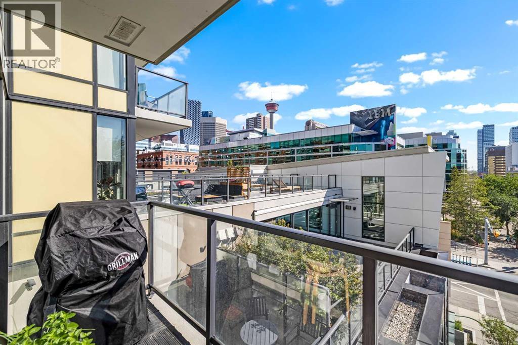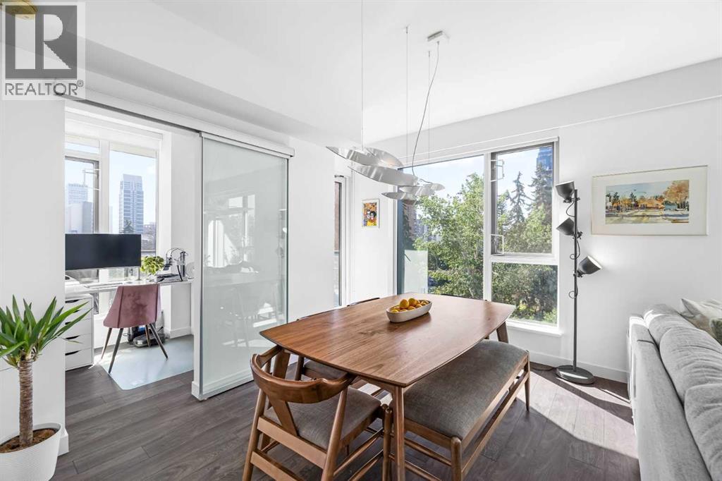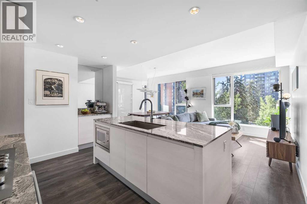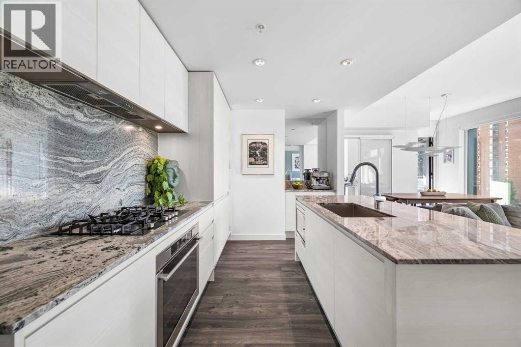 Welcome to Park Point, where elevated downtown living meets one of the Beltline’s most coveted locations. This stunning corner residence showcases sweeping southeast views over Central Memorial Park and the Calgary Tower, offering an ever changing backdrop of greenery, fountains, and city energy from the living room, primary bedroom, and private balcony. Inside, the home is bathed in natural light from expansive windows and finished with wide-plank laminate flooring throughout, creating a clean, modern aesthetic. Just off the entry, you’ll find a beautifully designed full bathroom featuring high gloss tile, a white marble vanity, and premium Hansgrohe fixtures, along with a conveniently placed laundry area and front closet.The kitchen is a true showpiece, thoughtfully designed with Italian Armony Cucine cabinetry, integrated German Liebherr double fridge/freezer, AEG gas cooktop and wall oven, and elegant granite countertops and backsplash. A large granite island anchors the space, ideal for both entertaining and everyday living. Sleek back-lit shelving and a custom end counter unit provide the perfect spot to showcase art or create a stylish dry bar. The entire unit has been tastefully upgraded, including designer lighting throughout, highlighted by an I Lucci Argentati linear suspension dining fixture valued over $10,000, along with fresh paint and wallpaper accents. Every room enjoys incredible views and an abundance of light. The primary suite offers a tranquil retreat with picturesque park views, a generous walkthrough closet, and a spa-inspired 3-piece ensuite with a large glass shower. The second bedroom, located on the opposite side of the unit in a desirable California style layout, provides excellent privacy. A separate den adds flexibility, perfect for a home office or study.Residents of Park Point enjoy an exceptional list of amenities, including 24-hour concierge service, secure underground parking with car wash bay, bike and pet wash areas, an indo or-outdoor social lounge with full kitchen and BBQ, bookable guest suite, a serene landscaped garden with water feature, and full fitness facilities complete with sauna and showers. A large storage locker is also included. All of this is just steps from Calgary’s best restaurants, cafés, pubs, boutiques, fitness studios, and everyday conveniences. This is executive Beltline living at its finest, refined, connected, and effortlessly stylish. (id:6769