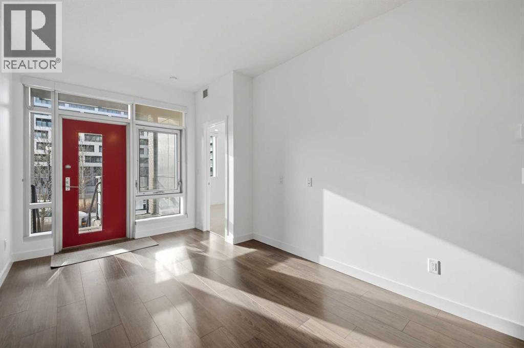 This GROUND-FLOOR TWO BEDROOM, TWO BATHROOM home offers a rare layout with a PRIVATE EXTERIOR ENTRANCE.Inside, the layout is OPEN AND FUNCTIONAL, with LARGE WINDOWS bringing in steady natural light throughout the day. The living and dining areas connect directly to TWO SPACIOUS PATIOS, providing excellent outdoor space for daily use, entertaining, or pets.The KITCHEN is clean and modern with STREAMLINED CABINETRY, CONTEMPORARY FINISHES, and a FULL-WIDTH ISLAND that works well for meals and gathering.The PRIMARY BEDROOM includes a WALK-THROUGH CLOSET leading to a private ENSUITE BATHROOM. The SECOND BEDROOM features a BUILT-IN MURPHY BED, allowing the room to function comfortably as a bedroom, office, or flex space.Additional features include IN-SUITE LAUNDRY, AIR CONDITIONING, an OVERSIZED CORNER TITLED UNDERGROUND PARKING STALL , SEPARATE STORAGE LOCKER, and SECURE BIKE STORAGE.The building offers a wide range of shared amenities, including TWO FITNESS ROOMS, YOGA STUDIO, SPIN STUDIO, ROOFTOP PATIO, CAR WASH, and DOG WASH STATION.Gyms located on Floors 1 and 3; yoga and spin studios on Floors 4 and 5; bike storage, storage locker, and dog wash on P1; parking on P2.Located in BRIDGELAND, the property is within walking distance to RESTAURANTS, COFFEE SHOPS, GROCERY STORES, PARKS, and the C-TRAIN STATION, offering practical access to daily amenities and transit.Well suited for OWNER OCCUPIERS OR INVESTORS seeking a low maintenance property with strong functionality and location. (id:6769