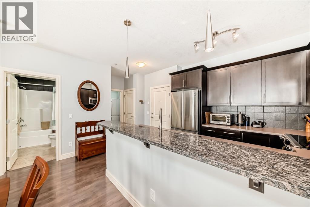 Welcome to 3104, 15 Sunset Square — a beautifully designed 2-bedroom, 2-bathroom ground-floor condo in Cochrane’s sought-after Sunset Ridge community. With 1,021 sq. ft. of stylish, comfortable living space, this home blends modern convenience with a warm, welcoming feel you’ll notice the moment you step inside.The open-concept floor plan is bright and spacious, highlighted by 9-foot knockdown ceilings and infloor heating with dual zones for year-round comfort. The kitchen is a showpiece — featuring stainless steel appliances, granite breakfast bar, and elegant pendant lighting that creates the perfect space for cooking, entertaining, or sipping your morning coffee.The huge primary bedroom feels like a private retreat, complete with a large walk-in closet and a roomy 3-piece ensuite. A second spacious bedroom sits near the 4-piece main bathroom, which includes a convenient cheater door for added privacy — ideal for guests or shared living.From the open and inviting living room, step outside to your large ground-floor patio, perfect for relaxing with friends or enjoying a quiet evening by the BBQ (gas line ready!). You’ll love the insuite laundry, and the rare convenience of two titled parking stalls — one secure space in the heated underground parkade (with storage locker) and one handy surface stall just steps from your door.Located in the heart of Sunset Ridge - this community is known for its friendly neighbours, peaceful atmosphere, and incredible amenities — enjoy nearby walking paths, parks, coffee shops, restaurants, and a neighbourhood grocery store. With Cochrane’s beautiful mountain views and the Bow River pathways just minutes away, every day feels like a breath of fresh air.Whether you’re looking to downsize, invest, or simply enjoy a low-maintenance lifestyle in a warm and welcoming setting, this stunning condo is the one you’ve been waiting for. Quick possession possible!Schedule your showing today and discover the comfort, style, and charm of li fe at 3104, 15 Sunset Square. (id:6769