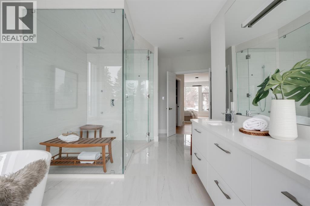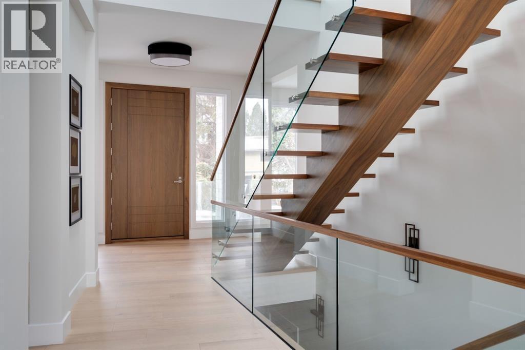 Built in 2020, this striking contemporary home offers 4,567 sq. ft. of thoughtfully designed living space, blending refined minimalist architecture with sophisticated modern finishes. Inspired by a relaxed, Californian sensibility, the home seamlessly balances everyday family living with stylish entertaining. Upon entry, a dramatic floating glass staircase makes an immediate architectural statement. The formal living room is both spacious and inviting, easily accommodating a grand piano while maintaining an intimate feel. The adjacent dining room is ideal for hosting large family gatherings or elegant dinner parties. At the rear of the home, a stunning wall of windows spans the family room, casual dining area, and sleek kitchen, flooding the space with natural light and creating a seamless sense of openness. A double-sided fireplace subtly defines the living zones while preserving a connected flow. The kitchen features a striking mix of high-gloss and warm wood cabinetry, a generous island designed for gathering, and a well-planned pantry offering excellent storage. Step directly from the kitchen onto a tiered deck and into the sunny, south-facing backyard, a private outdoor space ready for your personal vision. A versatile flex room off the kitchen is perfect for a home office, playroom, or cozy lounge. Upstairs, the expansive primary suite is a true retreat, complete with a luxurious ensuite, an impressive walk-in closet, and a that connects to an office or a room you can develop into a second closet. Three additional bedrooms, each with its own ensuite, provide exceptional comfort and privacy. The lower level includes a bright recreation room, a fifth bedroom, and a functional mudroom ideal for busy family life. Additional highlights include air conditioning, a heated driveway and an exceptional four-car garage. With generous proportions, contemporary design, and outstanding potential to personalize, this modern luxury home is ideally located in one of the city’ s most sought-after neighbourhoods. (id:6769