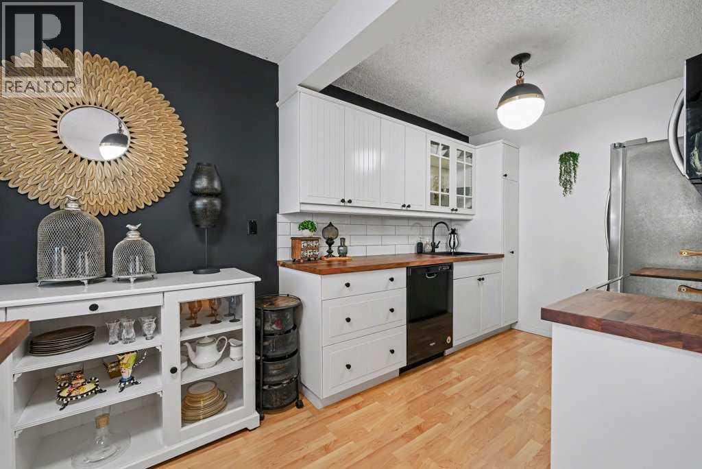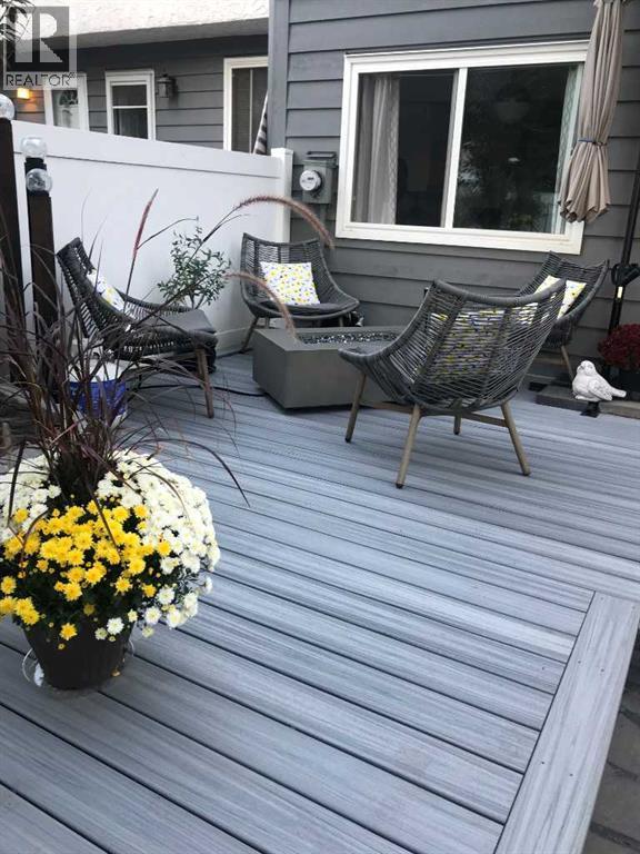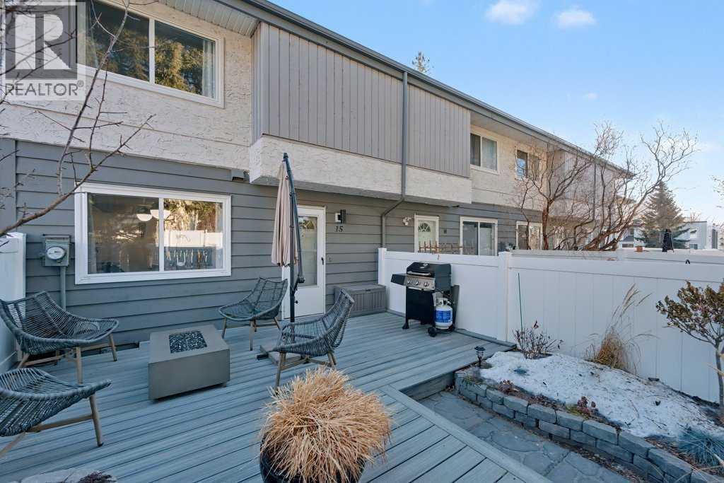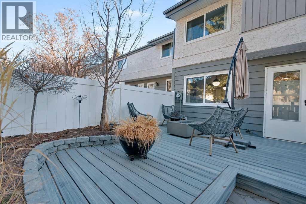 What a beauty! Perfect location on the back side of the complex in a quiet corner, steps away from Fish Creek Park! Go for long walks immersed in nature along paved pathways! This complex is incredibly well managed with strong reserve fund & low monthly condo fees that even include water & gas! The unit has been beautifully updated featuring modern design touches. Gleaming oak hardwood floors, newer windows & hot water tank. Re-designed kitchen features Black Walnut butcher block counter tops, loads of white cabinets & new appliances. Check out the induction stove! Enjoy your breakfast at the dining nook overlooking the beautiful back yard & watch the squirrels playing in the mature trees behind! 3 bedrooms & a fully updated bathroom upstairs. The Primary bedroom has room for a full furniture suite, features a large closet & nook area perfect for a computer or makeup desk. More space awaits you in the basement where the laundry machines & mechanicals are located. Look for the “secret door” that leads to a whimsical room professionally painted by a movie set designer. The yard has been transformed into a private oasis in nature. Enjoy low maintenance vinyl decking & stone bordered raised gardens! Walk out the back gate directly to your parking space. You will love getting to know the friendly, quiet, long term neighbours. (id:6769