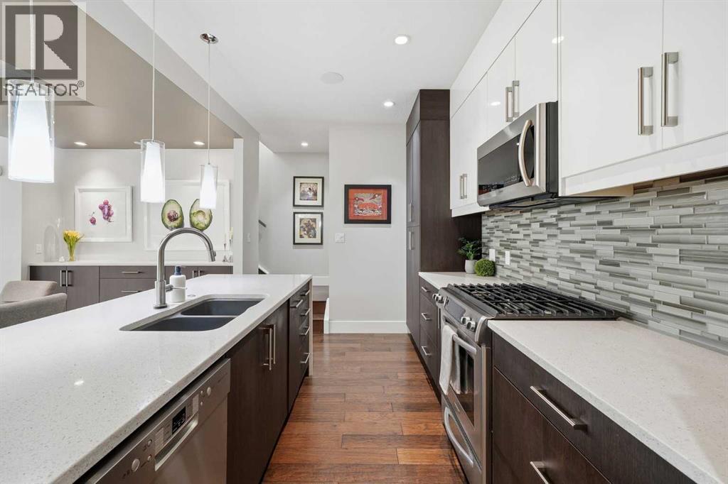 Nestled in the heart of BRIDGELAND, one of Calgary’s most dynamic inner-city communities, awaits your stunningly updated executive 3 storey townhome, offered at $725,000 - tremendous value. With over 2428 SQUARE FEET OF TOTAL LIVING SPACE, this 3 BED 3.5 BATH home has a FULLY DEVELOPED BASEMENT, a ROOFTOP PATIO WITH CITY VIEWS, and a DEDICATED GARAGE SPACE. Situated on a quiet street, this ORIGINAL OWNER PROPERTY has been lovingly maintained and is move-in-ready. Just MINUTES TO DOWNTOWN and steps to trendy shops, restaurants, and amenities - you’ll truly be living the downtown dream. This front unit home is SOUTH FACING, flooding the interior with beautiful natural light. The ground floor offers two generously sized bedrooms, each with its own ensuite, allowing the main living space to occupy a more elevated vista from the second floor. Ascending the beautiful hardwood staircase, you’ll find an OPEN PLAN LIVING SPACE that is truly the heart of the home. Light and bright, this spacious level features a modern chef's kitchen with quartz countertops, stainless steel appliances (including a gas range), and a waterfall island. A sun-drenched dining area featuring built-in storage flows seamlessly into the spacious living room, which includes a cozy gas fireplace and recessed shelving. Just off the living room is a breakfast balcony with a gas line, ideal for outdoor cooking. The top floor is an entertainer’s dream, featuring a LARGE BONUS ROOM with a wet bar, soaring 13' vaulted ceilings, built-in speakers, and glass patio doors leading to your private rooftop deck with sweeping views of the downtown skyline. The builder finished lower level includes a third bedroom with a wet bar (or rec room), a full bathroom, storage room, and a dedicated laundry room (with a brand new washing machine). The Bridge 8 complex has undergone significant exterior upgrades, enhancing both its durability and value. Low condo fees and a healthy reserve fund further enhance this exceptional o pportunity. SPECIAL FEATURES INCLUDE: tennis courts right next door, Hunter Douglas blinds, IQ air filtration system, and in-floor heating in the basement. Bridgeland is a vibrant community with so many amenities nearby including the LRT, Calgary Zoo, Telus Spark, the Bow River pathway system, and great access to Deerfoot Trail or into the Beltline. If you’re looking for that exciting city lifestyle this home is a must-see. Don’t miss your chance to experience the best of inner-city living—call your Realtor today for a private viewing! (id:6769