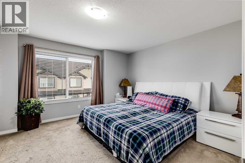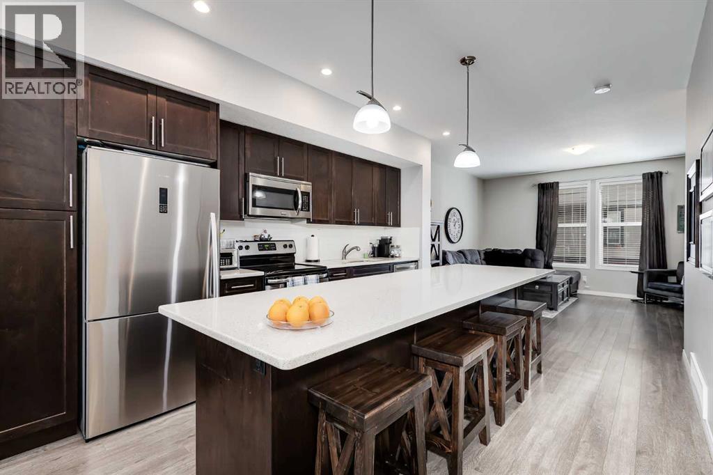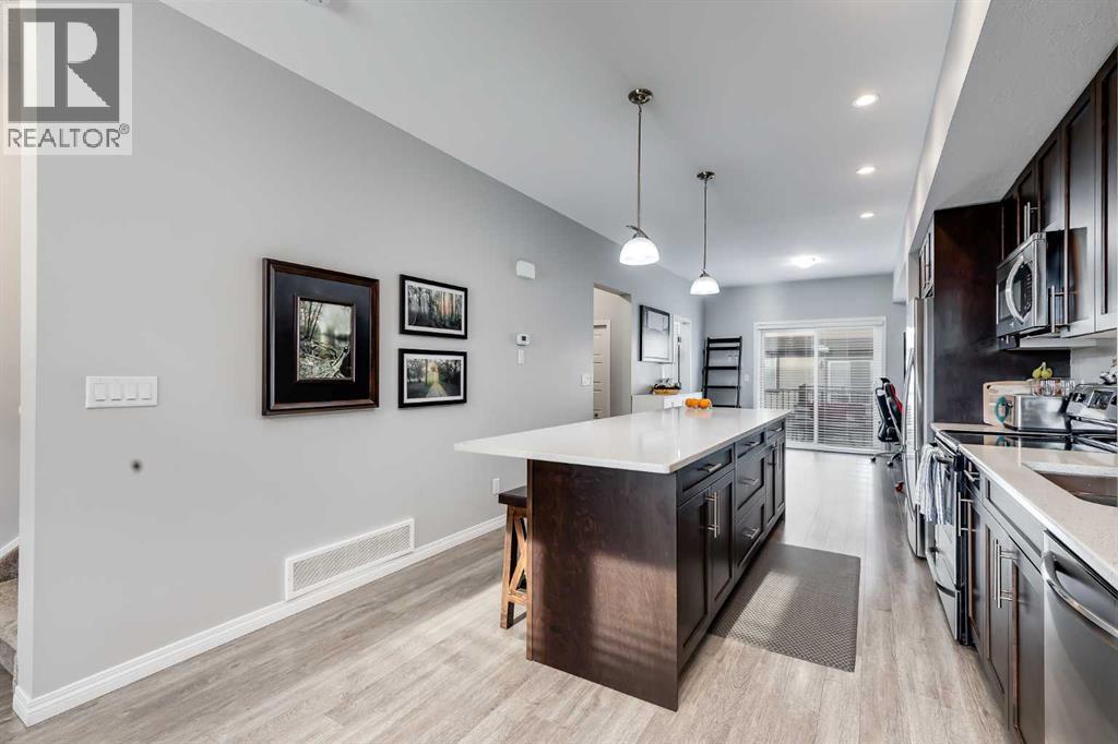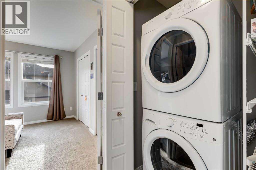 **Open House Sat Jan 24 & Sun Jan 25 11am-1pm** Bright and open 2-bedroom townhome in the community of Williamstown. An excellent value with condo fees that include the Airdrie monthly water and sewer bill. Before you enter you'll notice the playground right beside the home, and the visitor parking stalls right in front, making it ideal for guests. The entry level offers a 40' Long OVERSIZED DOUBLE GARAGE, plus driveway, allowing parking for up to 3 vehicles, plenty of storage, and a rare additional access door from the garage to the back, making taking out the garbage very easy! The open-concept main floor is complete with 9-foot ceilings, upgraded cabinetry, quartz countertops, stainless steel appliances, and an impressive 10 FOOT LONG KITCHEN ISLAND making for lots of counter space. Central AIR CONDITIONING makes this home comfortable all year round. The dining area is large enough for a big table, and with the balcony right here, it makes for the perfect space for entertaining. The living room features an electric fireplace and A main floor half-bath completes this level. Upstairs, the third floor features a large primary suite, including a walk-in closet and a 4-piece en-suite with Double Sinks. The second bedroom is also a great size and features double closets. The upstairs is complete with the main 4-piece bathroom, and UPPER LAUNDRY. In the community of Williamstown you can enjoy the environmental reserves thats just steps away with wetlands, walking paths, playgrounds. You're also just a short walk from Herons Crossing K-8 School. Book your showing today! (id:6769