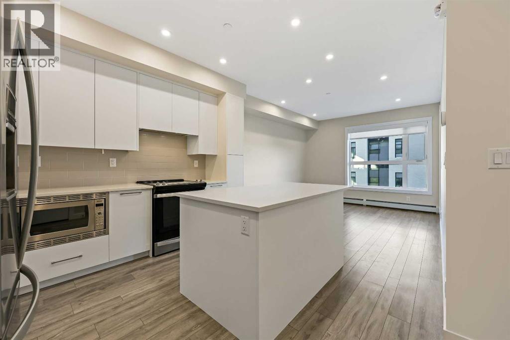 *** OPEN HOUSE SATURDAY MARCH 7th 2026 12-2PM *** Welcome to Capella in University District, a modern, well-built condo in one of Calgary’s most vibrant and walkable NW communities. This 2 bedroom, 2 bathroom home offers a quiet, courtyard-facing setting with a peaceful outlook, while still being just steps from parks, a playground, and the district’s best shops, cafés, restaurants, and everyday conveniences. With quick access to U of C, Alberta Children’s Hospital, Foothills Medical Centre, Market Mall, scenic pathways, and transit, the location delivers unbeatable lifestyle and long-term value.Inside, the open-concept layout is bright and inviting, finished with 9’ knock-down ceilings, triple-pane windows, LED lighting, and durable vinyl plank flooring. The kitchen is designed to impress with quartz countertops, a large quartz island, full-height cabinetry, a tiled backsplash, and a full stainless steel appliance package including a built-in microwave, ideal for cooking, entertaining, or casual mornings at the island. The living and dining areas flow seamlessly and provide excellent functionality for both daily living and hosting.The primary suite offers comfort and privacy with a 4-piece ensuite, while the second bedroom is perfectly positioned near the additional 4-piece bathroom, ideal for guests, roommates, or a dedicated home office. In-suite laundry adds everyday convenience and keeps everything neatly within reach.Step outside to your oversized massive patio complete with a gas line, perfect for summer BBQs, patio furniture, and relaxing evenings. Capella also features a striking lobby, an attractive landscaped courtyard/breezeway, and a fitness centre, adding to the elevated condo lifestyle. Completing the package are titled underground parking and an assigned storage locker. A polished, low-maintenance home in an exceptional location, perfect for professionals, downsizers, or investors looking to be in the heart of University District. (id:6769