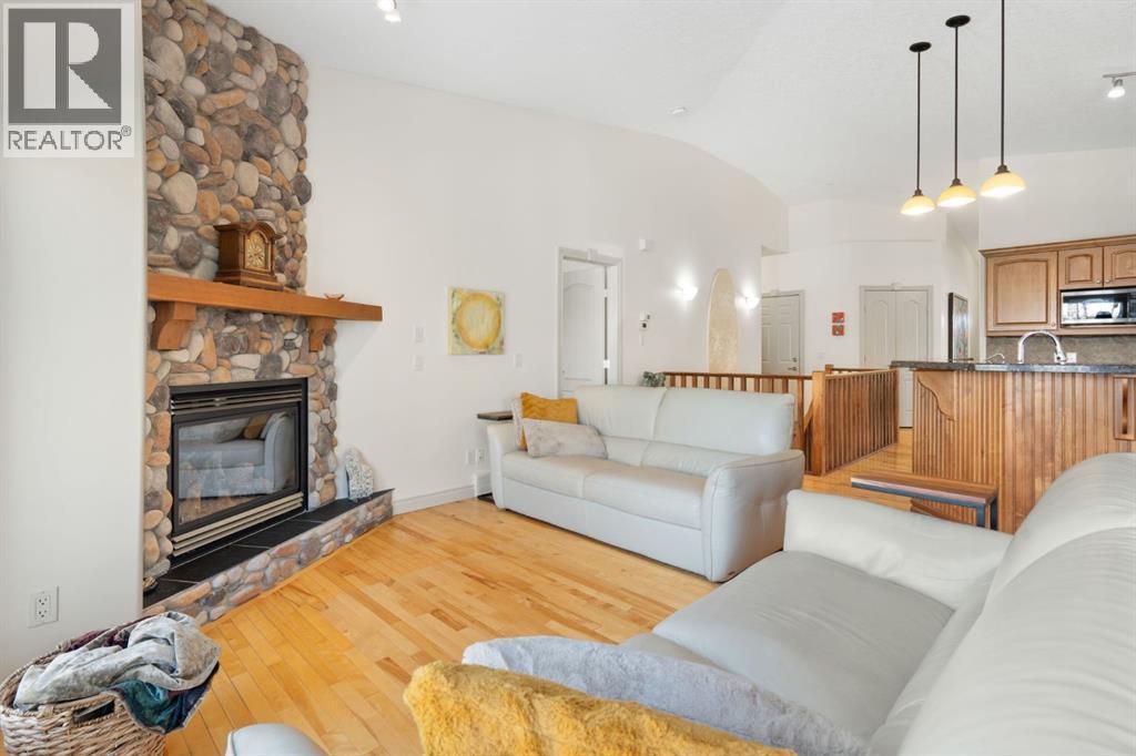 Welcome to this immaculately maintained 3 bedroom, 2.5 bathroom walkout bungalow villa, tucked into an exceptionally well-managed and peaceful condominium community in Okotoks’ desirable Air Ranch.Designed for comfort and ease, the main floor offers everything you need for day to day living, including a spacious primary bedroom, 1.5 bathrooms, laundry, and an open concept kitchen and living area. Vaulted ceilings, original hardwood floors, and granite countertops create a sense of warmth and openness that feels both timeless and inviting. A natural gas fireplace anchors the living space, making it equally suited for quiet evenings or entertaining.The fully developed walkout lower level expands your living space beautifully, with two additional bedrooms, a full bathroom, and an exceptionally large recreation room, all enhanced by in floor heating, a feature you’ll truly appreciate year round.Privacy here is outstanding. Enjoy quiet and friendly neighbours, and easy access to the scenic walking paths surrounding the ponds throughout the Air Ranch community and beyond. Outdoor living is equally thoughtful: a west facing front porch welcomes afternoon sun, while the east facing upper deck is perfect for morning coffee. The lower patio, also east facing, features a natural gas BBQ hookup and ample space for outdoor dining and relaxation.This home is in excellent condition and truly move-in ready, with thoughtful upgrades including a new hot water tank (December 2024) and a recently serviced furnace (December 2025) that received a strong bill of health. (id:6769
