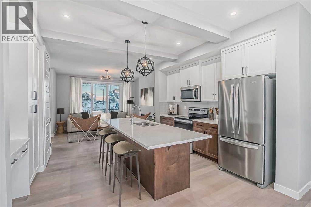 IMMEDIATE POSSESSION! BRAND NEW HOME by Douglas Homes, Master Builder in central Greystone, short walking distance to the Bow River, shopping & interconnected pathway system. Featuring the Melbourne with additional SIDE ENTRY. Located down the street from the community Kids Play Park on a sunny west facing backyard, great for entertaining. This gorgeous 3 bedroom, 2 & 1/2 half bath home offers over 1225 sq ft of living space. Loads of Designer/upgraded features in this beautiful, open floor plan. The main floor greets you with a grand glazed 8' front door, soaring 9' ceilings, oversized windows , & 8' 0" passage doors. Distinctive Engineered Hardwood floors flow through the Foyer, Hall, Great Room, Kitchen & Nook adding a feeling of warmth & style. The two sided Kitchen is completed with an oversized entertainment island (9'0" single level island) & breakfast bar, roomy cabinet pantry, Quartz Countertops, 42" Cabinet Uppers accented by decorative drywall bulkhead, Pots & Pans Drawers, soft close doors & drawers throughout, new stainless appliance package including Microwave/Hood Fan combo over the stove , smooth top electric Range, Fridge & built-in Dishwasher. The main floor is completed with an expansive, open Great Room with Napoleon "Entice" fireplace, spacious Nook finished with over height windows, rear entry with full French Door & transom above, closet & 1/2 bath . Upstairs you'll find a well sized Primary Bedroom with 3 piece Ensuite including separated Quartz vanity with undermounted sink & oversized 5'0" x 3'0" shower with tiled walls & ceramic tile flooring. There is also a generous sized walk-in closet accessed from the bedroom. There are two additional good sized bedrooms with roomy closets. The second floor is completed by a main bathroom with combination Tub/Shower with tiled walls, Quartz countertop with undermounted sink & in-vanity drawer all completed by ceramic tile flooring. You're certain to love the convenience of the 2nd Laundry for stacked washer/dryer also completed with tile flooring. This is a very popular plan, great for young families or for the sizing down crowd. Spacious, Beautiful and Elegant! The perfect place for your perfect home. Call today! Photos are from prior build & are reflective of fit, finish & included features. Note: Front elevation of home & interior photos are for illustration purposes only. Actual elevation style, interior colors/finishes, & upgrades may be different than shown & the Seller is under no obligation to provide them as such. Directions: Come to the Show Home first at 500 River Avenue. THIS HOME IS UNDER CONSTRUCTION (id:6769