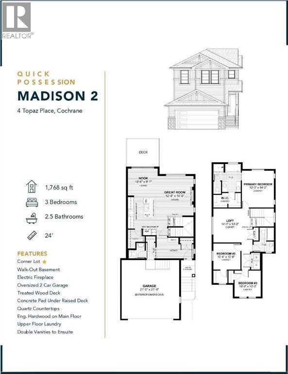 BRAND NEW HOME by Douglas Homes, Master Builder in central Greystone, short walking distance to parks, the Bow River, major shopping & interconnected pathway system. Featuring the Madison 2 on a corner lot, south facing back yard, walkout basement, deck off the main floor accented by built out columns on an R-MX zoned lot for POTENTIAL future lower level suite. NOTE: a secondary suite would be subject to approval and permitting by the city/municipality. Located on a quiet street, very close two Children's Play Parks & paved back lane. This gorgeous 3 bedroom, 2 & 1/2 half bath home offers over 1760 sq ft of living space. Loads of upgraded features in this beautiful, open floor plan. The main floor greets you with a grand glazed 8' front door, soaring 9' ceilings, oversized windows , & 8' 0" passage doors. Distinctive Engineered Hardwood floors flow through the Foyer, Hall, Great Room, Kitchen & Nook adding a feeling of warmth & style. The Kitchen is completed with an oversized entertainment island (7'0" single level island) & breakfast bar, roomy closet pantry with 8'0" French Door , Quartz Countertops, 42" Cabinet Uppers accented drop bulkhead, Pots & Pans Drawers, soft close doors & drawers throughout, new stainless appliance package including Side by Side Fridge with Ice and Water, Gas Range, Chimney Hood Fan, Built-In Microwave in the island & Built-In Dishwasher. The main floor is completed with an expansive, open Great Room & Nook finished with over height windows & Napoleon "Entice" fireplace. Ascending the second floor there is a large "U" shaped staircase complimented by black metal spindle railing naturally light by a large window. Upstairs you'll find a generous Primary Bedroom with 5 piece Ensuite including dual, separate, Quartz vanities with undermounted sinks, oversized 4'0" x 3'0" shower, 6'0" soaker tub with large window above, private water closet, & ceramic tile flooring. There is also a generous sized walk-in closet accessed from the Ensuite. T he 2nd floor is completed by a spacious, centralized Family Loft & two additional, good size bedrooms, one with WIC. The 2nd & 3rd bedrooms have the convenient access to the main bath with Quartz countertop, undermounted sink & tile flooring. You're certain to love the convenience of the 2nd Laundry completed with large access doors, light & tile flooring. This is a very popular plan, great for young families or for the upsizing crowd. Spacious, Beautiful and Elegant! The perfect place for your perfect home. Call today! Photos are from prior build & are reflective of fit, finish & included features. Note: Front elevation of home & interior photos are for illustration purposes only. Actual elevation style, interior colors/finishes, & upgrades may be different than shown & the Seller is under no obligation to provide them as such. Directions: Come to the Show Home first at 500 River Avenue. THIS HOME IS UNDER CONSTRUCTION. (id:6769