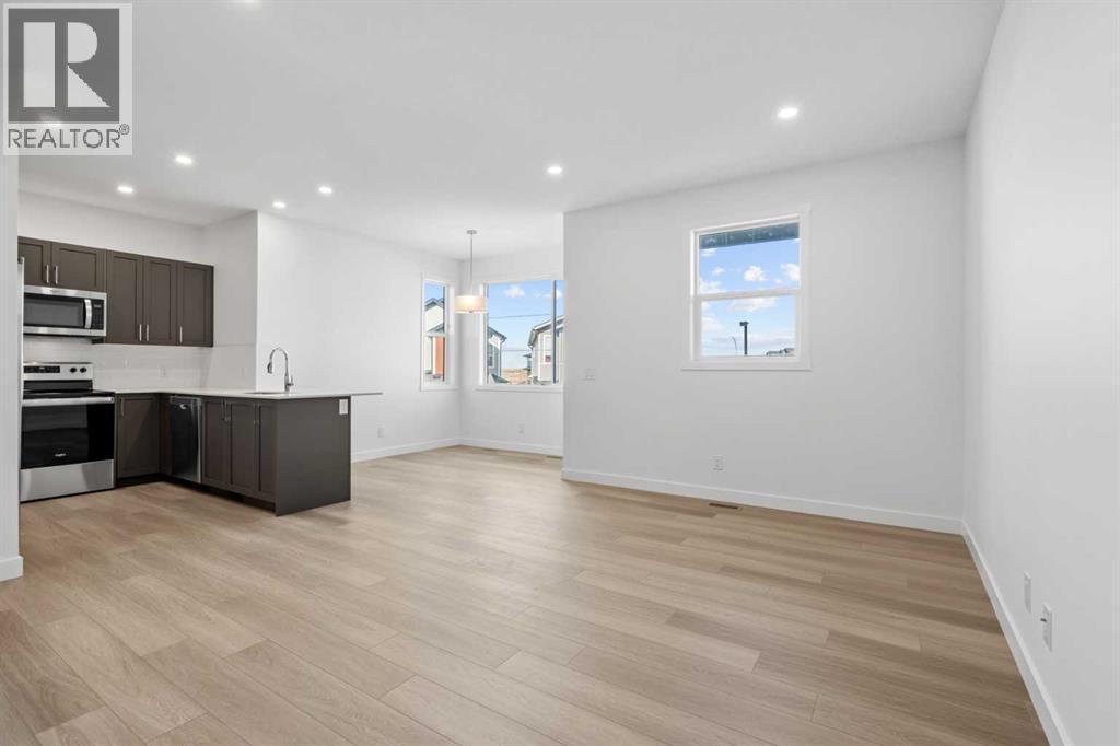 NEW BUILD 3-STOREY TOWNHOME | END UNIT NEAR GREEN SPACE | LOW CONDO FEES | 3 BED / 3.5 BATH / 1544 SQ FT | SINGLE ATTACHED GARAGE | Welcome to the Townsend 1 by Minto Communities, an award-winning Canadian builder for over 70 years! Belvedere Rise offers an intimate collection of just 56 thoughtfully designed townhomes located in the growing community of Belvedere, steps from East Hills Shopping Centre. This end-unit home offers added privacy and is ideally positioned near green space, combining modern design, everyday convenience, and excellent value for families and professionals alike.The main living level showcases a bright and functional layout designed for both comfort and entertaining. The kitchen is well-appointed with a pantry, stainless steel appliances, and peninsula counter space, seamlessly connecting to the dining area located at the front of the home with direct access to a private balcony. Adjacent to the kitchen and dining area is a spacious living room featuring an additional flex space, ideal for a home office, reading nook, or play area. A convenient 2-piece bathroom completes this level.Upstairs, the upper floor is designed with privacy and functionality in mind. The spacious primary bedroom features a walk-in closet along with a 4-piece ensuite. The second bedroom also includes a walk-in closet and is serviced by another separate full bathroom. Upper-floor laundry adds everyday convenience and completes this well-planned level.The ground floor offers a large welcoming entryway, a third bedroom, and a 3-piece bathroom—ideal for guests, a home office, or multi-generational living. This level also provides direct access to the single attached garage, keeping daily routines simple and efficient.Belvedere Rise fosters a true sense of community with its pedestrian pathways, nearby greenspace, and intimate scale, creating an environment where neighbours can easily connect. Located just steps from East Hills Shopping Centre, residents enjoy unmatc hed walkability to Costco, Walmart, banks, restaurants, and everyday essentials—all just across the street. With quick access to major roadways and public transit, commuting downtown or around the city is effortless.Combining modern finishes, a functional three-storey layout, low condo fees, and an unbeatable location, this is a fantastic opportunity to secure a brand-new townhome in one of southeast Calgary’s most convenient communities. Contact Minto’s sales staff and book your visit today! (id:6769