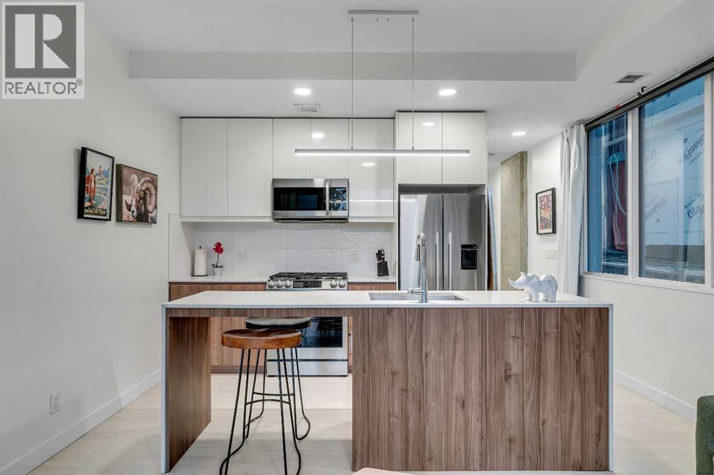 Set within the heart of Sunnyside, this ground-level end unit at The Annex by Minto delivers modern design, urban energy and thoughtful livability in one of Calgary’s most walkable communities. An open floor plan creates a natural flow between kitchen and living spaces, supporting everyday function while maintaining a clean, contemporary feel ideal for city-focused living. The kitchen is beautifully finished with abundant 2-toned cabinetry, stainless steel appliances, a gas stove for precision cooking and a centre island with built-in seating that encourages casual meals, entertaining and connection. Adjacent living space invites relaxation with an entire wall of west-facing glass that fills the home with afternoon light while framing downtown views and adding warmth and visual depth throughout the day. Direct access to a ground-level patio extends the living area outdoors, offering a front-row seat for summer barbecues, people watching and soaking in the vibrant character of this highly urban setting. A spacious bedroom provides a quiet retreat with room to unwind, while a stylish 4-piece bathroom complements the modern aesthetic with clean lines and practical finishes. In-unit laundry adds everyday convenience, and an assigned storage locker keeps seasonal items organized and out of sight. Built with concrete construction, The Annex is known for its quiet interiors, low condo fees and sustainable design as a LEED Gold V4 mid-rise, featuring award-winning Nyhoff architecture and a pet-friendly policy (upon board approval). An unbeatable location places restaurants, coffee shops, boutique fitness, grocery options, the C-Train and the Bow River pathway system just steps away, offering a Walk Score of 94, seamless transit access and a lifestyle that supports connection, movement and effortless access to downtown Calgary! (id:6769