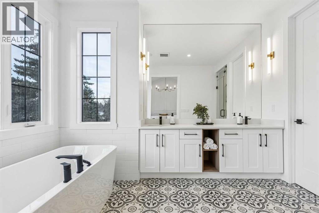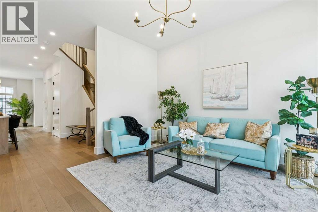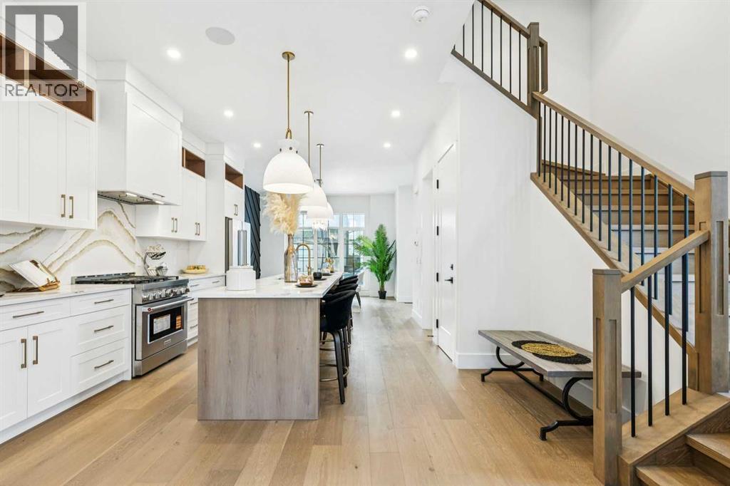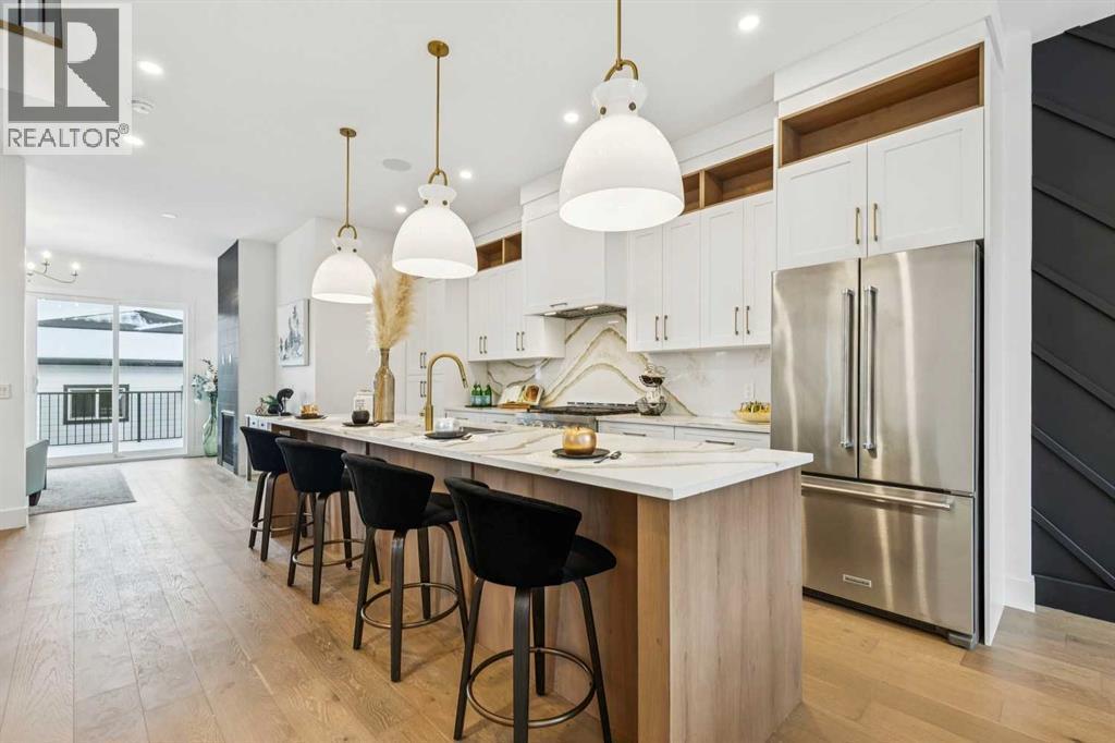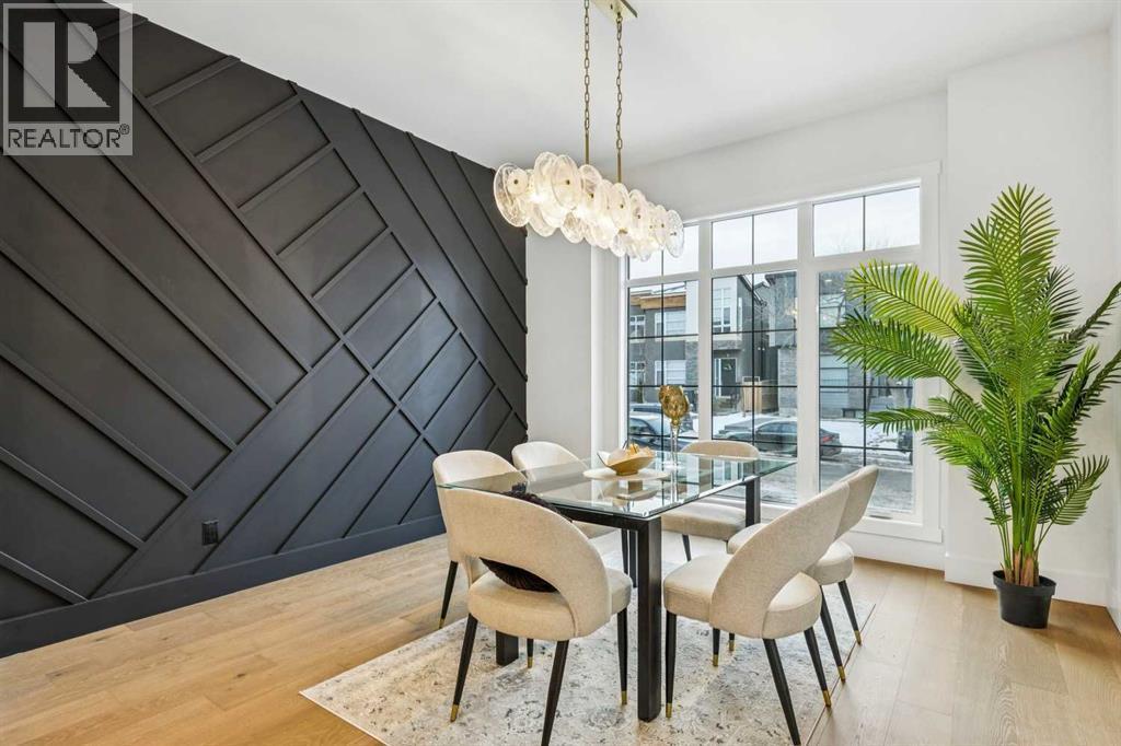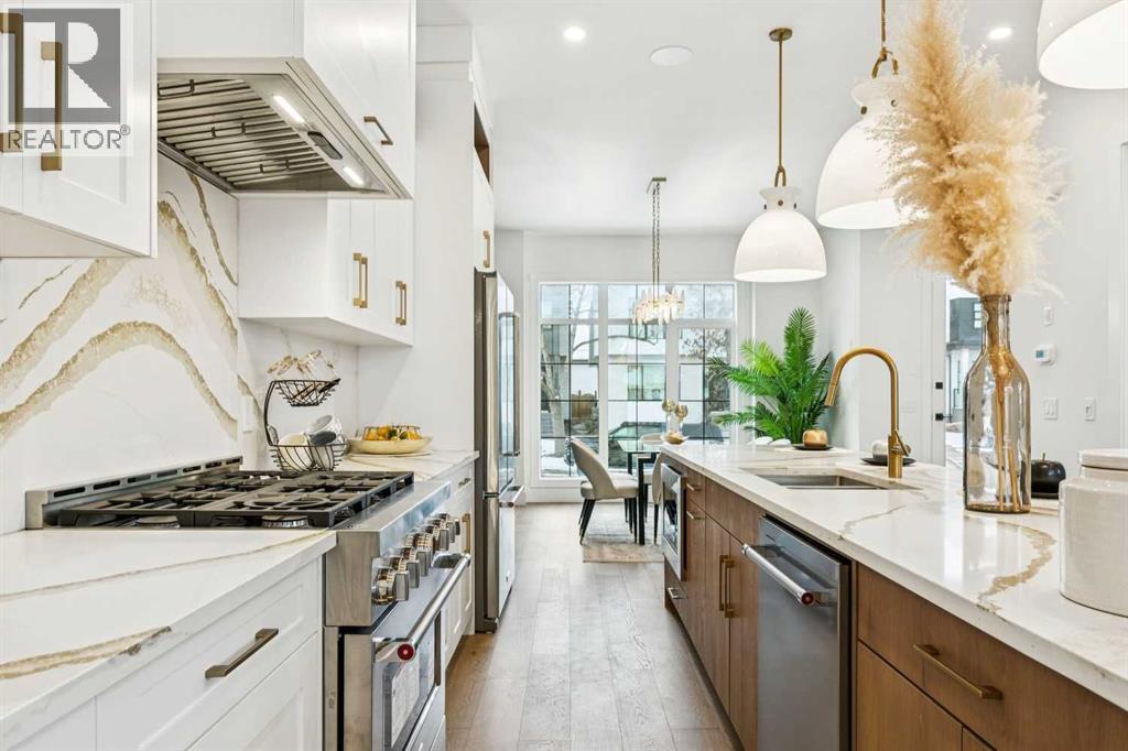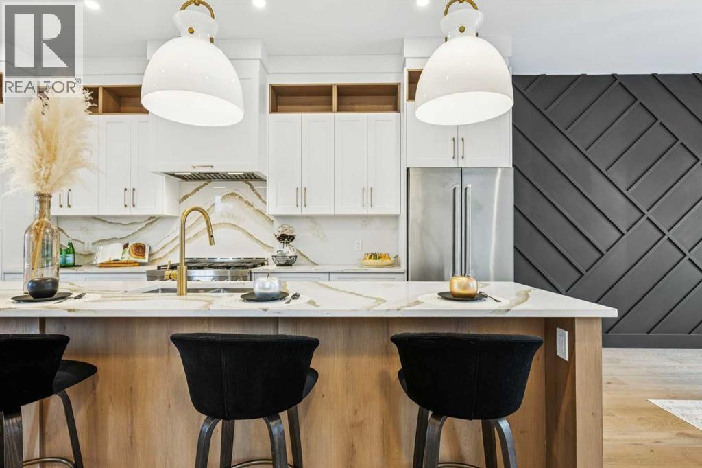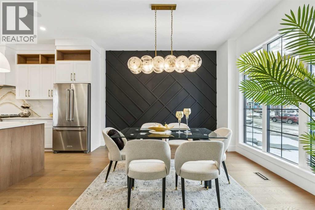 Introducing a remarkable new luxury infill in the heart of Killarney, offering nearly 2,000 sq ft of meticulously curated living space where architectural elegance meets modern comfort. Set in one of Calgary’s most coveted inner-city communities, this residence delivers a seamless blend of sophisticated design, airy openness, and refined functionality.A welcoming formal dining space makes an elegant first impression, setting the stage for the home’s elevated aesthetic. The space transitions beautifully into a show-stopping chef’s kitchen, anchored by a dramatic 12-foot quartz waterfall island that serves as both a design centrepiece and an entertainer’s dream. Premium finishes, clean lines, and thoughtful layout create a kitchen that is as beautiful as it is practical.Across from the kitchen, a light-filled executive office offers a quiet, polished environment for work or study. At the rear of the home, the living room exudes warmth and sophistication, highlighted by a sleek fireplace feature and expansive glass patio doors that open to the generous rear deck, creating an effortless indoor–outdoor lifestyle experience. A custom mudroom with built-in storage and a tastefully designed powder room complete the main level with both style and intention.Upstairs, the primary suite is a serene retreat defined by a vaulted ceiling, abundant natural light, and a spacious walk-in closet. The spa-inspired ensuite elevates daily living with designer tilework, dual vanities, and a sculptural freestanding soaking tub. Two additional bedrooms, a beautifully appointed main bath, and a convenient upper laundry room round out this thoughtfully designed level.The lower level showcases the builder’s signature extended LEGAL BASEMENT SUITE — a distinctive feature that provides exceptional additional living space and sets these homes apart. Bright, spacious, and beautifully finished, this private level includes a full kitchen, open-concept living area, two bedrooms, a versatile flex room, and dedicated laundry. Ideal for executive tenants, multi-generational living, or upscale guest accommodations, this extension of the home enhances both lifestyle flexibility and long-term investment value.Completing the property is a double detached garage with paved lane access, offering everyday convenience with a polished touch.With its elevated finishes, intelligent floorplan, abundant natural light, and exceptional location near parks, schools, amenities, and quick downtown connections, this home represents the perfect balance of luxury, comfort, and enduring value. (id:6769