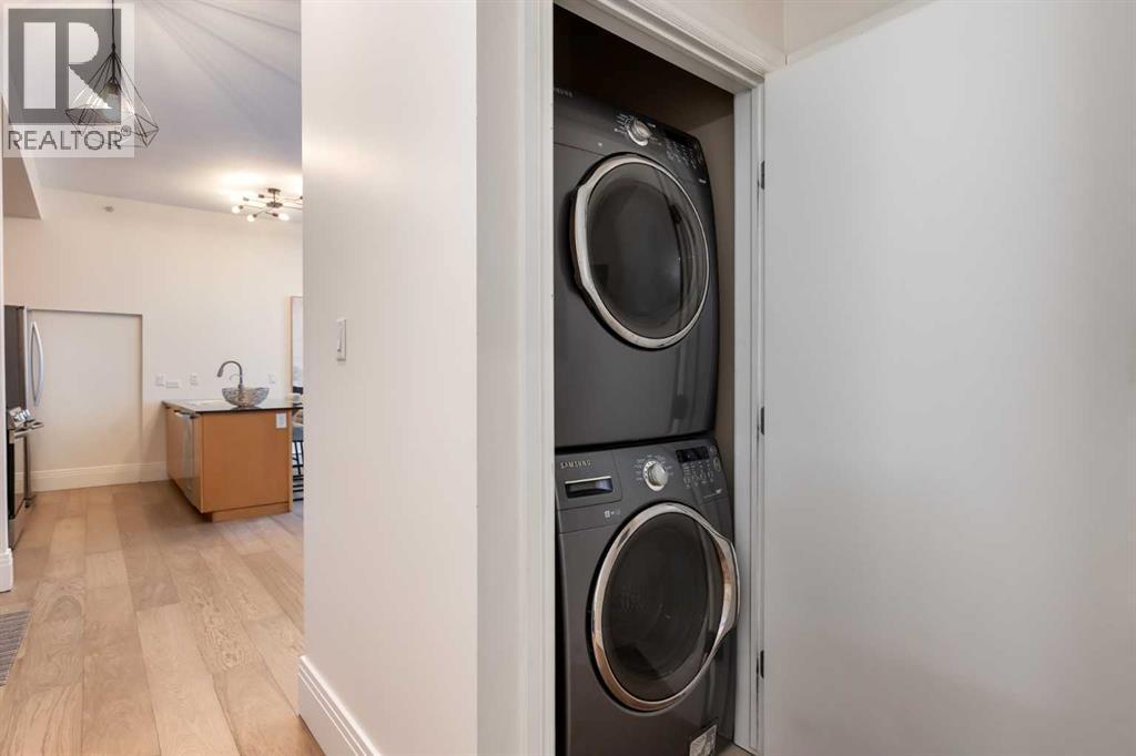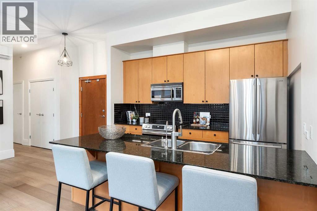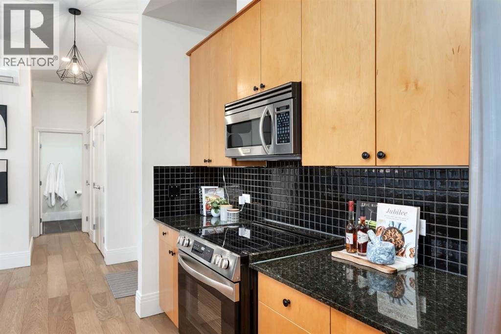 Step into this stunning 2-bedroom, 2-bathroom condo in one of Calgary's most sought-after inner-city neighbourhoods. With brand new hardwood flooring throughout and gorgeous wood-frame windows that flood the space with natural light, this home blends warmth and modern sophistication effortlessly.The open-concept living and dining area is anchored by a gas fireplace set against a striking dark feature wall, perfect for cozy evenings in. A sleek kitchen with granite countertops, stainless steel appliances, and a black tile backsplash flows seamlessly into the entertaining space, with bar seating at the island for casual meals.The generous primary bedroom easily accommodates a king-size bed with plenty of room to spare, and features a large walk-in closet and ensuite bathroom. One of this home's standout features is its private rooftop patio, a rare find! Offering sweeping neighbourhood views and the perfect spot for summer dinners and morning coffee. Speaking of coffee, there's a Starbucks on the main floor of the building for those on-the-go mornings.Additional highlights include underground parking, and condo fees that cover all utilities except electricity.Located in the heart of Bridgeland, you're steps from the pathways, local shops, plenty of restaurants, and just minutes to downtown Calgary. This is the lifestyle you've been looking for. (id:6769