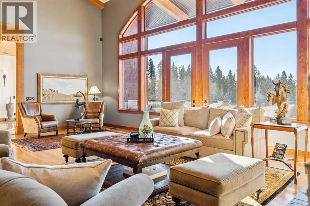 This is a property defined by lifestyle. From the moment you arrive at the secure electric gate and begin the gentle journey down the winding, tree-lined driveway, the outside world quietly fades away. Take a deep breath—what awaits is a rare sense of calm, privacy, and connection to nature. Perched above Fish Creek, this remarkable 7,222 sq. ft. bungalow commands breathtaking views of the creek below, open fields, rolling foothills, and distant mountain vistas. A wraparound deck spanning the south and west sides of the home invites you to fully embrace the outdoors—whether watching wildlife pass by, listening to the soft sounds of the creek, or enjoying sunsets that never disappoint. Step through the dramatic front entrance and you are immediately greeted by soaring vaulted ceilings, a stunning wall of windows, and uninterrupted views beyond. Custom stonework and timeless timber-frame construction define the home’s architectural character, creating a seamless blend of natural materials and refined craftsmanship. The expansive living spaces are perfectly designed for entertaining—whether hosting intimate gatherings or larger celebrations, indoors or out. This is a residence where the outdoors is intentionally brought in, offering warmth, scale, and a true sense of place. The gourmet kitchen features a generous dining area, an abundance of cabinetry and counter space, and a beautiful screened summer dining room—ideal for seasonal entertaining. Enhancing the lifestyle experience is an attached pool house complete with a 16' x 30' indoor heated pool, hot tub, games area, and a cozy sitting space with fireplace for year-round enjoyment. The primary retreat features soaring vaulted ceilings, a wood-burning fireplace, and two sets of patio doors leading to the deck and pool area. The luxurious ensuite offers a two-person air tub, double vanities, walk-in shower, and a spacious walk-in closet with floor-to-ceiling built-ins. The main floor office showcases distinctive copp er ceiling details, a charming pot-belly stove, and two sets of custom built-in drawers and cabinetry. An attached private cabin provides ideal accommodations for children, a nanny, or staff, complete with its own kitchen, two bedrooms, living area, and full bathroom. The fully developed lower level offers a spacious recreation room with wood-burning fireplace and walkout to a covered patio. Additional features include a wet bar, sauna, cedar closet, back up gas generator, generous storage, a four-piece bathroom, and a large bedroom.For equestrian enthusiasts, the property is exceptionally well-appointed with a four-stall barn, multiple paddocks, open grass riding ring, open pasture, and a fenced in riding arena . The only thing missing? A one-way road sign at the entrance—because once you arrive, you may never want to leave. (id:6769