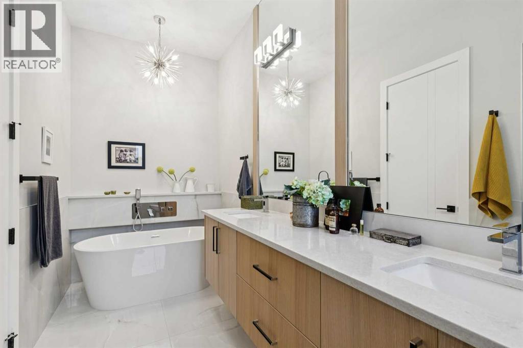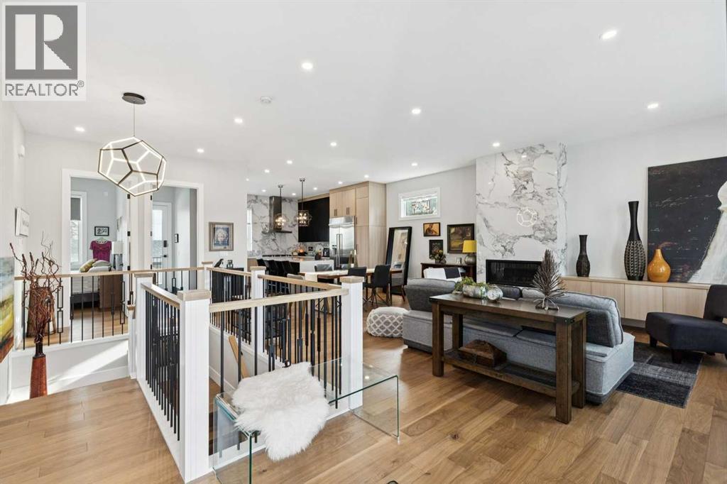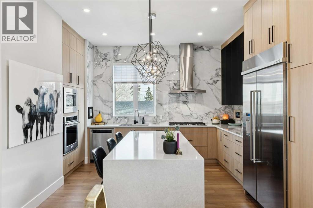 This modern masterpiece has been completely transformed from the foundation up, combining exceptional craftsmanship, custom finishes, and luxurious details throughout. Spanning over 2,900 sq. ft. of thoughtfully designed living space across two levels, with four elegantly appointed bedrooms, this custom bungalow epitomizes refined luxury in the highly sought-after family neighbourhood of Haysboro. Set on an oversized 50’ x 140’ lot on one of the community’s most serene, tree-lined streets, the property includes a triple garage with a fully serviced 839+ sq. ft. workshop/studio above, offering extraordinary potential for a guest house, home office, gym or private studio. The expansive grounds provide privacy, mature landscaping, and generous outdoor entertaining space, rare in inner-city living. Extensive structural enhancements include an extended and raised foundation, creating soaring ceiling heights and expanded square footage on both levels. The sun-filled main floor boasts 10-foot ceilings, walnut hardwood floors, and a sophisticated open-concept layout designed for both everyday living and elegant entertaining. The gourmet designer kitchen features built-in KitchenAid appliances, an oversized 48” refrigerator, full-height porcelain slab backsplash, premium lighting, and flows seamlessly into the living area, anchored by a 42” Napoleon gas fireplace. The main level includes two luxurious bedrooms, each with its own private ensuite, including a serene primary retreat with a spa-inspired 6-piece ensuite, premium fixtures, and a discreet hidden entry to the walk-in closet. A stylish powder room completes the main floor. The fully developed lower level continues the elevated design with 9-foot ceilings, a generous recreation and entertaining area with custom wet bar, and two additional large bedrooms connected by a Jack-and-Jill 5-piece bathroom, ideal for a growing family or private guest quarters. Outdoors, the private, professionally landscaped backyard offers a tranquil oasis, perfect for relaxing or entertaining. Ideally located in Haysboro, the home is steps from parks, playgrounds, walking paths, and green spaces, and minutes from top-rated schools, Chinook Centre, Rockyview Hospital, and major transit routes including LRT access. Quick connections to downtown and major roadways make commuting effortless, while the neighbourhood’s mature trees, strong community spirit, and family-friendly atmosphere enhance long-term desirability. A rare, one-of-a-kind offering, defined by meticulous attention to detail, high-end finishes, sophisticated architectural planning, and an exceptional location. Book your private viewing today! (id:6769