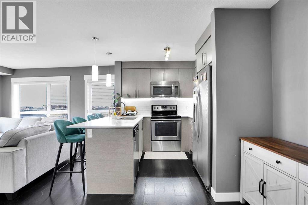 Welcome to this stunning top floor corner unit, offering exceptional privacy, designer finishes, and two titled parking stalls; Flooded with natural light from expansive windows on two sides, this home features an open and airy layout that seamlessly connects the living and dining areas. Step out onto the private balcony to enjoy beautiful views perfect for summer BBQs or unwinding at the end of the day. The chef inspired kitchen is a true showpiece, showcasing ceiling height cabinetry, quartz countertops with an undermount sink, a modern breakfast bar, classic white subway tile backsplash, stainless steel appliances. Designed with today’s lifestyle in mind, the floor plan includes a spacious primary suite with a walk through mirrored closet and a private ensuite. A second bedroom with its own full bathroom offers ideal separation for guests or roommates. A built-in desk creates the perfect work from home nook, and the convenience of in suite laundry enhances everyday living. Located within walking distance to schools, parks, shopping, and essential amenities, this home delivers outstanding value in a highly desirable location. Book your private showing with your favorite Realtor today! (id:6769
