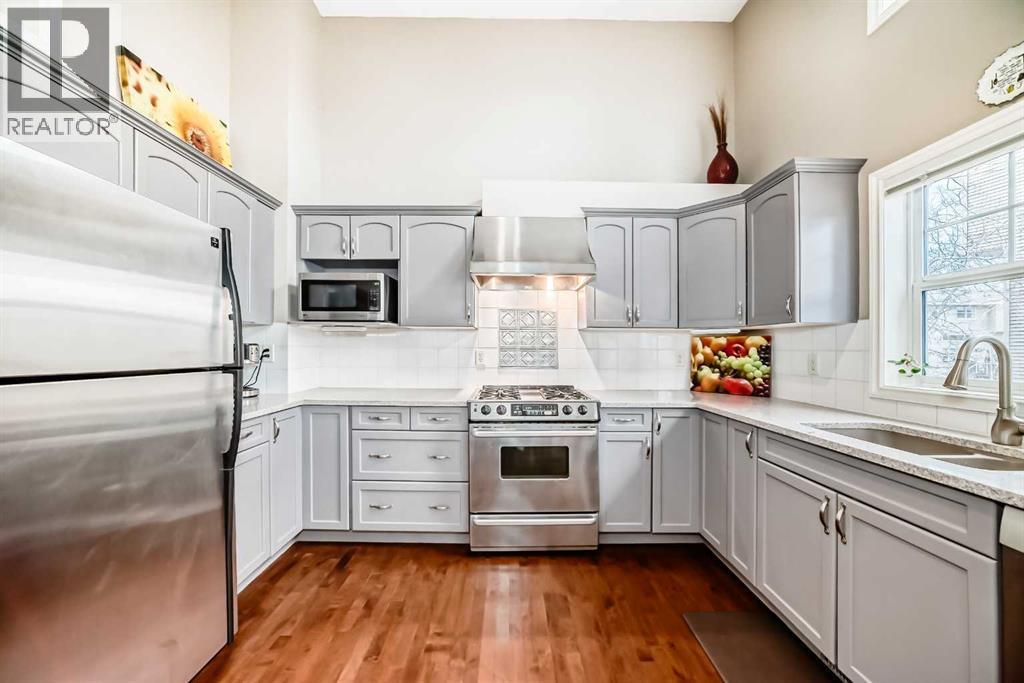Tucked away on a quiet cul-de-sac in Inglewood, this beautifully maintained townhome offers the perfect blend of riverside nature and inner-city convenience. A charming walking path winds between ponds and streams directly behind the home, connecting to the extensive Bow River pathway system and nearby Pearce Estate Park. You’re just steps to Harvie Passage, the river, and scenic green spaces, and only a short stroll to Inglewood’s vibrant shops, restaurants, and entertainment district on 9th Avenue SE.The spacious updated kitchen and dining area feature dramatic vaulted ceilings, quartz countertops, painted cabinetry (2019), stainless steel appliances including a gas stove, and hardwood flooring. This bright space opens onto a private back deck with a gas line for your barbecue, making it ideal for everyday living and entertaining. A sunny front perennial garden adds great curb appeal.Hardwood flows up to the inviting living room, filled with natural light from large windows overlooking the promenade and green space. A cozy gas fireplace anchors the room, and a stylish designer half bath completes this level, giving the main living area a warm, welcoming feel.Upstairs you’ll find two generous bedrooms, each with its own ensuite and walk-in closet, providing excellent privacy for owners, guests, or roommates. A versatile open nook on this level works perfectly as a home office, reading corner, or yoga space, with pleasant views to the surrounding trees.The finished lower level offers a great bonus area currently used as an office, along with laundry and ample storage. Additional upgrades include a newer hot water tank (2015) and well-maintained interior finishes, making this home move-in ready.With its quiet cul-de-sac location, direct access to pathways, proximity to the Bow River, Pearce Estate Park, Harvie Passage, and the heart of Inglewood, this townhome delivers a sought-after lifestyle of walkability, recreation, and charm. (id:6769