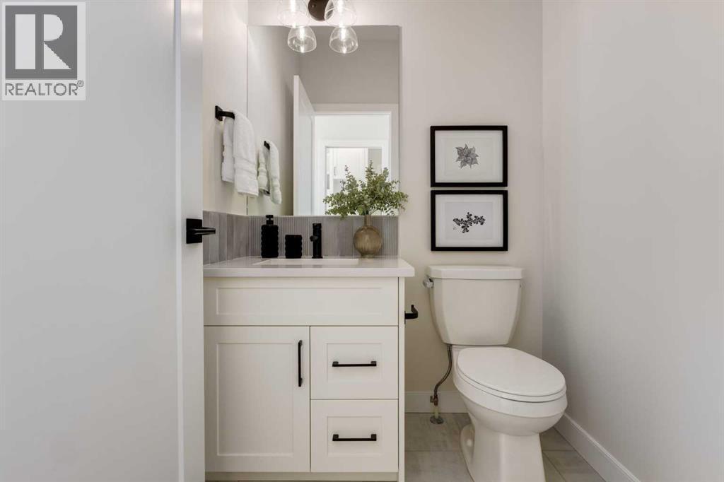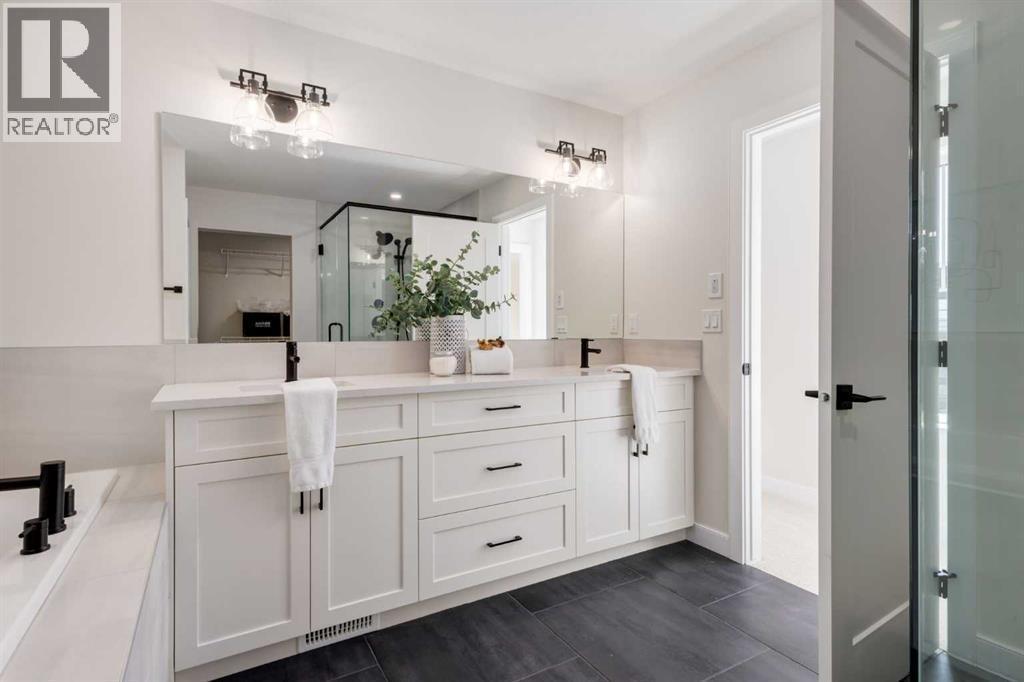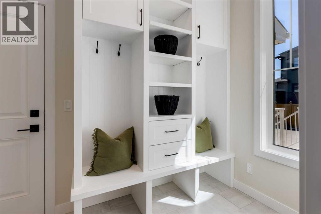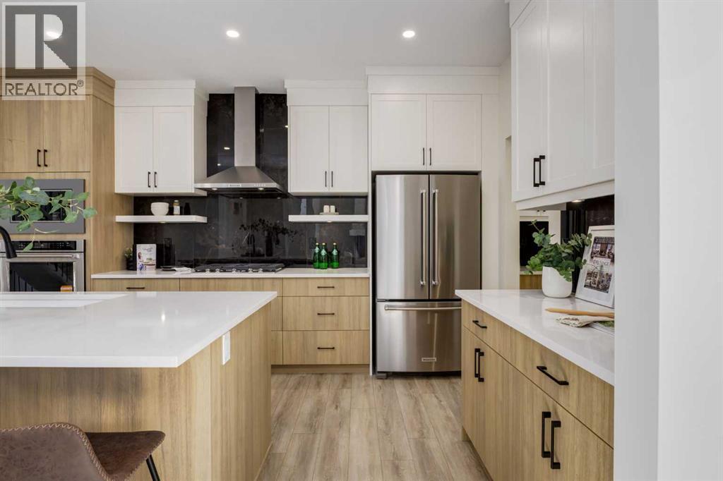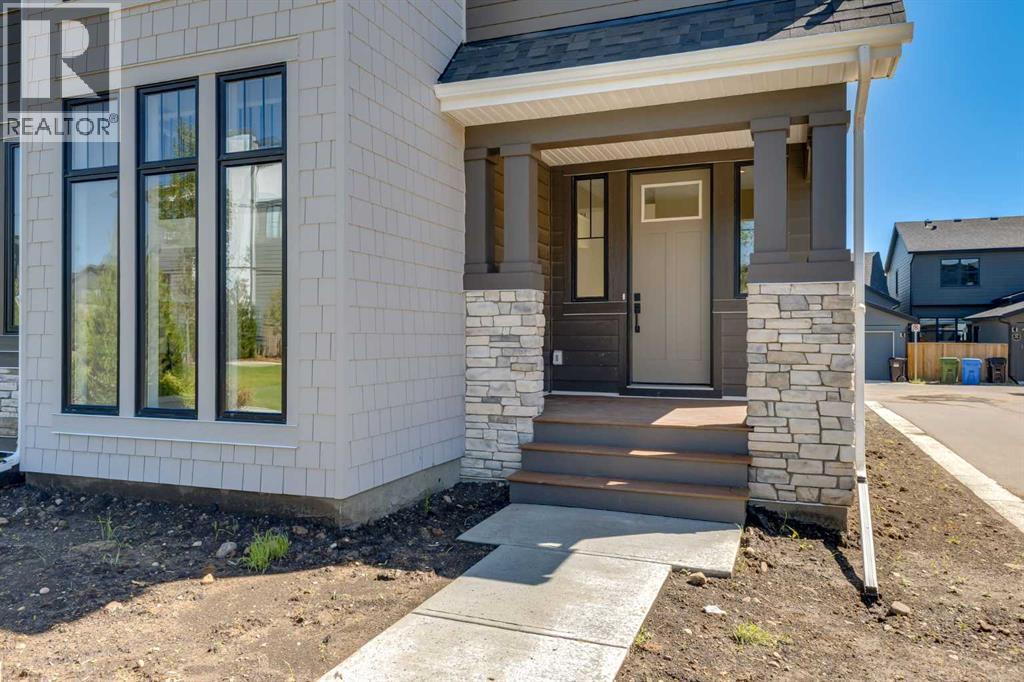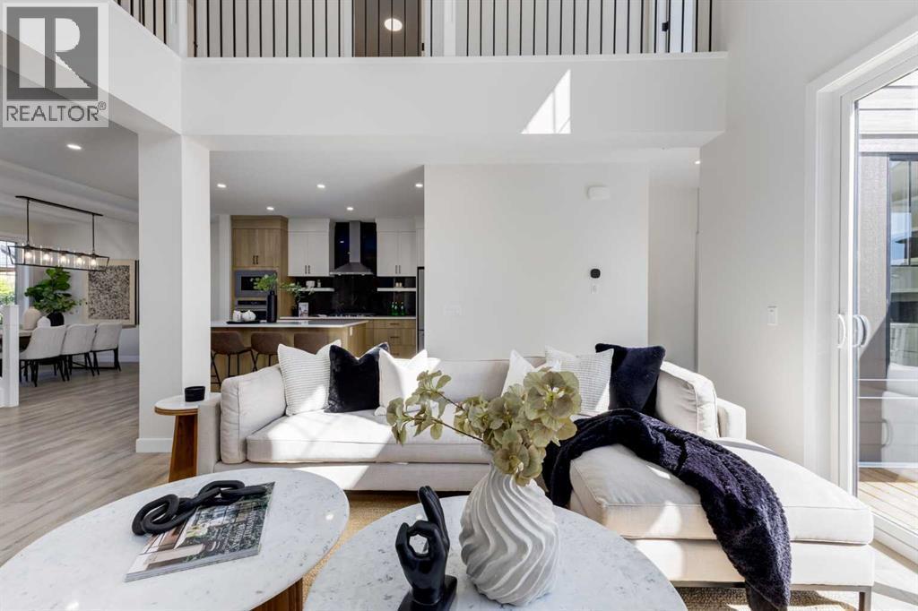 Welcome to the Engler, an architectural two-storey that pairs standout design with day-to-day function, set in a prime front-facing position on Hearth Green. With the park right out front, you’ll love having a natural gathering place for kids to run, neighbours to connect, or a quiet evening by the community firepit. Inside, the home makes an immediate impression with an open-concept plan filled with natural light, soaring two-storey windows, and a dramatic floating staircase with open black railing that keeps sightlines wide and the vibe airy. The kitchen is the true centrepiece, equal parts beautiful and practical, finished with two-tone cabinetry (white uppers raised to the ceiling and rich wood-grain lowers), crisp white quartz countertops, a white Silgranite sink, sleek black hardware, and a bold black backsplash that brings the whole look together. Cooking is a treat with a gas range plus built-in oven and microwave, while the open shelving beside the hood fan adds the perfect modern touch for styling and everyday convenience. Entertaining is effortless thanks to the full butler’s bar, complete with a sink and space for an additional fridge or freezer, ideal for hosting, family movie nights, or keeping things organized when life gets busy. The dining area is bright and welcoming with a statement light fixture and sun pouring in throughout the day, flowing seamlessly into the open-to-above living room where a modern black tile fireplace surround mirrors the kitchen finishes for a cohesive, designer feel. At the back of the home, thoughtful locker-style built-ins and generous mudroom storage keep backpacks, boots, and winter gear neatly tucked away, because real life happens here, and this home is built for it. Upstairs, the winged bedroom layout creates privacy and smart separation: the vaulted owner’s suite overlooks the backyard, while the secondary bedrooms are positioned at the front of the home. You’ll appreciate the balance of comfort and function with a spa-inspired ensuite, a spacious five-piece main bath for the kids, and a large upper laundry room that makes the daily routine smoother. The open-to-below upper hallway adds a loft-like feel and reinforces the bright, expansive atmosphere created by the home’s abundant windows. Downstairs, 9’ foundation walls offer excellent future development potential and a more open, comfortable basement feel. Outside, step onto your deck right off the patio doors, perfect for summer BBQs and morning coffee, plus enjoy the convenience of an attached double garage. Set in Alpine Park, this home is surrounded by a community built around connection: parks, pathways, and a future village centre with local shops and cafés on the way. With design inspired by Calgary’s mountain, prairie, and urban influences, Alpine Park is crafted to encourage neighbourliness, and the Engler is a perfect match for that lifestyle. (id:6769