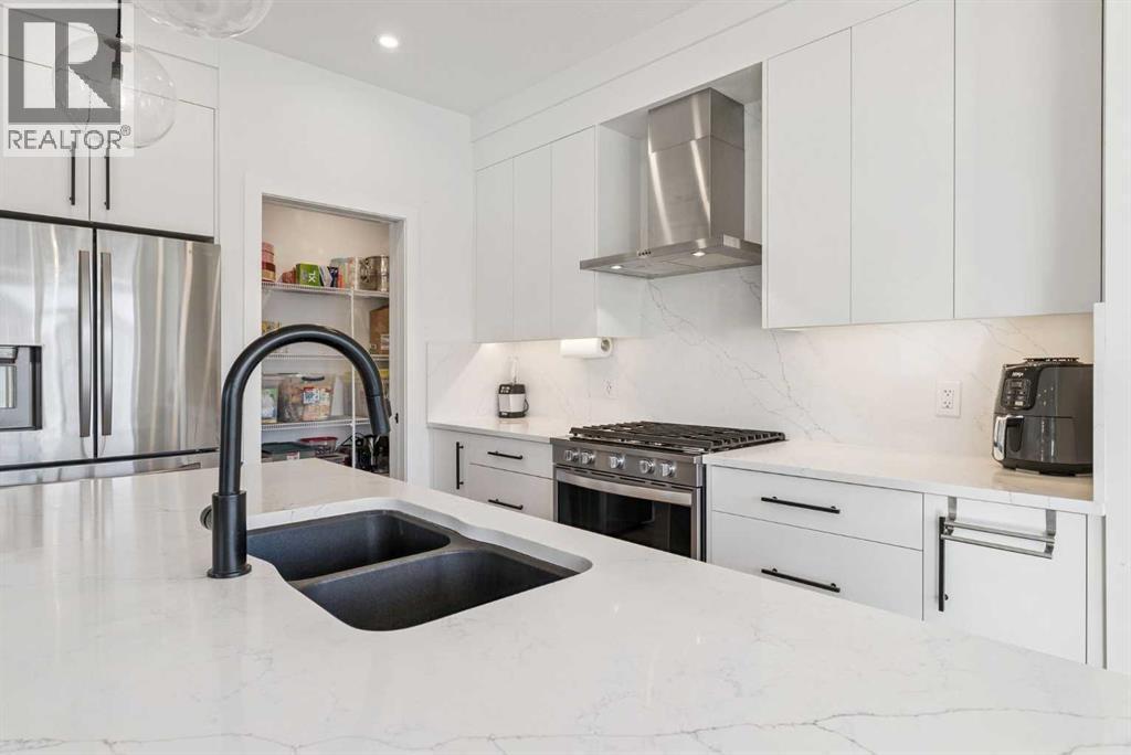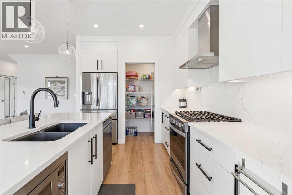 Experience elevated living in ARCOLA by Truman, a contemporary townhome community. It’s not just a townhouse, but it is more likely a luxury downsizing home where you can enjoy lifestyle with convenience and style. This END-UNIT home is perfectly positioned in a quiet neighbor providing more privacy and bit more space. It offers 2 balconies, 1 patio, over 2,400 sqft of living space including fully developed WALK-OUT basement, featuring 4 bedrooms (3+1) and 3.5 bathrooms. From the moment you step inside and greeted by gorgeous tiled foyer and 9ft ceiling, you’ll be wowed and appreciate the designer’s touch and bright, open-concept layout. Luxury vinyl prank flooring throughout in all three levels, and no more ugly carpet in this home. 9ft ceilings in main level and the basement. The spacious living area is filled with natural light and provides ample space for relaxing and entertaining. The kitchen is showcasing premium quartz countertop, stainless steel appliances, including T-shaped chimney and gas stove, generous cabinetry, spacious corner pantry, and a large central island with seating, plus there are dedicated dining area and convenient powder room to complete the main floor. Off to the balcony for alfresco lunch or evening wines or sunbathing. Upstairs, retreat to a spacious primary suite featuring a walk-in closet and a spa-inspired 5-piece ensuite with dual sinks and a deep soaker tub on gorgeous tiled floor. Step out to a dedicated balcony from your bedroom to enjoy a cup of coffee and mountain view. Two additional well-sized bedrooms, each with its own walk-in closet, and there is a full bathroom and upper-level laundry room. The fully developed WALK-OUT basement expands your living space with a cozy family room ideal for movie nights or home office or gym, a fourth bedroom, and an additional full bathroom make a perfect living space for over night guests and teen ager children or rent it out for additional income. The heated double garage can fit two cars and still providing additional storage space for all your seasonal gears. Additional upgrades are garburator, ceiling fan and air conditioner for comfortable living. The layout of this townhouse was one of the top seller and is not coming to the market very often. Not to mention just minutes from top-rated schools, Westside Rec Centre, parks, playgrounds, shops, restaurants, cafes, major roads, and public transit to have ultimate balance of lifestyle and accessibility. Don't miss this golden opportunity. Book your showing today! (id:6769