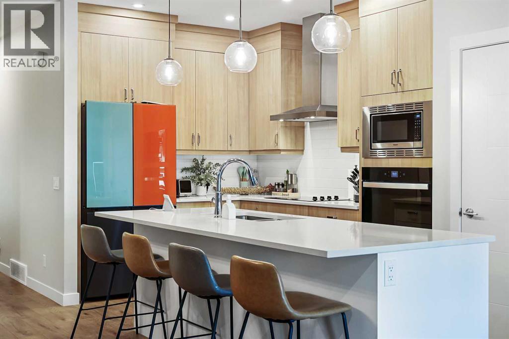 Welcome to this stunning and highly customized Brookfield 2-storey home in the vibrant, amenity-rich community of Seton — where modern design meets timeless comfort. Showcasing nearly 2,000 square feet above grade, this exceptional residence has been thoughtfully upgraded and enhanced with personalized touches that elevate its style and function. From the moment you arrive, the home’s inviting exterior, accented by rich colours, charming front porch, and architectural details, hints at the sophistication that awaits inside. Step into the main living area, where 9-foot ceilings and premium finishes create a sense of openness and warmth. The living room immediately draws your attention with its floor-to-ceiling shiplap feature wall, floating shelves, and a striking marble-inspired fireplace—a perfect blend of modern elegance and cozy character. Flowing seamlessly from the living space, the Chef’s Gourmet kitchen impresses with full-height cabinetry with rise and crown moulding, built-in wall oven and microwave, sleek cooktop with a chimney-style hood fan, and an expansive quartz island with a flush eating bar. The Arctic white tile backsplash and Blanco undermount sink add a refined finishing touch, while upgraded Cartwright lighting fixtures illuminate the space with designer flair. The dining area, brightened by an additional side window, creates the perfect setting for family meals and entertaining alike. Just beyond, a private main floor bedroom with a full three-piece ensuite featuring a glass-enclosed walk-in shower and floor-to-ceiling tile offers versatility for guests, multi-generational living, or a home office. The rear entry door, framed with encased glass, allows sunlight to sweep through the home and connect the indoors to the outdoors effortlessly. Upstairs, discover three additional spacious bedrooms, each enhanced with custom feature walls. The primary suite is a retreat of its own, showcasing a five-piece spa-inspired ensuite with dual undermount sin ks, quartz counters, and a walk-in closet. The centralized family room—perfect for movie nights—cleverly separates the primary suite from the secondary bedrooms, adding privacy and balance to the upper floor. A well-appointed laundry room with built-in counter and storage and a full bath complete this level. The lower level has been thoughtfully roughed-in for a future secondary suite (subject to approval and permitting by the city/municipality), featuring 9-foot foundation walls, rough-ins for a second laundry, kitchen plumbing, and full bathroom—a smart investment for future flexibility. Modern efficiency features include triple-glazed windows, an 80-gallon water tank, smart thermostat, Heat Recovery Ventilator, and knockdown ceilings throughout. Step outside to a beautifully finished backyard, complete with a massive covered deck—ideal for entertaining year-round—and an upgraded double detached oversized garage. (id:6769