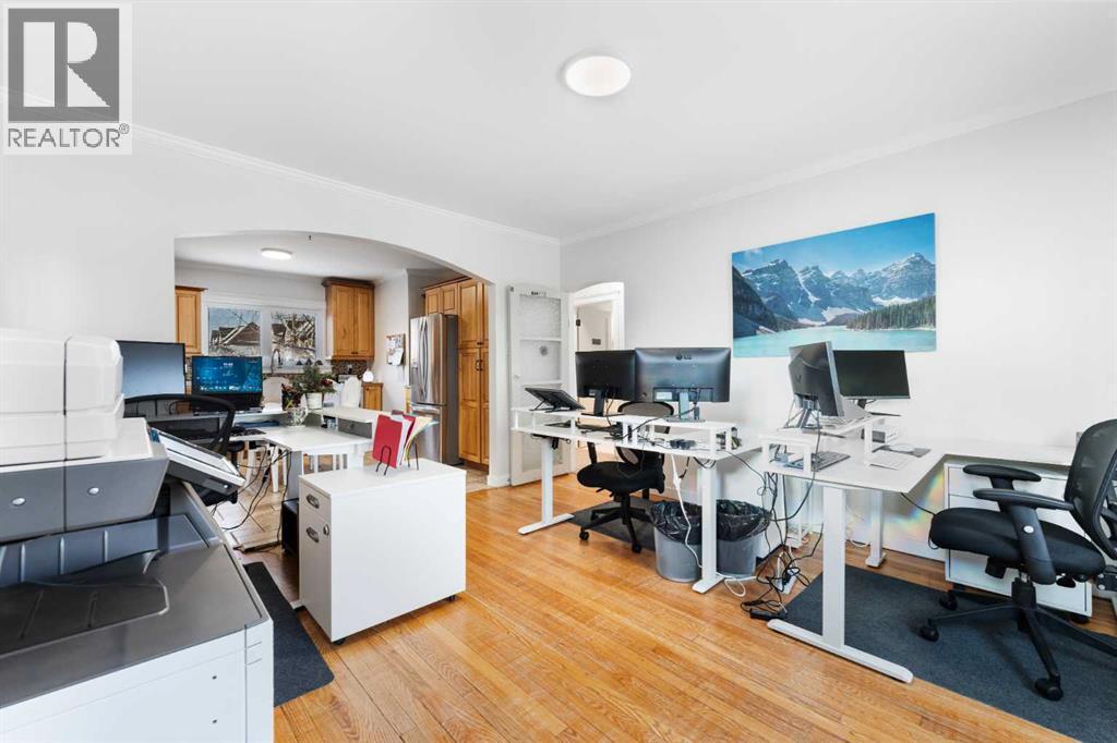 Located in Cochrane, this commercial bungalow in a residential style setting offers a flexible workspace suitable for a variety of business uses. Currently occupied by a professional services office, the property is laid out to accommodate both open work areas and private rooms. Added feature for this property included for a live/work setup. Zoned C-T (Commercial Transition) approved uses include professional and business offices, financial and health services, childcare and day home operations, artist studios, personal services, select retail uses, and home occupations (Class 1 & 2). The main level includes a functional kitchen and dining area with stainless steel appliances, a spacious office near the entry, two additional office or meeting rooms, and a 4-piece bathroom. The fully finished lower level provides a large open workspace, two enclosed rooms, a 3-piece bathroom, and a dedicated laundry area with sink and storage. A fenced backyard with patio and mature landscaping offers outdoor space for staff, while the front porch and maintained yard create a professional first impression. The property offers central air conditioning for year-round comfort and a single detached garage for added convenience. This unique mixed-use property combines residential comfort with the functionality of a commercial space. (id:6769