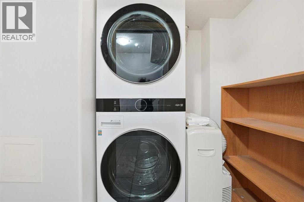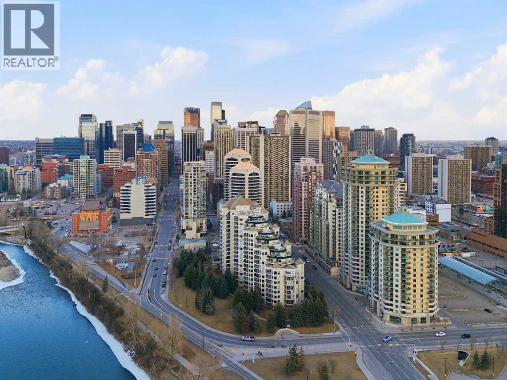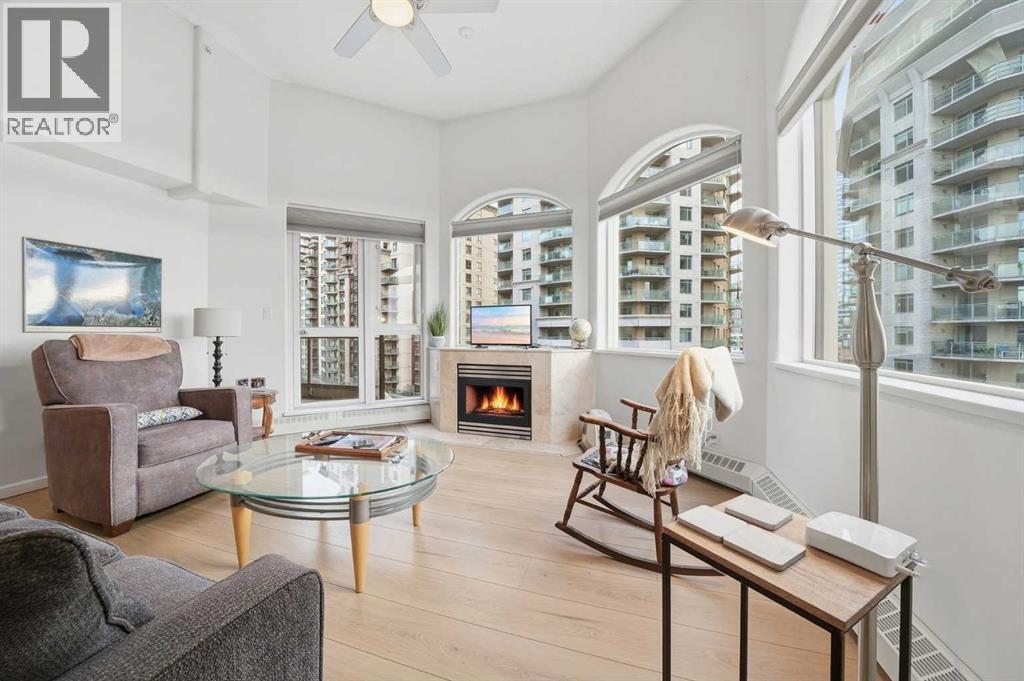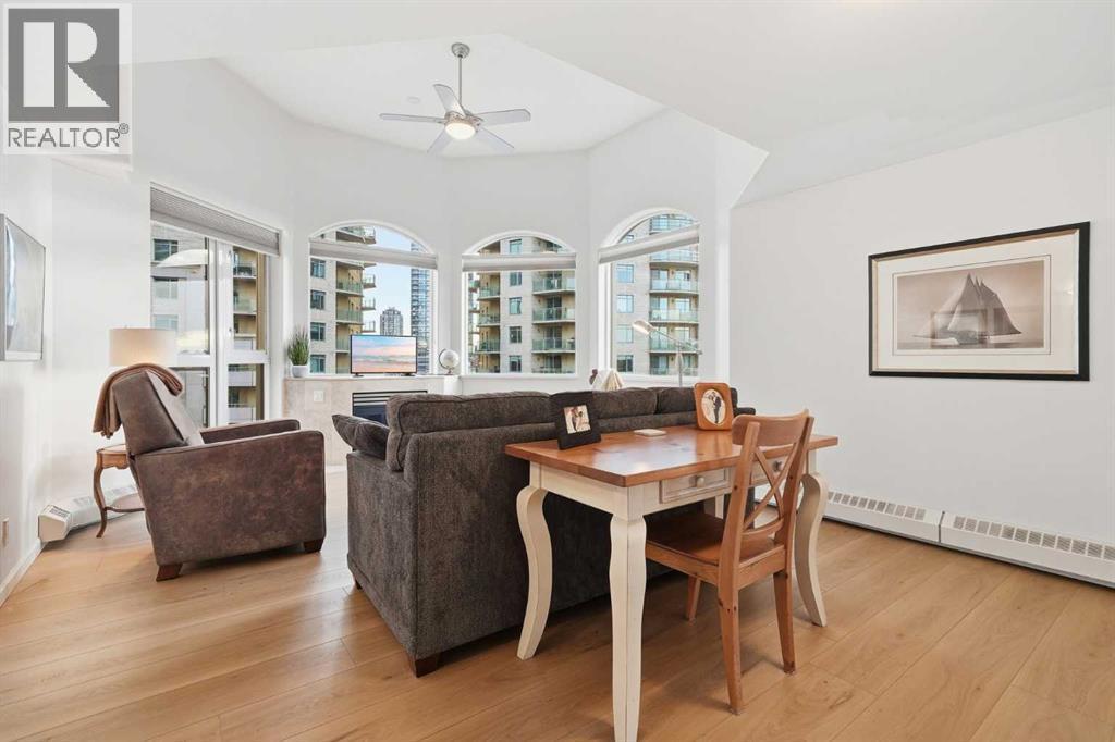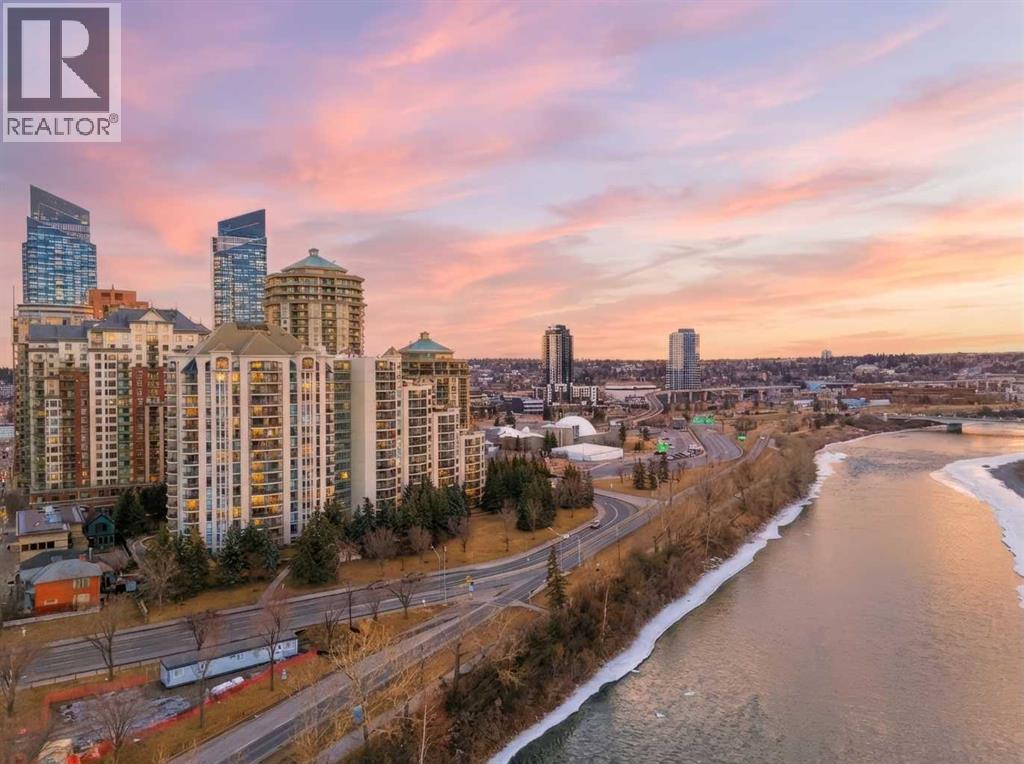 Enjoy living in a rare top-floor unit with rare VAULTED ceilings and WEST views next to the Bow River at The Marquis. This 2-bedroom, 2-bathroom unit includes TWO underground side-by-side parking stalls and is located on the southwest corner with a large south-facing balcony and oversized windows throughout.With over 1,200 sq ft of living space, this floorplan is one of the few top-floor units with 13-ft ceilings and no one above. The kitchen features granite countertops, ample storage, and open views to the dining area surrounded by floor-to-ceiling windows.The living room includes a gas fireplace, vaulted ceilings, and access to the balcony. Light oak laminate flooring runs throughout, and the unit has been recently repainted.Both bedrooms have access to separate bathrooms and direct access to the oversized balcony. The primary bedroom includes dual closets and a 4-piece ensuite. The second bedroom features a custom Murphy bed. There is also an in-suite laundry room with storage.Steps to the Bow River pathways and cycling routes, one block to the LRT, and walking distance to restaurants and groceries. Well-managed building with a renovated lobby, mail area, gym, party room, and private courtyard. This is an amazing location and a perfect long term home! (id:6769