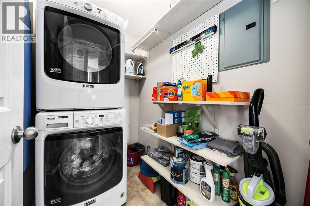 Welcome to one of the largest and most desirable units in this centrally located downtown Cochrane complex! This beautifully maintained 2 bedroom, 2 bathroom condo offers an exceptional open concept layout with stunning hardwood flooring and a bright, functional living space perfect for both everyday living and entertaining. The updated kitchen features quartz countertops, modern finishes, and a brand new dishwasher, flowing seamlessly into the spacious dining and living areas.Step outside to your massive 172 sq/ft balcony, an incredible extension of your living space and the perfect spot to relax, BBQ, or enjoy the views. The primary suite includes a renovated ensuite, while the second bedroom and bathroom have also been tastefully updated. You’ll love the oversized in-suite laundry room with newer washer and dryer and an abundance of storage.This unit comes with rare and valuable extras including titled underground parking, titled underground storage, PLUS an assigned above-ground parking stall with plug, ideal for Alberta winters. Additional upgrades include new water shut-offs for added peace of mind.All of this in a prime downtown Cochrane location, just steps to shopping, restaurants, pathways, and amenities. Spacious, updated, and incredibly well appointed, this is condo living at its best. (id:6769