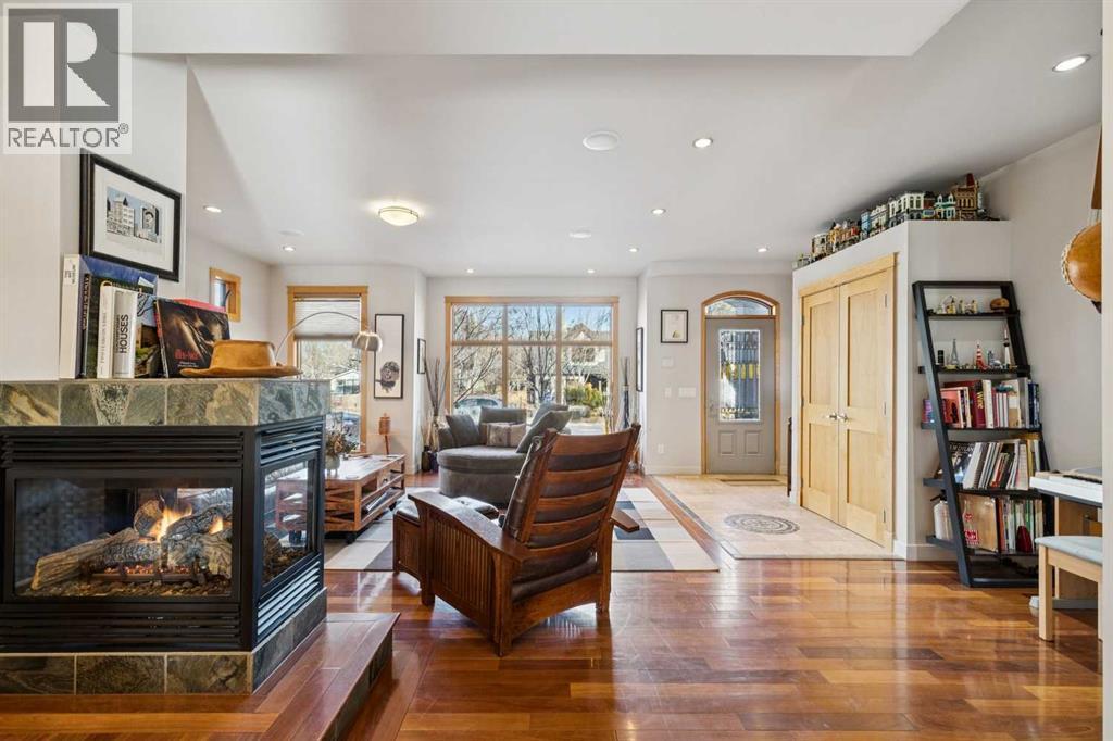 Nestled on a quiet, tree-lined cul-de-sac in sought-after West Hillhurst, this custom-built (2008) detached home offers over 3,700 sq ft of thoughtfully designed living space. Ideally located near schools, Kensington, shopping, the Bow River pathway system, downtown, and major hospitals, the setting seamlessly combines inner-city convenience with the tranquility of a low-traffic street. The bright, open main level is designed for both everyday living and entertaining. A spacious front living room is elegantly separated from the dining area by a three-sided gas fireplace. The expansive kitchen features premium appliances, extensive cabinetry, and a large, functional island. Just off the kitchen, a generous mudroom and private powder room provide practical separation for busy family life. Upstairs, the second level offers two well-proportioned bedrooms with ample closet space and a full four-piece bath. The primary retreat is a true sanctuary, complete with vaulted ceilings, its own gas fireplace, custom built-in cabinetry, a large walk-in closet, and a beautifully appointed ensuite featuring a tiled walk-in shower, fully jetted tub, and double vanity. A full laundry room completes this level. The third floor presents a versatile loft with skylights, south-facing windows, and a full four-piece bathroom with additional storage, creating a warm and inviting space ideal for entertaining, a home office, or a guest suite. The fully developed basement includes a flexible bedroom or exercise room with a walk-in closet, along with a spacious recreation room featuring a wet bar—perfect for family gatherings or movie nights. Additional features include hardwood and tile flooring throughout (no carpet), multi-zone built-in sound wiring, central air-conditioning, low-maintenance landscaping, a sunny south-facing backyard with stamped concrete patio, and a double detached garage. Solidly constructed and meticulously maintained, this timeless home was designed to endure for gene rations. (id:6769