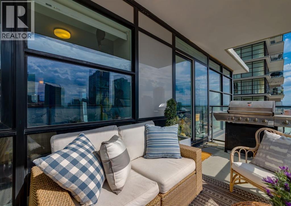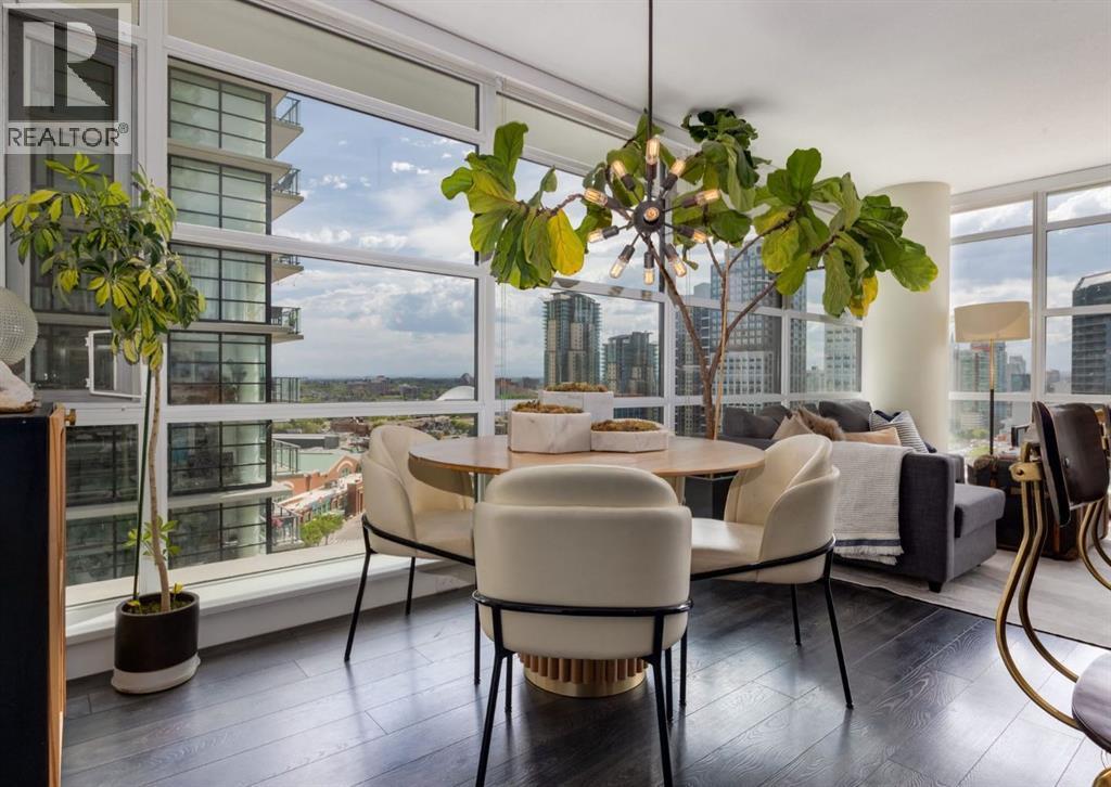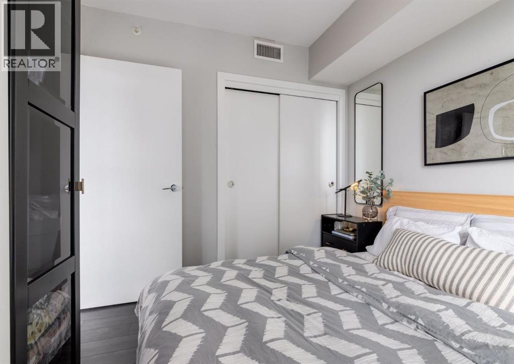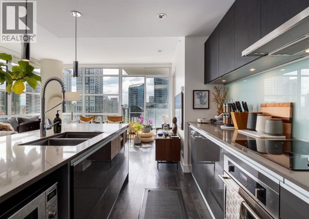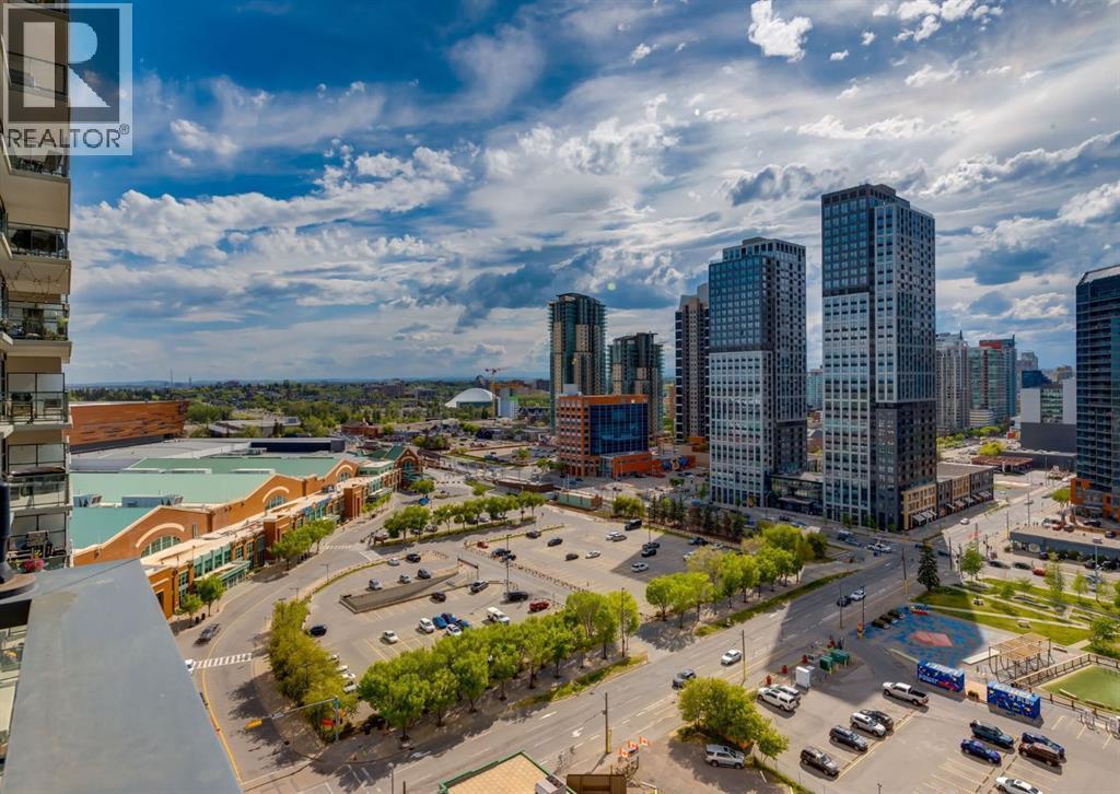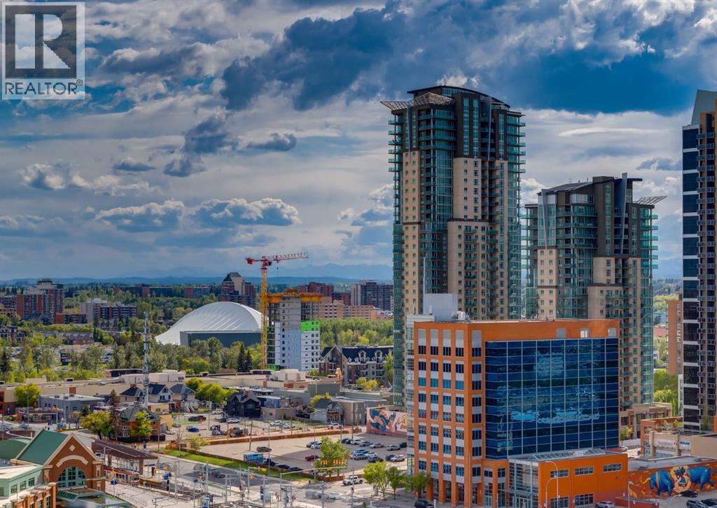 CITY & MOUNTAIN VIEWS from this stunning southwest corner unit! This bright and welcoming open-concept home is filled with natural light and offers 2 bedrooms, 2 full bathrooms, tandem titled parking for two vehicles, and a large balcony with breathtaking views you’ll enjoy every day. The modern kitchen features sleek cabinetry, stainless steel appliances including panelled refrigeration, quartz countertops, and plenty of storage. The primary bedroom easily fits a king-size bed and includes a walk-through closet with custom built-ins leading to a contemporary ensuite. The second bedroom is conveniently located next to a full 3-piece bathroom—perfect for guests, roommates, or a home office. Enjoy the perks of this executive concrete building, which offers concierge service, a fitness centre, party room, rooftop terrace, workshop, air conditioning, high-speed elevators, visitor parking, and a separate assigned storage locker. Impeccably maintained by its original owners, this move-in-ready home is also pet friendly (with board approval) and ideally located—just steps from Pixel Park, river pathways, the LRT, Stampede Grounds, Central Library, restaurants, cafes, shops, and groceries. Floor plans and a 3D tour are readily available, providing a glimpse into this stylish condo! (id:6769