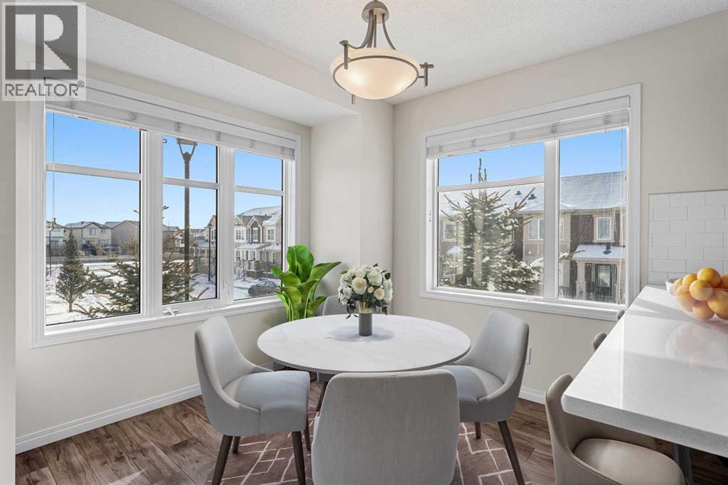 A bright corner townhome with NO CONDO FEES in one of Southwinds’ most connected and amenity-rich locations.Steps from green space, playgrounds, and pathways. Enjoy evening walks around the environmental reserve and pond, let the kids burn energy at the nearby zipline and rock-climbing playground, or take advantage of the growing list of neighbourhood favourites just minutes away — Balzac Brewery, The Cravery, Seven Saints Boutique. The brand-new K-9 Southwinds School currently under construction and the site of Airdrie’s future West Side Recreation Centre nearby. Easiest Commute in Airdrie - to Calgary or across to east side - this pocket of Airdrie continues to strengthen its long-term family appeal.Offering over 1,500 sq ft of developed living space across three finished levels, this corner-lot end unit benefits from additional windows that flood the home with natural light. The ground level welcomes you with a spacious foyer and a versatile flex room — ideal as a home office, workout space, playroom, or additional lounge. A single attached garage, full driveway, and extra storage add everyday practicality.The open-concept level is designed for both comfortable living and entertaining. The kitchen showcases quartz countertops, stainless steel appliances, generous cabinetry, and a large island with breakfast bar seating. The kitchen flows seamlessly into the dining area surrounded by windows and light. A bright living room, with direct access to an east-facing private covered balcony — perfect for morning coffee or summer BBQ evenings. A convenient powder room and upper-level laundry complete this floor.Upstairs, you’ll find three well-sized bedrooms, including a relaxing primary retreat with picture corner windows, a walk-in closet, and a bright ensuite featuring its own window that fills the space with natural sunshine. Two additional bedrooms and a full bath provide flexibility for families, guests, or work-from-home needs.As a freehold property, you have the unique opportunity to fence the large lot to create your own private yard oasis (subject to City bylaw setbacks and approval for fencing). With its smart layout, abundant natural light, unbeatable location, and freedom from condo fees, this home truly delivers both lifestyle and value in the heart of Southwinds. (id:6769