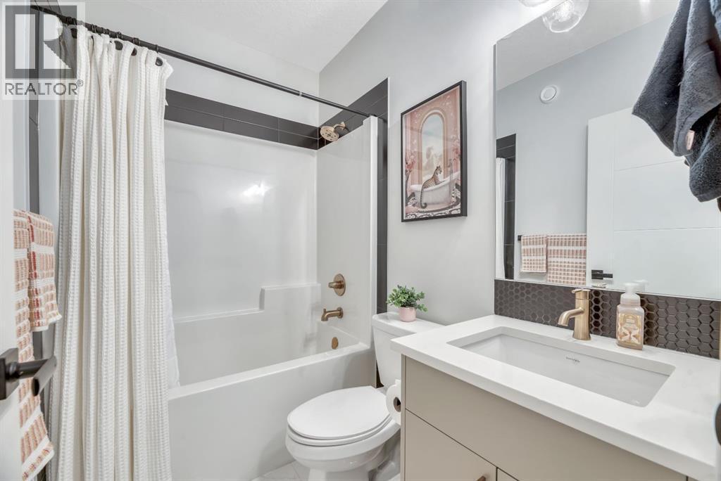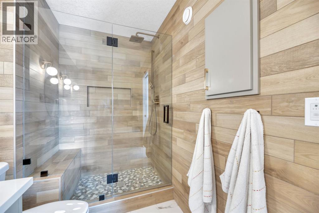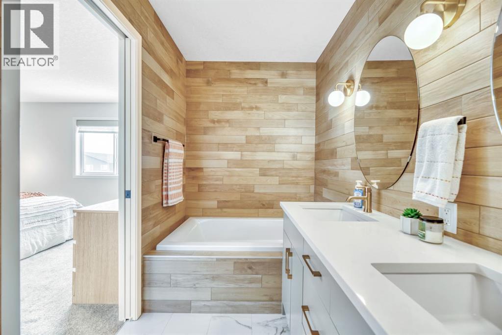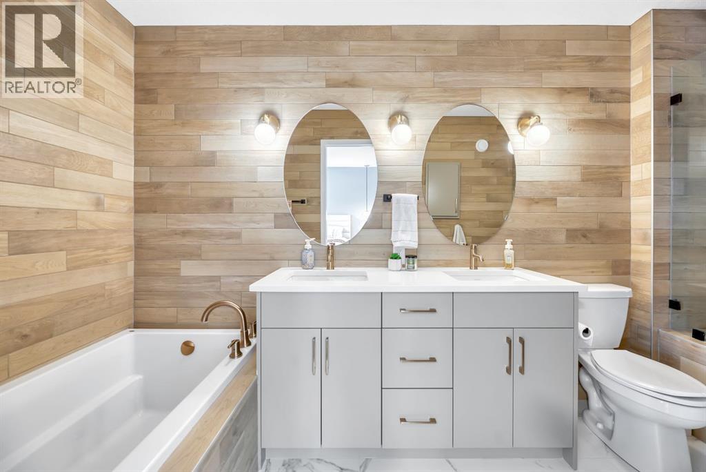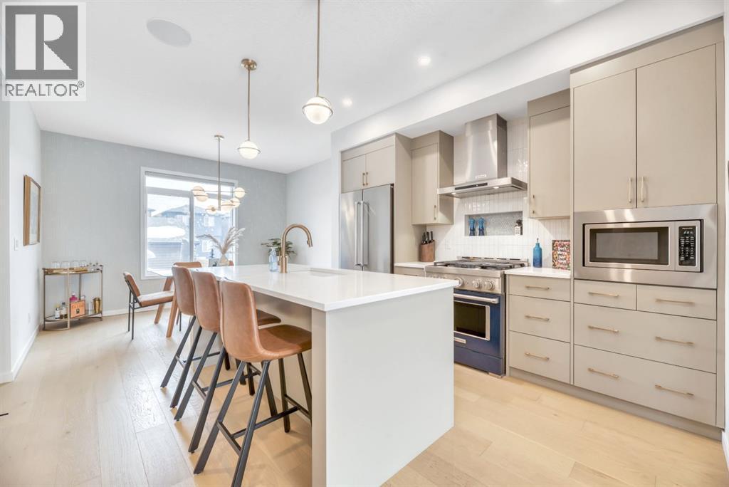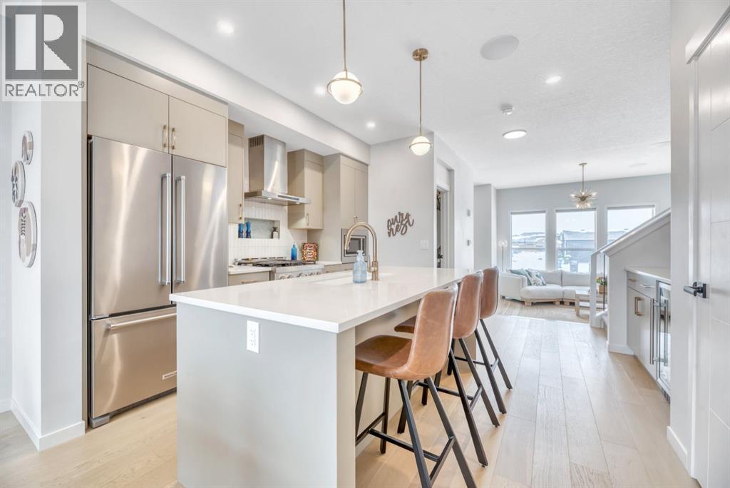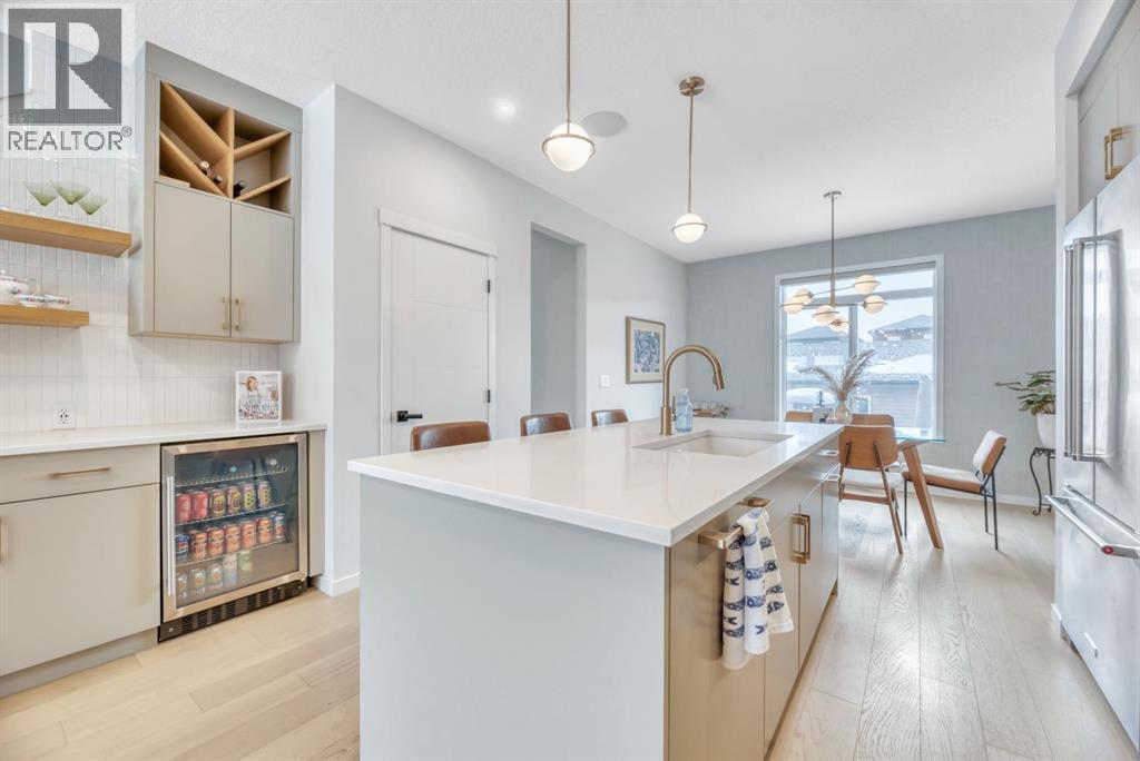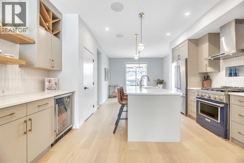 **OPEN HOUSE SUNDAY MAR 8 from 2-4pm**Welcome to an exceptional, fully upgraded Morrison-built residence in the community of Wolf Willow, ideally located steps from Fish Creek Park, scenic pathways, and the Woof Willow dog park. Offering over 2,200 sq. ft. of impeccably finished living space, this home delivers sophisticated design, premium finishes, and a lifestyle rarely found at this price point. Inside, a tiled front entryway sets the tone for the refined interiors, complemented by abundant natural light from numerous oversized, upgraded windows, all dressed with Hunter Douglas light-enhancing sheer shades. The main floor features 9-foot ceilings, with the living room elevated to 10 feet, anchored by a striking floor-to-ceiling tiled fireplace finished with a custom natural oak mantle. Designed with entertaining in mind, the main level includes built-in ceiling speakers throughout, a statement custom dry bar with integrated beverage fridge, oak floating shelves, and an oak wine rack. The chef’s kitchen is both elegant and functional, showcasing KitchenAid appliances, including a smart commercial-style gas range in ink-blue, paneled dishwasher, an impressive 7-foot island, and upgraded white quartz countertops throughout the entire home. White oak engineered hardwood flooring adds warmth and timeless appeal. A designer powder room with moody wallpaper, smart-home Lutron lighting controls throughout, and a generous mudroom with tile flooring, built-in shelving, and shoe storage complete the main level. Upstairs, the primary suite offers a true spa-inspired ensuite, fully tiled in wood-look porcelain with timeless sconce lighting, an oversized soaker tub, and a tiled shower featuring a bench and slide-bar hand shower. Secondary bedrooms are generously proportioned and include custom closet systems. A spacious main bathroom provides abundant storage, while the upgraded upper-level laundry includes premium washer and dryer with additional built-in shelving. The fully developed, purpose-built basement with projector is a private entertainment retreat, professionally wired for 15 speakers, creating an immersive home theatre experience. This level also includes a fourth bedroom with 9-foot ceilings and natural light, along with a full third bathroom, ideal for guests or multigenerational living. The south-facing, professionally landscaped backyard provides a private outdoor retreat designed for both entertaining and everyday enjoyment. Features include a modern stone patio (15ft. x 18ft.), a stone walkway (4ft. x 13ft.) leading to the double detached garage, washed rock dog run, and curated mulch garden beds. The double detached garage offers additional storage capacity without compromising functionality. Refined, turnkey, and meticulously upgraded, this Wolf Willow residence offers luxury living with immediate access to Calgary’s most iconic green spaces — a rare opportunity to own a home where design, lifestyle, and location converge. (id:6769