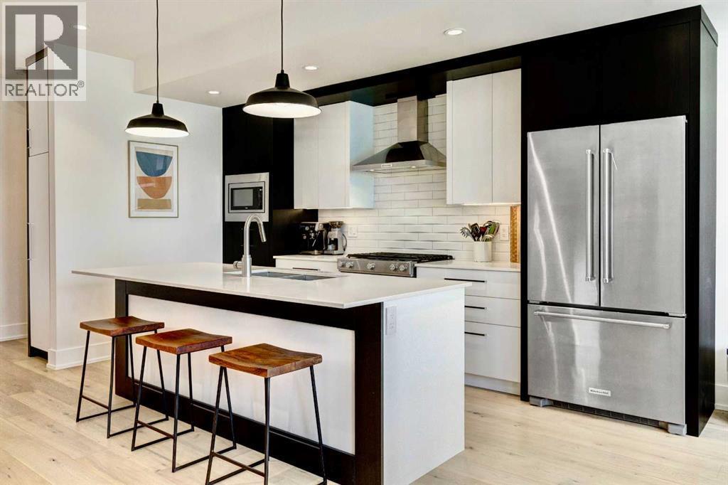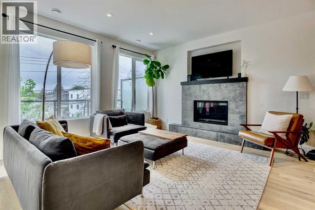 Located in the heart of Marda Loop, this oversized townhome offers 2,242 sq ft of thoughtfully designed living space, with room sizes and a layout rarely found in the area and comparable to many duplex and infill homes. Enjoy a walkable inner-city lifestyle close to shops, restaurants, parks, top schools, and Sandy Beach Dog Park, with an easy commute downtown. The open-concept main floor features a well-appointed kitchen with quartz countertops, a gas range, Bosch dishwasher, dark walnut cabinetry, and engineered white oak hardwood floors. A dedicated dining area flows into an impressive living room with large south-facing windows & a fireplace, creating a bright, welcoming space for everyday living and entertaining. An oversized deck extends the living space outdoors. A main-floor bedroom with a private deck offers excellent flexibility and can also be used as a home office, gym or guest room. Upstairs, the spacious primary suite features a private balcony, a walk-in closet with skylight and built-ins, and a well-finished ensuite with heated floors, double sinks, a soaker tub, and an oversized shower. Two additional bedrooms, a full bath, and a convenient upper laundry complete the upper level. The entry level provides ample storage and low-maintenance inner-city living in one of Calgary’s most desirable neighbourhoods. (id:6769