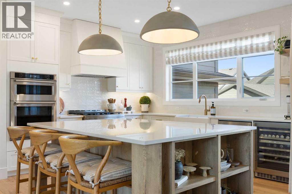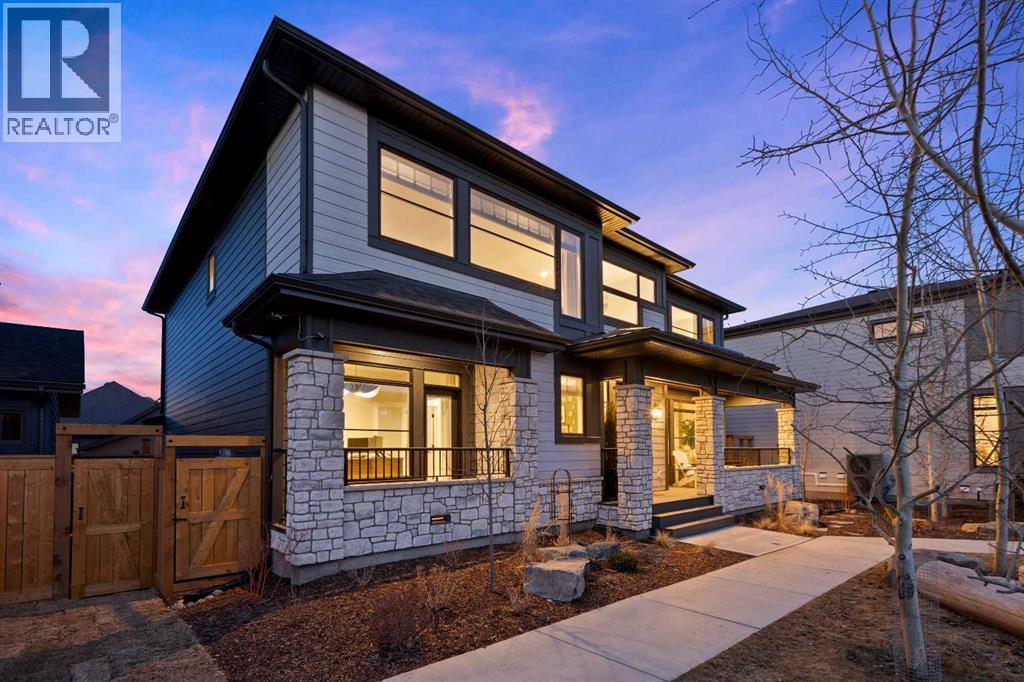 Welcome to this exceptional executive family home, perfectly positioned on one of the premier wide lots in the vibrant and thoughtfully designed community of Alpine Park, facing directly onto Orchard Green, a beautiful park featuring fruit trees, open play spaces, a community garden, and a Harvest Table for gatherings and picnics, offering a rare combination of privacy, scenery, and lifestyle. Set on an impressive 60 ft wide lot, the property enjoys peaceful park views from the front deck, living room, family room, and primary bedroom, with mature trees providing natural privacy, and offers over 3,600 sq ft of developed living space across three levels, showcasing outstanding craftsmanship and upgrades throughout while presenting like a builder’s showhome with the warmth and functionality of a true family home. Upon entry, you are immediately struck by the attention to detail and thoughtful design, with a bright main floor living room featuring large south-facing windows and a stunning floor-to-ceiling stone gas fireplace, flowing seamlessly into the heart of the home, a beautifully appointed kitchen with crisp white cabinetry, large island, stainless steel appliances, built-in oven, expansive north-facing window, and walk-in pantry. The spacious dining area is ideal for hosting large gatherings and features sliding patio doors leading to the upper deck and landscaped, fenced yard, along with a shaded lower patio perfect for summer relaxation. A stylish two-piece powder room and generous home office with park views and private deck access provide both convenience and versatility, while a custom-designed mudroom with closet and bench with lift-up storage completes the main level. The second level is a private retreat featuring a spacious family room with large park-facing windows, a unique bridge leading to the primary suite with expansive south-facing windows and a sliding barn door into the luxurious ensuite with dual vanities, large walk-in shower with dual shower heads, and elegant soaker tub. The custom walk-in closet connects to a well-appointed laundry room with folding counter and built-in sink, while two additional generously sized bedrooms and a five-piece main bathroom complete this level. The fully developed basement offers excellent additional living space with a large rec room ideal for teens, guests, or movie nights, a fourth bedroom, and a four-piece bathroom, plus rough-in plumbing for a future wet bar and an oversized utility and storage area for exceptional organization. The double attached garage is oversized in height, allowing for the potential addition of a vehicle lift or extra storage. Facing directly onto parkland, this home offers a quiet, traffic-free setting where you can relax on the front deck, enjoy your favorite beverage, and watch children play, delivering the perfect balance of luxury, comfort, and community-focused living in one of Calgary’s most exciting new neighbourhoods. (id:6769