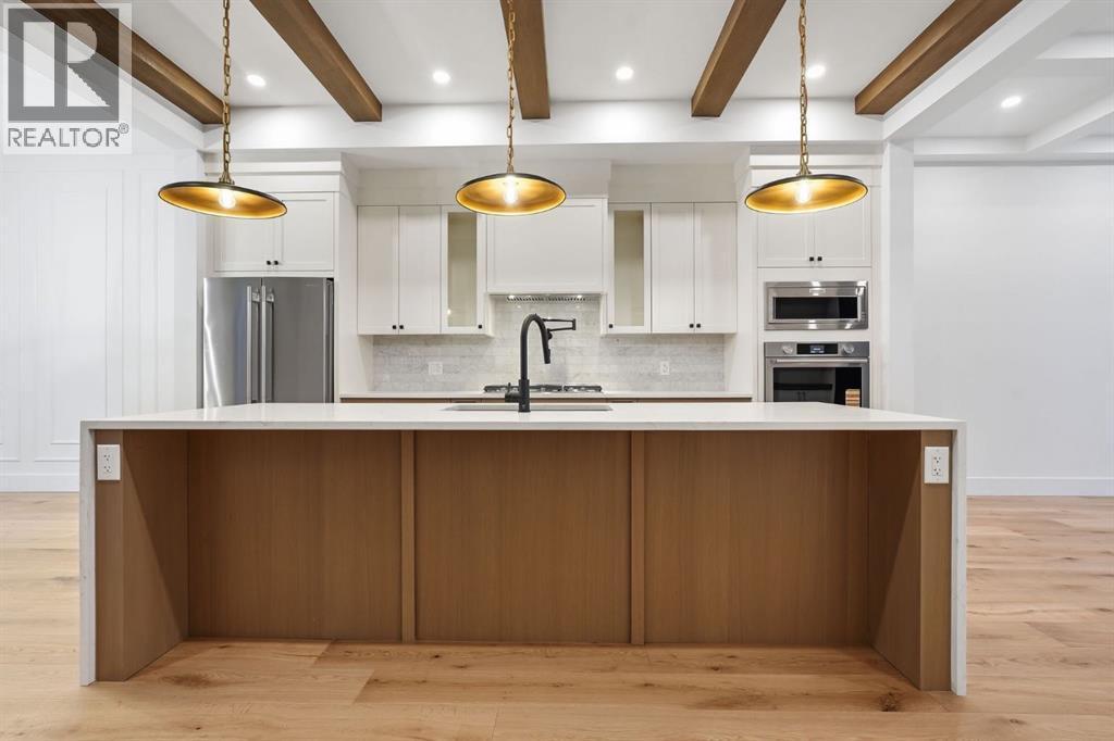 Welcome to this beautifully crafted new infill offering 6 bedrooms and 3.5 bathrooms across three fully developed levels, including a rare legal 3-bedroom basement suite. Out front features a large poured concrete patio to enjoy your morning coffee. Thoughtfully designed for growing families & multigenerational living, this home combines high-end finishings with exceptional functionality. With 9-foot ceilings on every level — including the basement —, a vaulted primary retreat, wide plank engineered hardwood throughout, & extensive custom built-ins on all levels, this property delivers luxury & flexibility. The legal suite offers outstanding versatility — ideal for older children, aging parents, or as a strong rental opportunity with potential income in the $2,000/month range.The main level features a bright open-concept layout enhanced by coffered ceilings in the living room & faux wood beams in the kitchen. The designer kitchen showcases two-tone cabinetry with oak lowers and white uppers, a massive quartz waterfall island, professional appliances, gas cooktop with a pot-filler &+ built-in wall oven & microwave. Custom built-ins elevate the front entry, mudroom, & living room. the large patio doors lead to a spacious west-facing deck, perfect for evening sun. Gorgeous wide plank engineered hardwood flows seamlessly throughout all 3 floors.Upstairs offers three spacious bedrooms, including a stunning primary suite with vaulted ceilings. The spa-inspired ensuite features a huge walk-in shower with rain head & body jets, steam rough-in, deep soaker tub, & heated tile floors. Large primary walk-in closet with custom cabinets with drawers, shelving & hanging rods + a full mirror soon to be installed. A full bathroom serves the secondary bedrooms, one of which includes its own walk-in closet. The oversized walk-in laundry room is thoughtfully designed with quartz folding counter, pre-wash sink, hanging rod + ample cabinetry.The fully legal lower suite has a private s ide entrance & was built with an expanded foundation beneath the deck to accommodate three well-sized bedrooms with large egress windows. Finished to the same quality as the main level, it includes custom built-ins, a modern kitchen with quartz island seating for 2–3, full stainless steel appliance package, spacious bathroom with additional storage, & a built-in entertainment unit. Separate high-efficiency furnace for up & down. Situated in the desirable southwest community of Glenbrook in Calgary, this home is surrounded by convenience. Multiple public, Catholic, and French immersion elementary schools are within a few minuted, + a public junior high school. You’ll enjoy easy access to numerous parks, playgrounds, & several nearby shopping areas, making daily errands effortless while maintaining the charm of an established, family-friendly neighbourhood. (id:6769