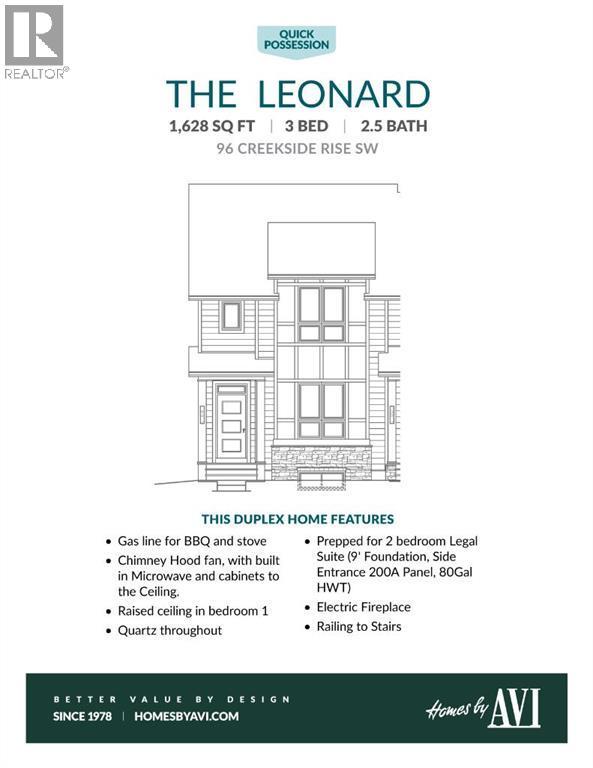 Sirocco at Pine Creek is ONE OF THOSE SOUTHWEST COMMUNITIES THAT FEELS LIKE YOU’RE SLIGHTLY REMOVED FROM THE NOISE — perched near Sirocco Golf Club, threaded with pathways, and still close enough to Shawnessy and major routes that daily life stays easy. It’s calm without being isolated. And that balance matters.Now let’s talk about THE HOUSE.This MOVE-IN READY Leonard offers 1,628 square feet, three bedrooms, 2.5 baths, and a layout that actually understands how people live. There’s a POCKET OFFICE ON THE MAIN FLOOR — not an afterthought, not a desk squeezed into a hallway — but a real, defined workspace that keeps your dining table from becoming mission control. The kitchen delivers the upgrades you want upfront: QUARTZ COUNTERTOPS, 48" UPPER CABINETS, A CHIMNEY HOOD FAN, BUILT-IN MICROWAVE, and cabinetry that stretches with intention. The living room is anchored by a clean 50” ELECTRIC FIREPLACE FEATURE WALL, keeping the space modern and uncomplicated.Upstairs, a CENTRAL BONUS ROOM gives you flexibility — movie nights, a reading nook, a place for kids to orbit without taking over the entire house. Laundry is up where it belongs. No hauling baskets up and down stairs like it’s 2003.And here’s where this one gets strategic. The unfinished basement isn’t just empty square footage — it’s already built for what comes next. With 9-foot foundation walls, a separate side entrance, an 80-GALLON HOT WATER TANK, and PLUMBING ROUGH-INS IN PLACE for a future bathroom, laundry, and full kitchen setup (including sink and dishwasher), the groundwork is done. Large 5’ x 2’ egress windows at both the front and rear bring in natural light, so if you decide to build out a secondary living area (subject to approvals and permitting), it won’t feel like an afterthought — it will feel intentional.Out back, the rear deck gives you that everyday outdoor extension — morning coffee, late dinners, a bit of breathing room — while the rear gravel parking pad off the lane keeps things simple and functional, ready for whatever your next phase looks like.If you’ve been looking for your first home but thinking longer than five years ahead, this is the kind of property that grows with you instead of boxing you in. Go ahead and tell your agent you’d like to see this one in person.• PLEASE NOTE: Photos are of a DIFFERENT Spec Home of the same model – fit and finish may differ. Interior selections and floorplans shown in photos. Kitchen appliances are included, and will be installed at possession. (id:6769