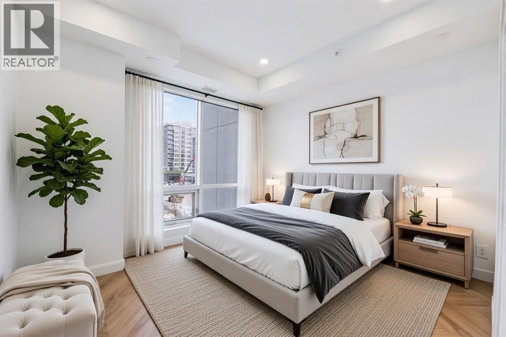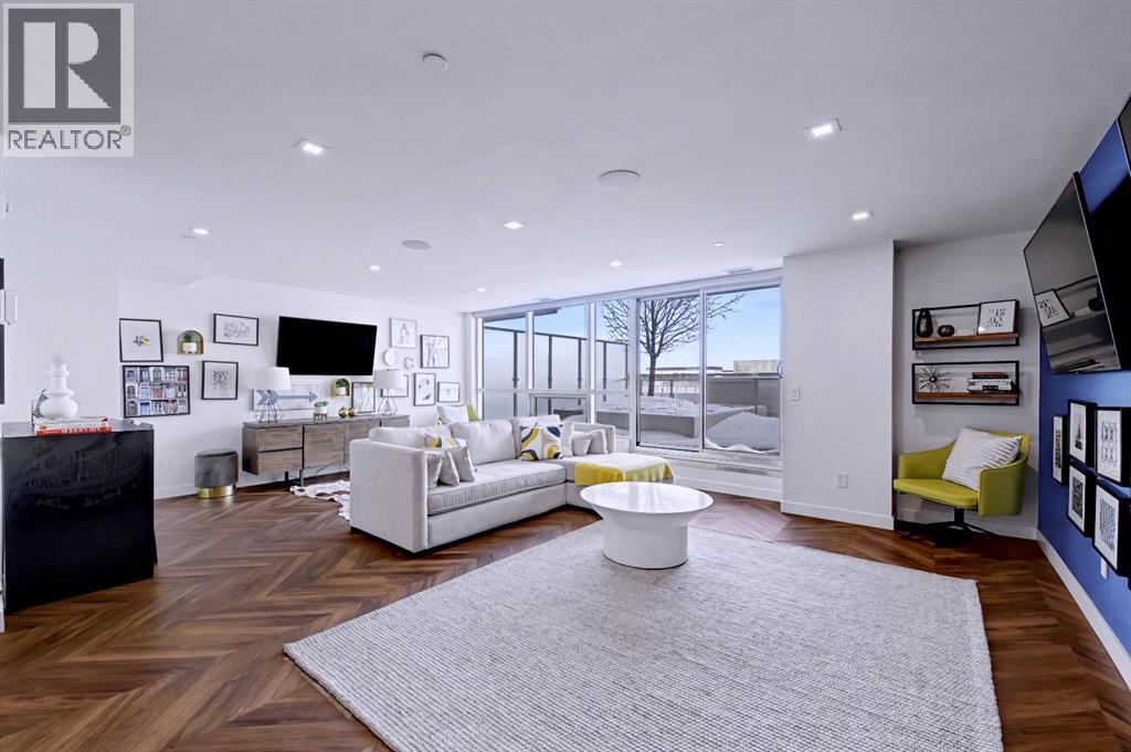 Welcome to unit 303, 8505 Broadcast Ave at the Gateway in West Springs. . Where elevated design meets everyday comfort in this beautifully crafted 2 Bed, 2 Bath condo with dedicated office space and additional storage. Located within one of Calgary’s most sought-after master-planned communities, this home delivers a refined living experience from the moment you step inside.You’re immediately greeted by soaring ceilings and striking chevron patterned wide plank luxury flooring that sets the tone for the sophisticated interior. The designer kitchen is a true showpiece, finished in a stunning super matte palette and accented with brushed gold hardware. Culinary enthusiasts will appreciate the premium appliance package, including a panelled 36” integrated Fisher & Paykel refrigerator, panelled dishwasher, gas cooktop, and built-in wall oven. Custom soft-close cabinetry, under-cabinet lighting, and quartz countertops paired with a full height quartz backsplash complete the upscale aesthetic.Expansive windows and a large sliding patio door flood the space with natural light while showcasing Calgary’s iconic big sky views. Step outside to a generously sized balcony with ample room for outdoor seating and dining, perfect for relaxing or entertaining.The spacious primary bedroom easily accommodates larger furnishings and features a walk-through closet that leads to a beautifully appointed ensuite with a separate oversized shower, quartz counters, and elegant flooring. The second bedroom is also well proportioned and located near the stylish four-piece main bath, complete with a deep soaker tub, quartz counters, and custom finishes. A convenient in-suite laundry room adds to the functionality of the home.Residents of Gateway enjoy exceptional amenities, including an Owner’s Lounge on the same level, a heated underground parkade with one titled parking stall and electric vehicle charging stations, and energy-efficient construction with advanced mechanical systems. The building also features a rooftop patio, social room, secure bike storage, main floor concierge service, and vibrant ground-level retail including restaurants, shops, and health and wellness studios.Families will appreciate being just steps from Calgary French & International School and only minutes to respected institutions such as Webber Academy, Rundle College, and Ernest Manning High School. With quick access to Stoney Trail, commuting is seamless and weekend escapes are effortless. (id:6769