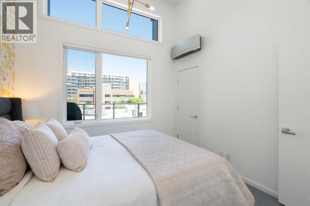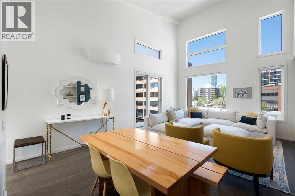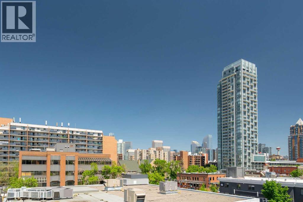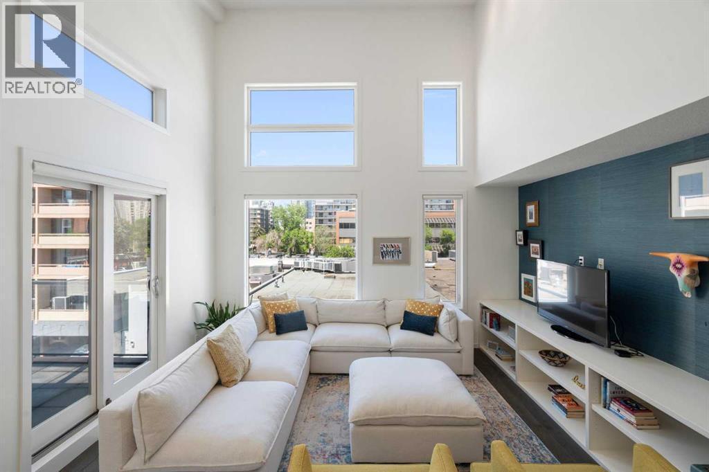 Welcome to The Block, one of Calgary’s most architecturally distinctive communities just off vibrant 17th Avenue. Designed by Sturgess Architecture and built by Avi Urban, this boutique development is known for its rare private courtyard concept — each residence opens directly to the outdoors, creating a sense of community, privacy, and independence that’s truly unmatched in the downtown core.This top-floor penthouse loft is one of the most desirable suites in the complex. Soaring 14’ vaulted ceilings and hardwood floors throughout create an airy, dramatic living space, while massive windows flood the home with natural light. A custom wall of built-ins anchors the living room with both style and functionality. The sleek kitchen features stainless steel appliances, lacquered cabinetry, and generous storage — perfect for both everyday living and entertaining. Step out onto your private deck with city views, complete with gas access for easy BBQ evenings. The spacious primary bedroom offers large windows and convenient access to a beautifully appointed bathroom with walk-in glass shower and modern vanity. The second bedroom is thoughtfully designed with a full wall of built-in storage, making it ideal for guests, a home office, or both. Complete with titled parking, additional storage, built-in laundry, and air conditioning, this is effortless urban living at its finest. Now offered at a significantly improved price, this penthouse represents outstanding value in one of Calgary’s most dynamic inner-city locations. Don’t miss your opportunity to experience The Block at its very best. (id:6769