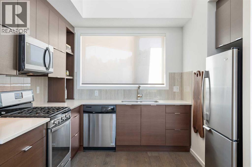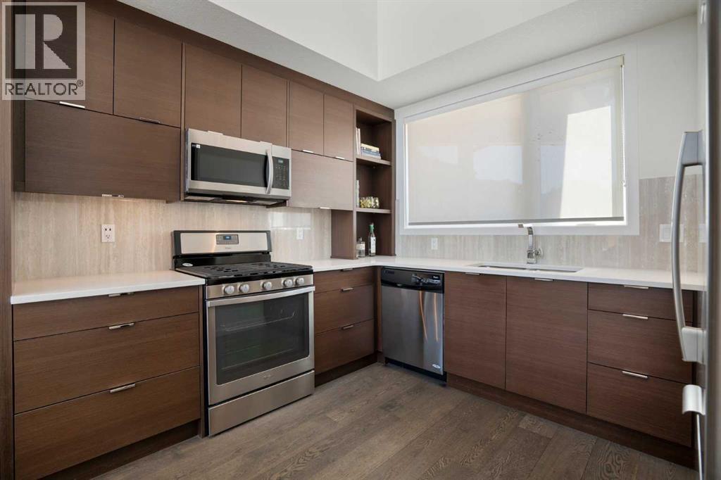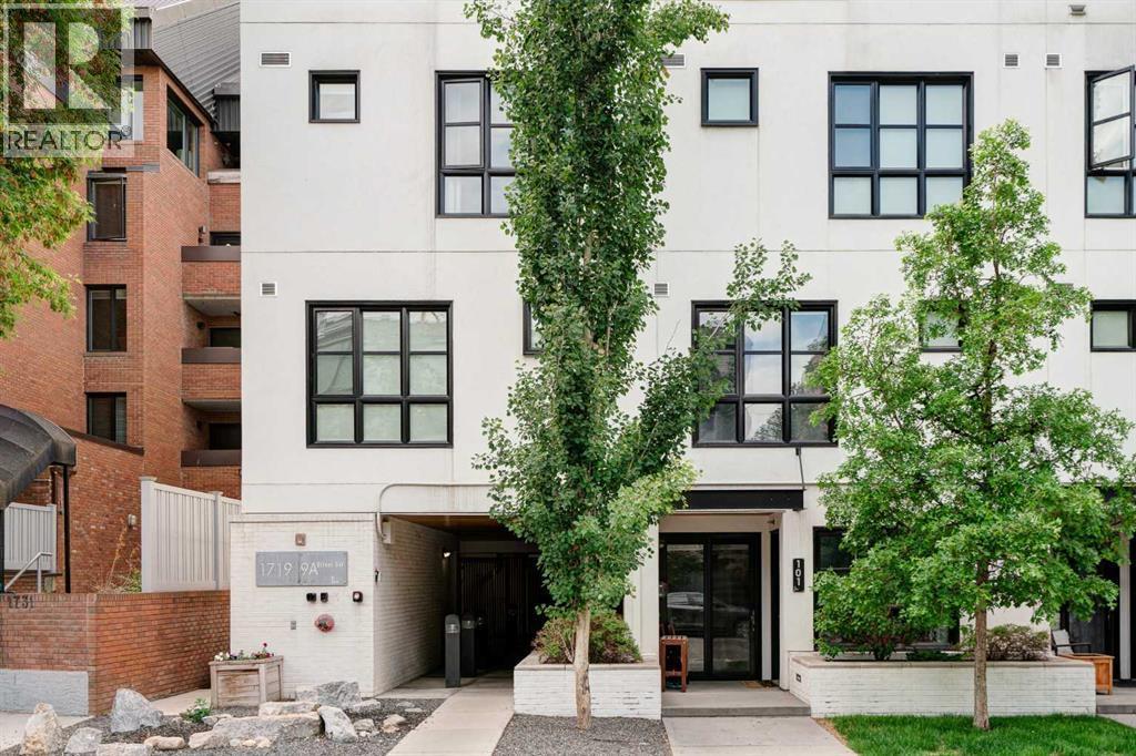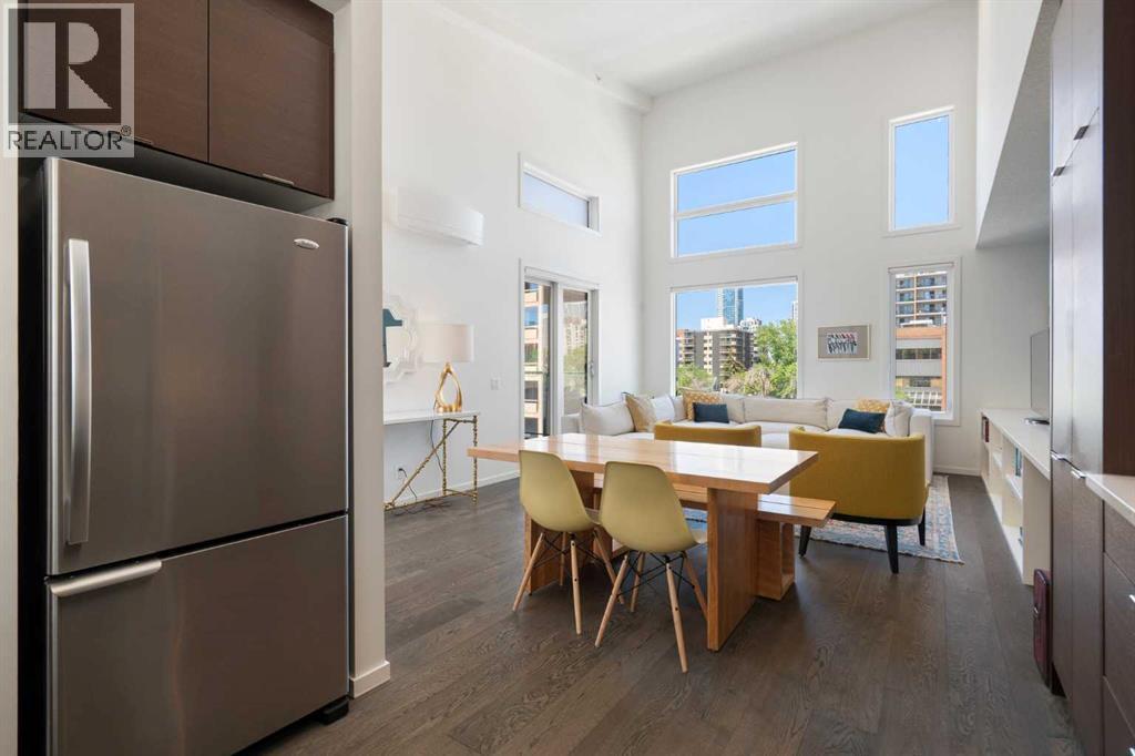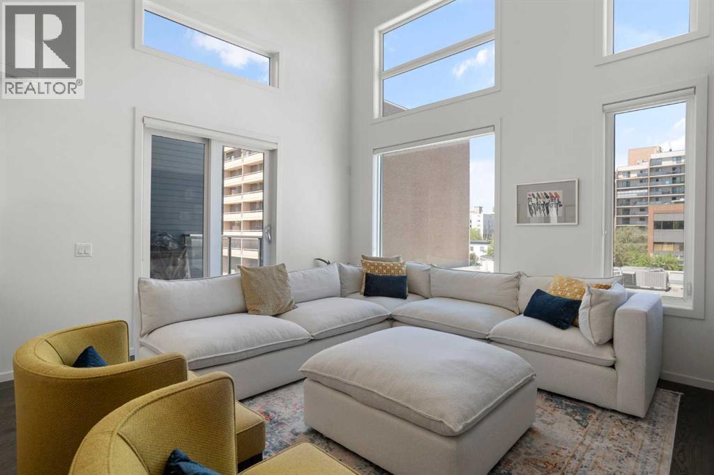 Welcome to The Block, one of Calgary’s most architecturally distinctive communities just off vibrant 17th Avenue. Designed by Sturgess Architecture and built by Avi Urban, this boutique development is known for its rare private courtyard concept — each residence opens directly to the outdoors, creating a sense of community, privacy, and independence that’s truly unmatched in the downtown core.This top-floor penthouse loft is one of the most desirable suites in the complex. Soaring 14’ vaulted ceilings and hardwood floors throughout create an airy, dramatic living space, while massive windows flood the home with natural light. A custom wall of built-ins anchors the living room with both style and functionality. The sleek kitchen features stainless steel appliances, lacquered cabinetry, and generous storage — perfect for both everyday living and entertaining. Step out onto your private deck with city views, complete with gas access for easy BBQ evenings. The spacious primary bedroom offers large windows and convenient access to a beautifully appointed bathroom with walk-in glass shower and modern vanity. The second bedroom is thoughtfully designed with a full wall of built-in storage, making it ideal for guests, a home office, or both. Complete with titled parking, additional storage, built-in laundry, and air conditioning, this is effortless urban living at its finest. Now offered at a significantly improved price, this penthouse represents outstanding value in one of Calgary’s most dynamic inner-city locations. Don’t miss your opportunity to experience The Block at its very best. (id:6769