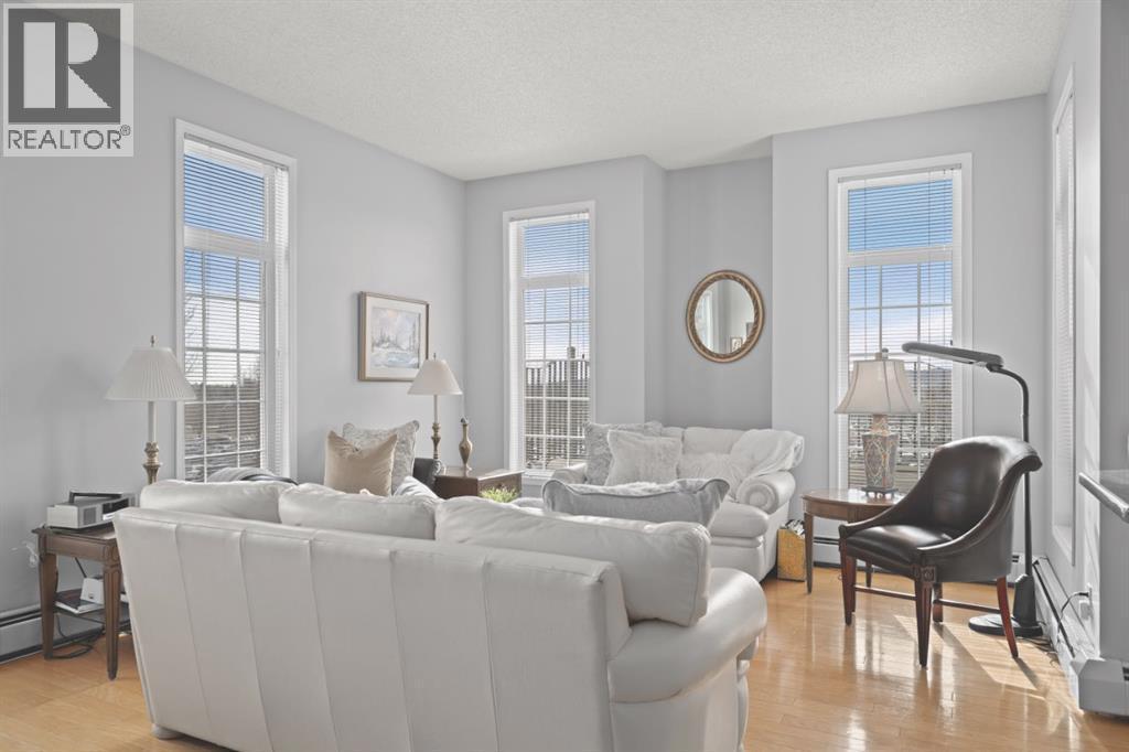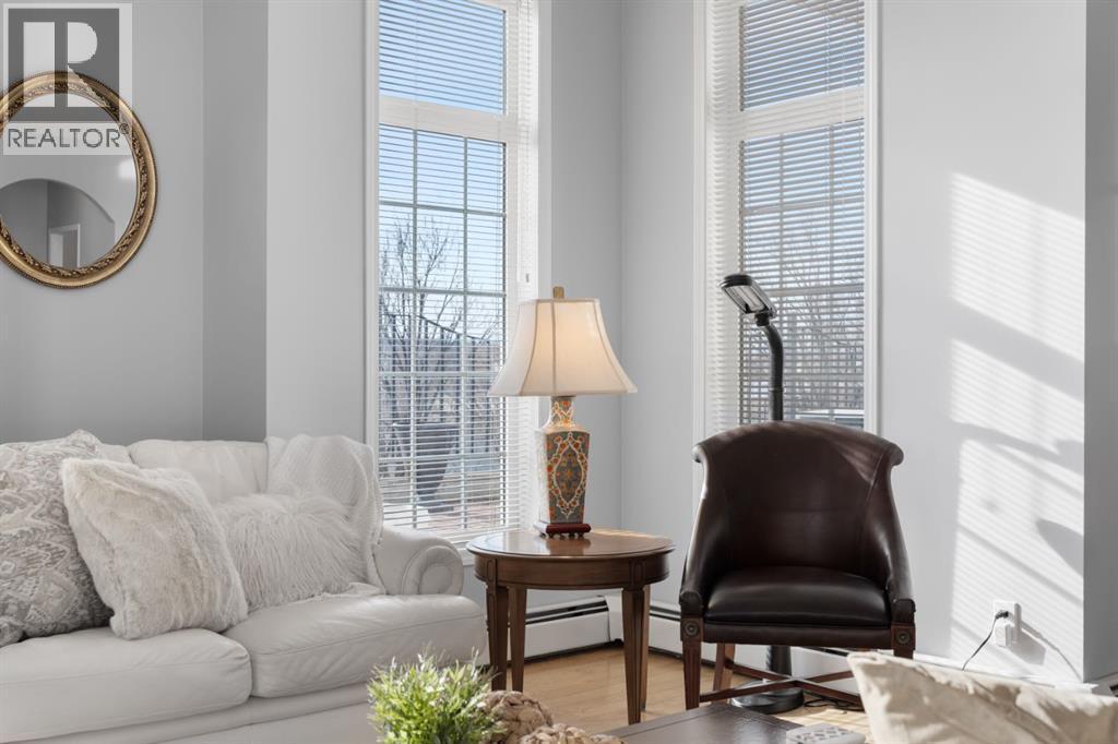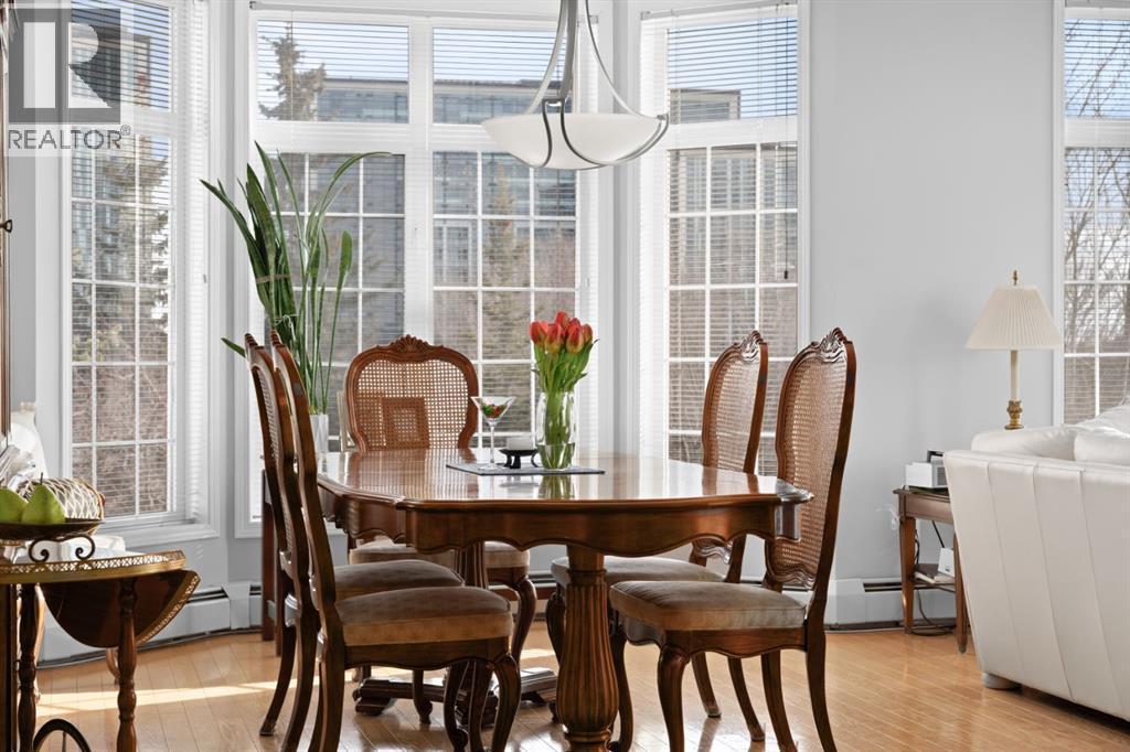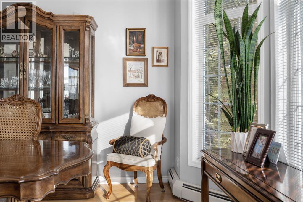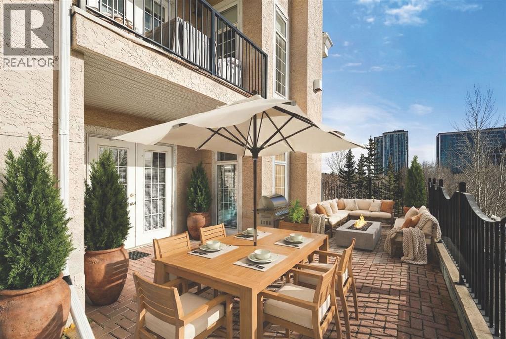 Welcome to this rare offering in the highly sought-after Gallery building in desirable Dalhousie. Conveniently located on the main floor but with a beautiful patio that sits well above ground level, this exceptional end unit combines privacy, elegance and everyday comfort in an exclusive 18+ building with only 16 residences. From the moment you step inside, the building sets the tone with its luxurious feel, sweeping curved staircase and tasteful decor. The unit itself has a private foyer and opens to a bright and airy 1,216 sq. ft. layout enhanced by large windows, tall ceilings and an abundance of natural light. The kitchen is designed for both function and connection, featuring a generous island with seating, granite countertops, stainless steel appliances and ample counter space. The kitchen flows flows beautifully into the spacious dining area, which can easily accommodate sizeable gatherings. The living room invites relaxed, elegant comfort and frames the stunning outdoor views. The true showstopper is the massive patio, large enough for two distinct seating areas. Take in views of the mountains while enjoying your morning coffee, summer al fresco dining or a peaceful evening unwind. It is a rare outdoor space that genuinely extends your living area. The condo offers two spacious bedrooms, including a large primary retreat complete with a walk-in closet, additional linen storage and ensuite featuring a soaking tub and separate shower. The second bedroom is perfectly suited as a guest room or home office and is conveniently located near the additional two-piece bathroom, where you will also find in-suite laundry and another linen closet. Storage is exceptional throughout - there is a dedicated storage room at the front of the unit ideal for a freezer or pantry overflow, plus an impressive 6’ x 12’ (approx) storage room in the underground parkade located directly in front of your oversized titled parking stall. The building welcomes your pets (a small dog or cat ) and is situated just steps from Dalhousie Station, with convenient access to shopping, restaurants and a Safeway grocery store. The Dalhousie LRT Station and central bus hub are a short walk away, with an additional bus stop located right outside the building. For those who enjoy walking or biking, numerous nearby pathways make it easy to stay active and connected to nature. Well managed with a highly attentive board, this low-density building offers a quiet, refined and friendly lifestyle, in an unbeatable location. Units here rarely come to market so don't miss the opportunity to call this exceptional condo home! (Please click on the link for the 3D Tour.) (id:6769