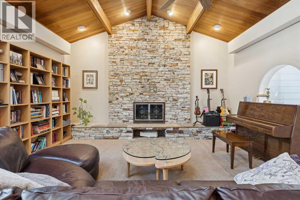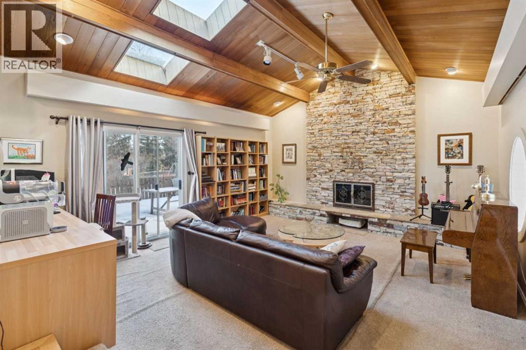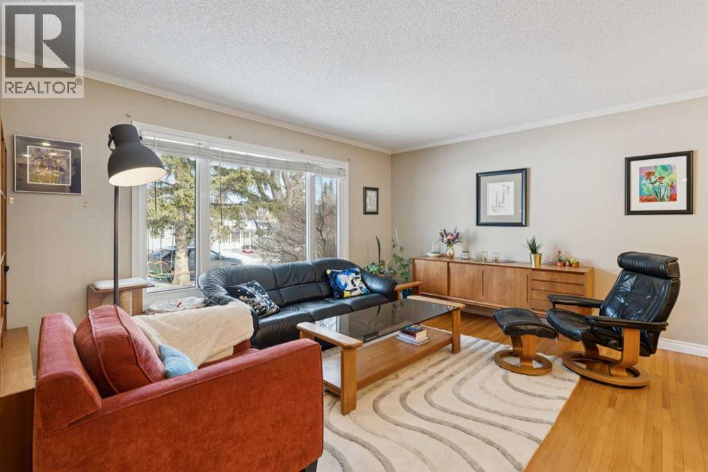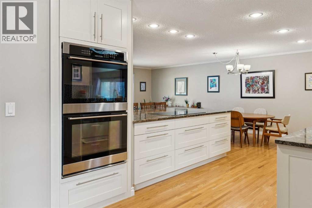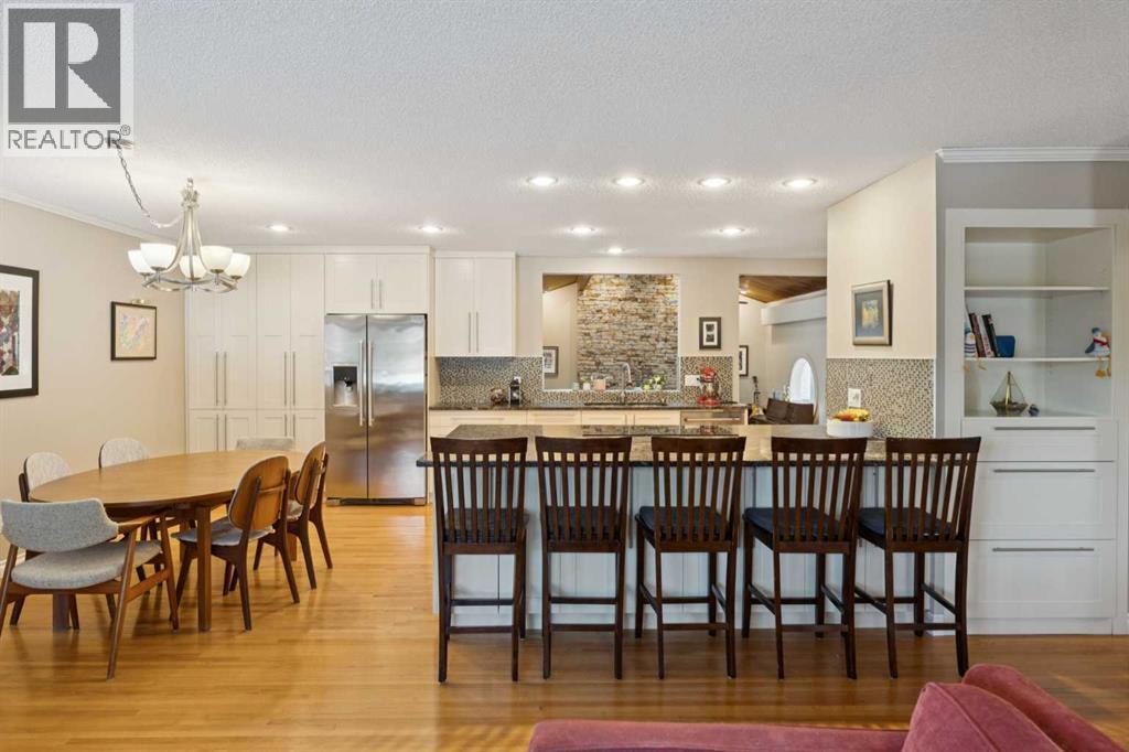 RARE FIND! Beautifully maintained and upgraded, this 3+2 bedroom bungalow offers 2,919 SF of developed living space featuring a 315 SF vaulted family room addition with open-beam ceiling and a striking floor-to-ceiling stone fireplace. A tremendous benefit to this reno was the ability to expand in to a custom kitchen (2010) that is absolutely stunning, showcasing an abundance of custom cabinetry, stone counters, breakfast bar and stainless steel appliances including double ovens making this kitchen a Chef’s dream. Additional highlights include hardwood floors which run through the main living areas and bedrooms, updated main bathroom (2017), modern interior finishing and large upgraded windows. The basement is finished with two additional bedrooms, a newer 4 piece bathroom, hobby/rec space, storage and laundry. Major exterior and mechanical updates include Hardie board siding (2019), new roof on both the house and garage (2019), central A/C (2018), hot water tank (2016), R40 insulation, and 90% window replacement. Situated on a large pie-shaped lot with a detached, oversized double garage (23'x21') and walking distance to Louis Riel School, community center, parks, and pathways—this is an exceptional opportunity to own a turnkey home in one of Calgary’s most established, family-friendly neighborhoods. (id:6769